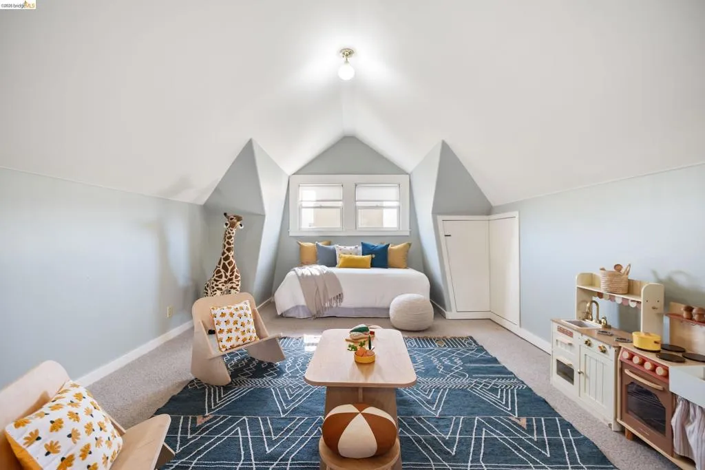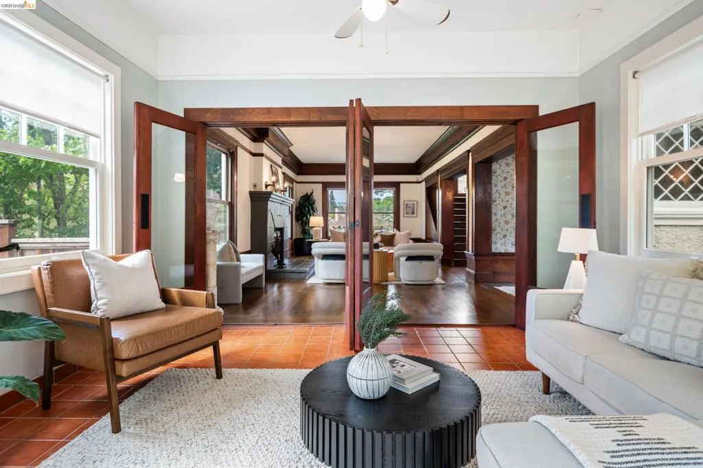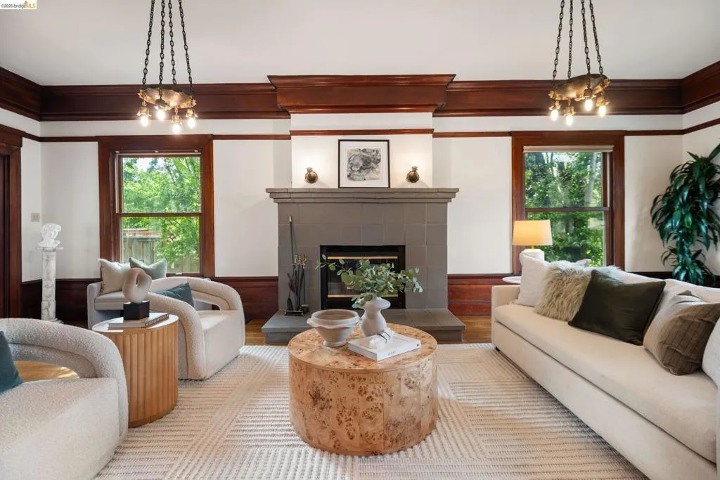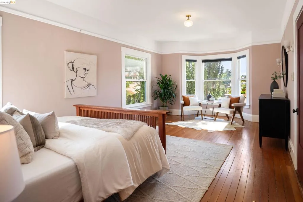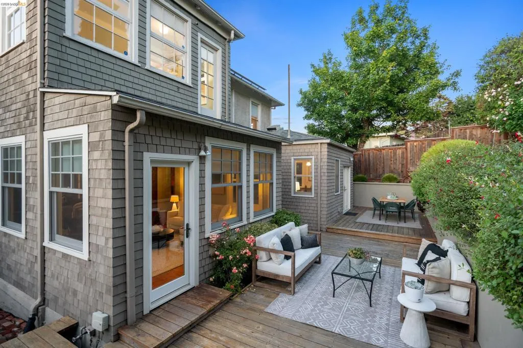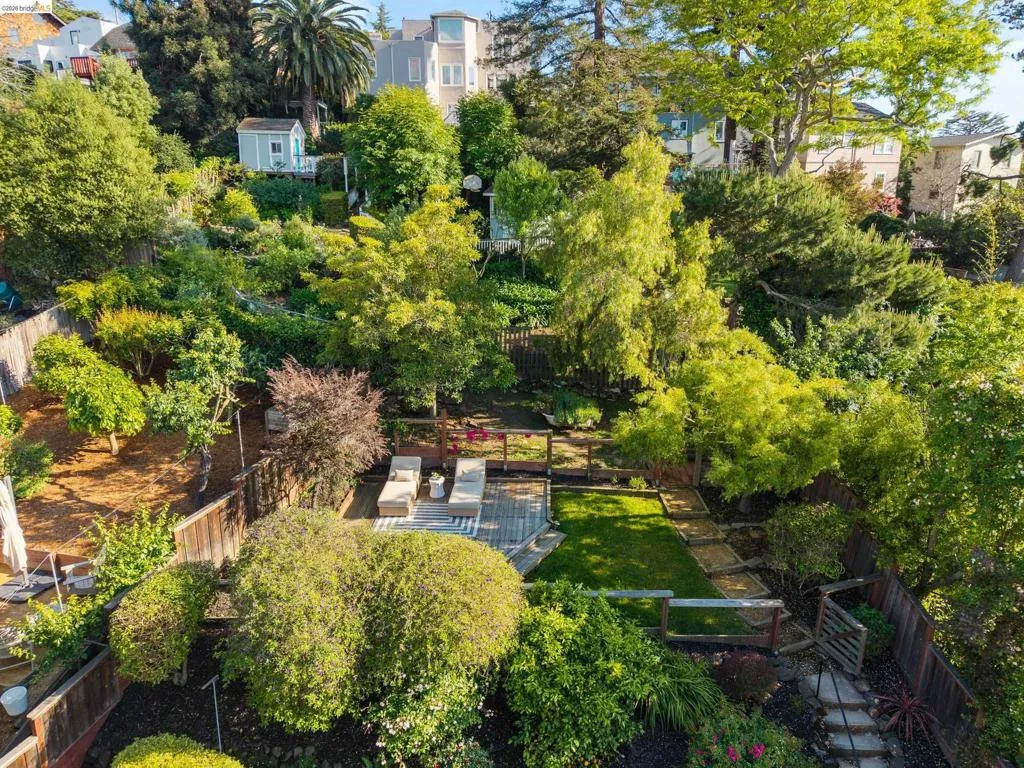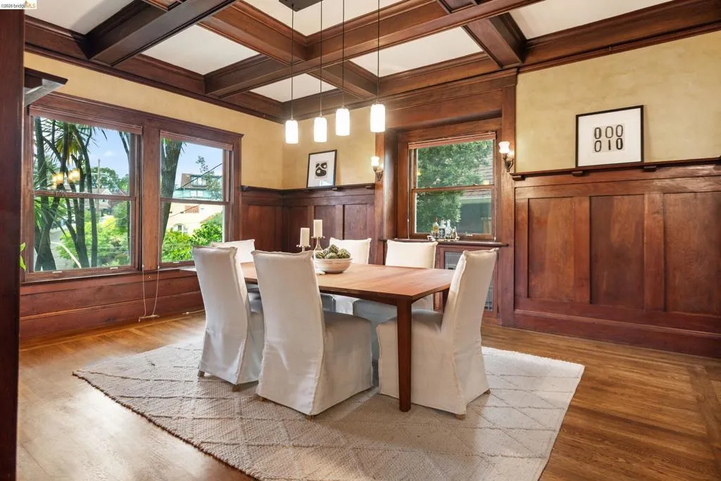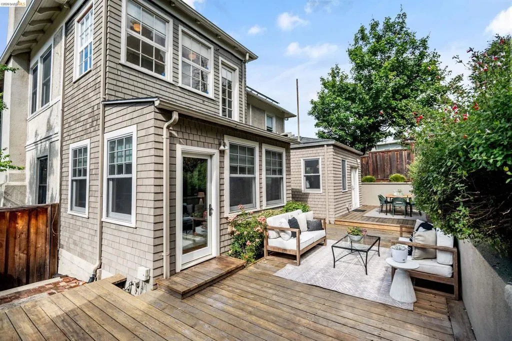 Rooted in the architectural grace of 1907, this distinguished residence at 3756 Balfour rises above the street with quiet majesty on its corner—a long-standing sentinel of the Lakeshore neighborhood. Moments from all that Lakeshore offers, the home blends heritage, scale, and lifestyle in one of Oakland’s most coveted enclaves. The formal living room features rich hardwood floors, a stately fireplace, and classic detailing, while a sunlit veranda opens to a spacious deck—ideal for outdoor dining and entertaining. The formal dining room showcases original pocket doors, a box-beamed ceiling, and built-in cabinetry, flowing into a custom eat-in kitchen with gas range, pantry, and breakfast nook. Terraced gardens provide versatile outdoor space for relaxation, gardening, or play. Upstairs, the primary suite offers a peaceful retreat with ample closet space, en suite bath, and adjoining bonus room suited for an office or nursery. Two additional bedrooms share a full hall bath. A finished attic adds flexible living space, and the basement includes storage, workshop area, and laundry. A rebuilt detached garage, owned solar, and mature landscaping complete this legacy home. With a Walkscore of 81, in a neighborhood celebrated for tree-lined streets, architectural beauty, and proximity to Lake Merritt, this property offers timeless character and room to grow.