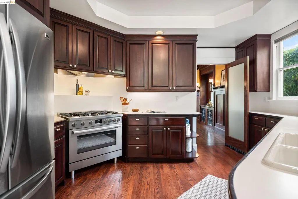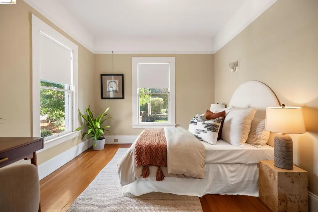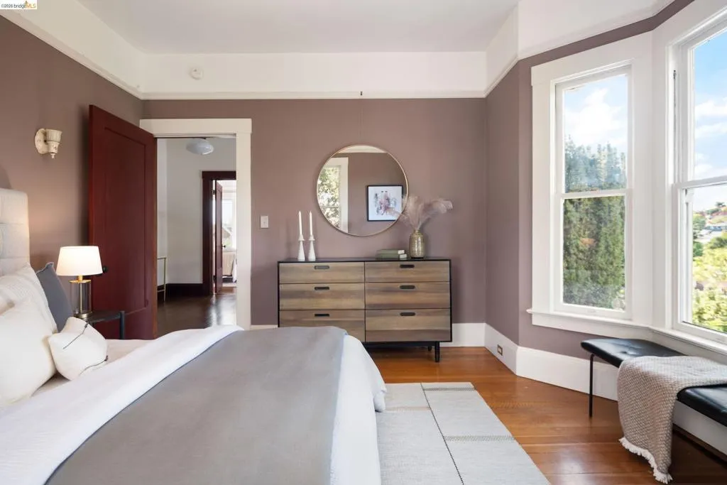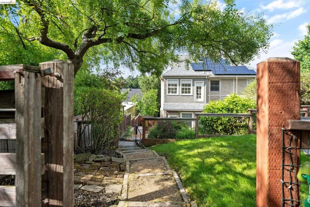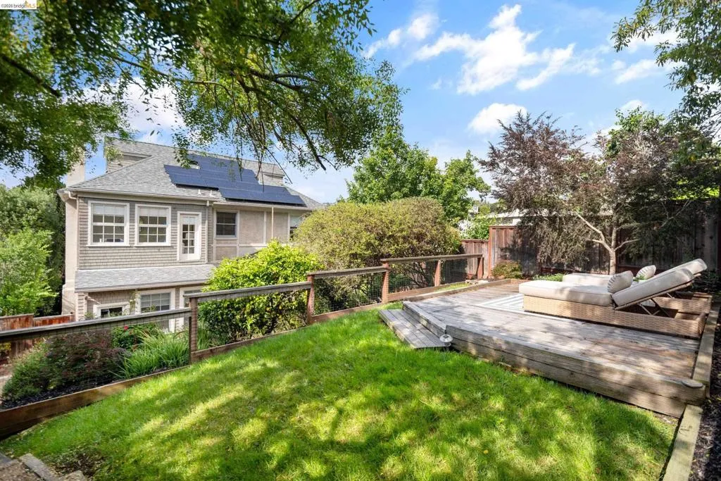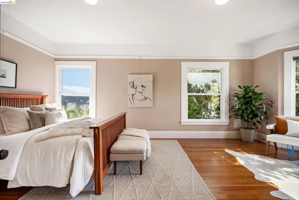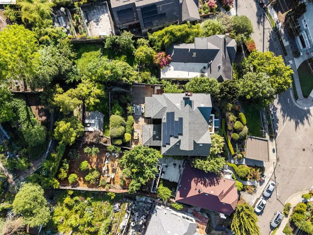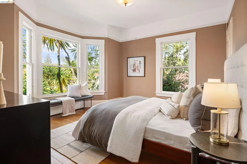 Rooted in the architectural grace of 1907, this distinguished residence at 3756 Balfour rises above the street with quiet majesty on its corner—a long-standing sentinel of the Lakeshore neighborhood. Moments from all that Lakeshore offers, the home blends heritage, scale, and lifestyle in one of Oakland’s most coveted enclaves. The formal living room features rich hardwood floors, a stately fireplace, and classic detailing, while a sunlit veranda opens to a spacious deck—ideal for outdoor dining and entertaining. The formal dining room showcases original pocket doors, a box-beamed ceiling, and built-in cabinetry, flowing into a custom eat-in kitchen with gas range, pantry, and breakfast nook. Terraced gardens provide versatile outdoor space for relaxation, gardening, or play. Upstairs, the primary suite offers a peaceful retreat with ample closet space, en suite bath, and adjoining bonus room suited for an office or nursery. Two additional bedrooms share a full hall bath. A finished attic adds flexible living space, and the basement includes storage, workshop area, and laundry. A rebuilt detached garage, owned solar, and mature landscaping complete this legacy home. With a Walkscore of 81, in a neighborhood celebrated for tree-lined streets, architectural beauty, and proximity to Lake Merritt, this property offers timeless character and room to grow.