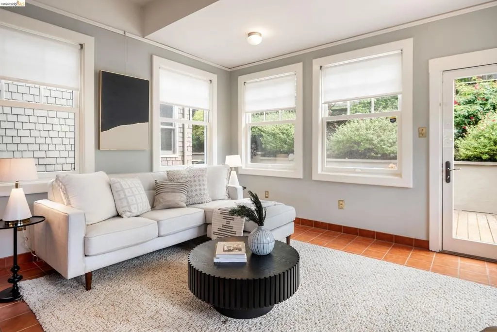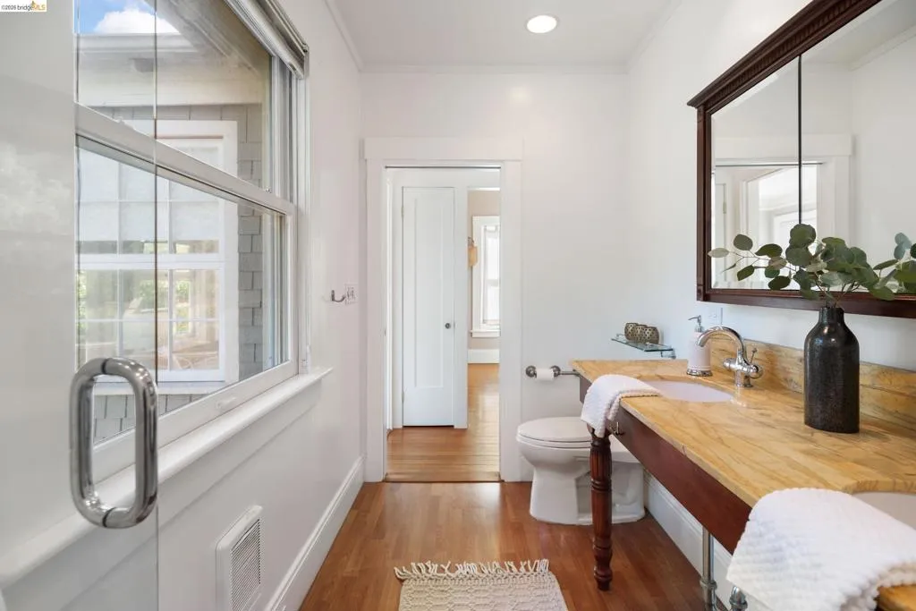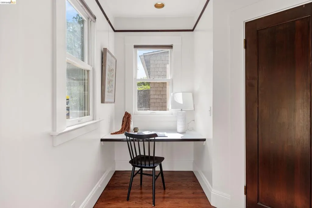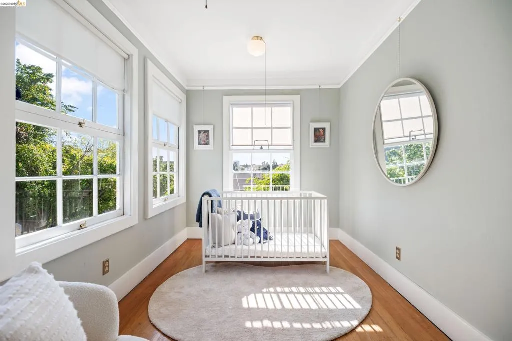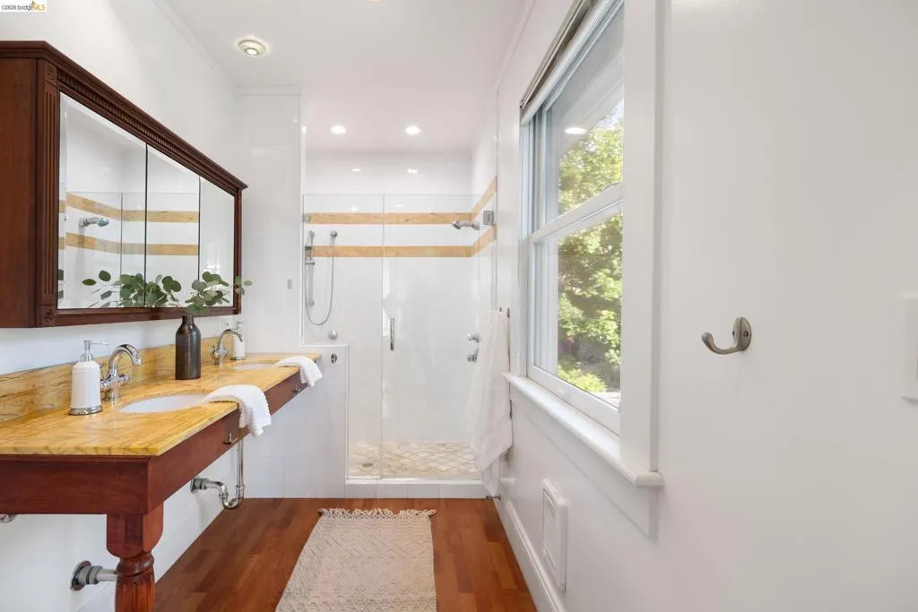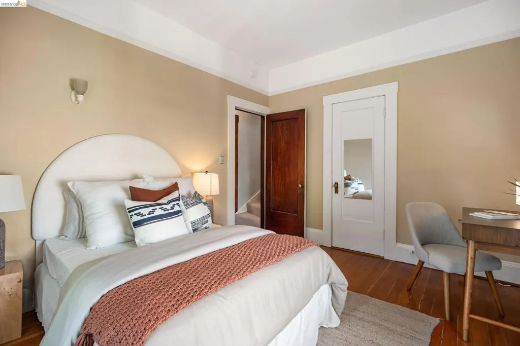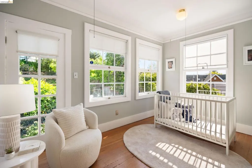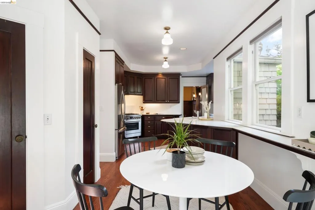 Rooted in the architectural grace of 1907, this distinguished residence at 3756 Balfour rises above the street with quiet majesty on its corner—a long-standing sentinel of the Lakeshore neighborhood. Moments from all that Lakeshore offers, the home blends heritage, scale, and lifestyle in one of Oakland’s most coveted enclaves. The formal living room features rich hardwood floors, a stately fireplace, and classic detailing, while a sunlit veranda opens to a spacious deck—ideal for outdoor dining and entertaining. The formal dining room showcases original pocket doors, a box-beamed ceiling, and built-in cabinetry, flowing into a custom eat-in kitchen with gas range, pantry, and breakfast nook. Terraced gardens provide versatile outdoor space for relaxation, gardening, or play. Upstairs, the primary suite offers a peaceful retreat with ample closet space, en suite bath, and adjoining bonus room suited for an office or nursery. Two additional bedrooms share a full hall bath. A finished attic adds flexible living space, and the basement includes storage, workshop area, and laundry. A rebuilt detached garage, owned solar, and mature landscaping complete this legacy home. With a Walkscore of 81, in a neighborhood celebrated for tree-lined streets, architectural beauty, and proximity to Lake Merritt, this property offers timeless character and room to grow.