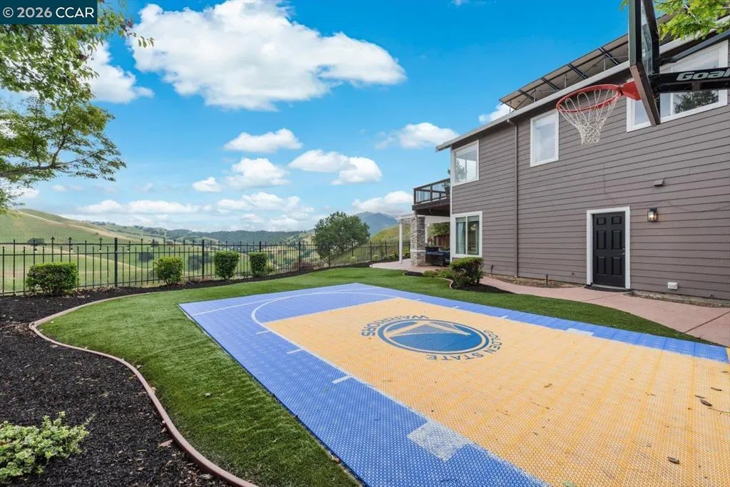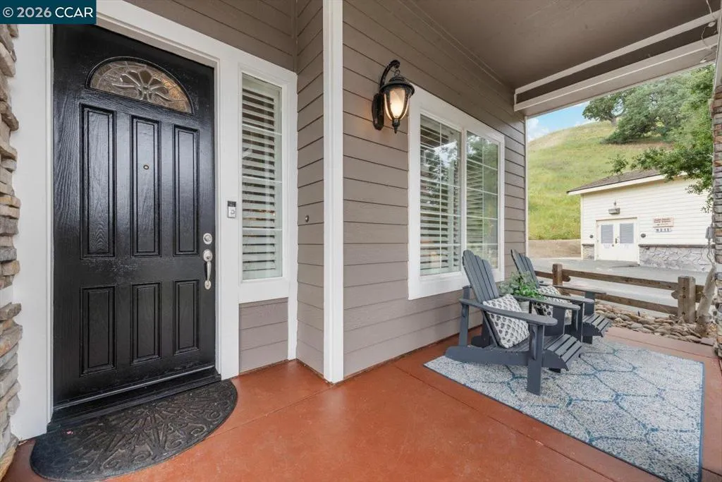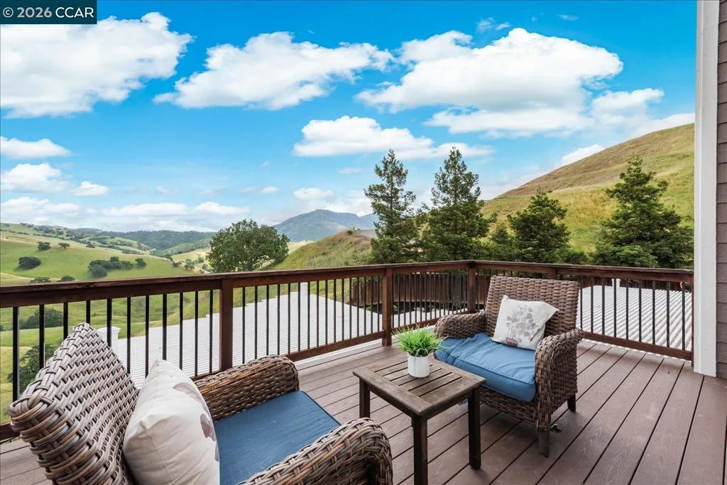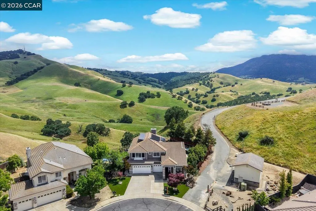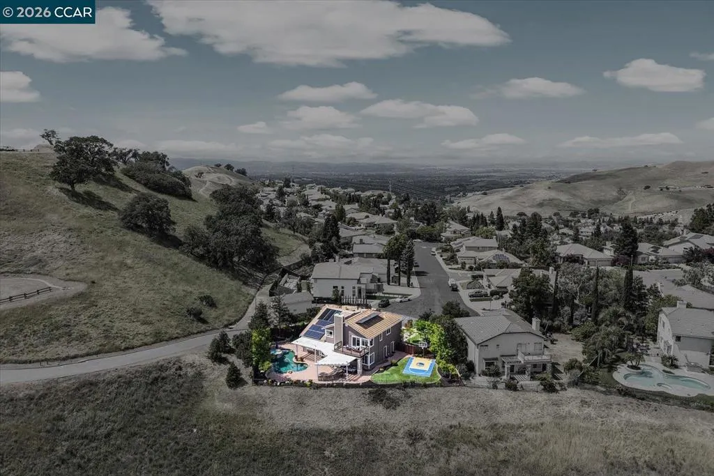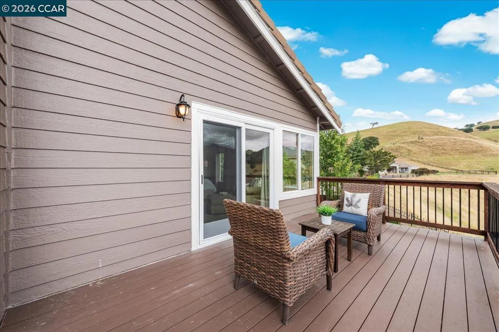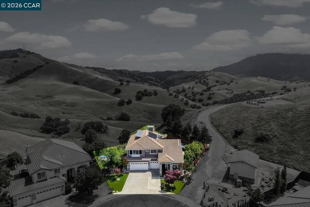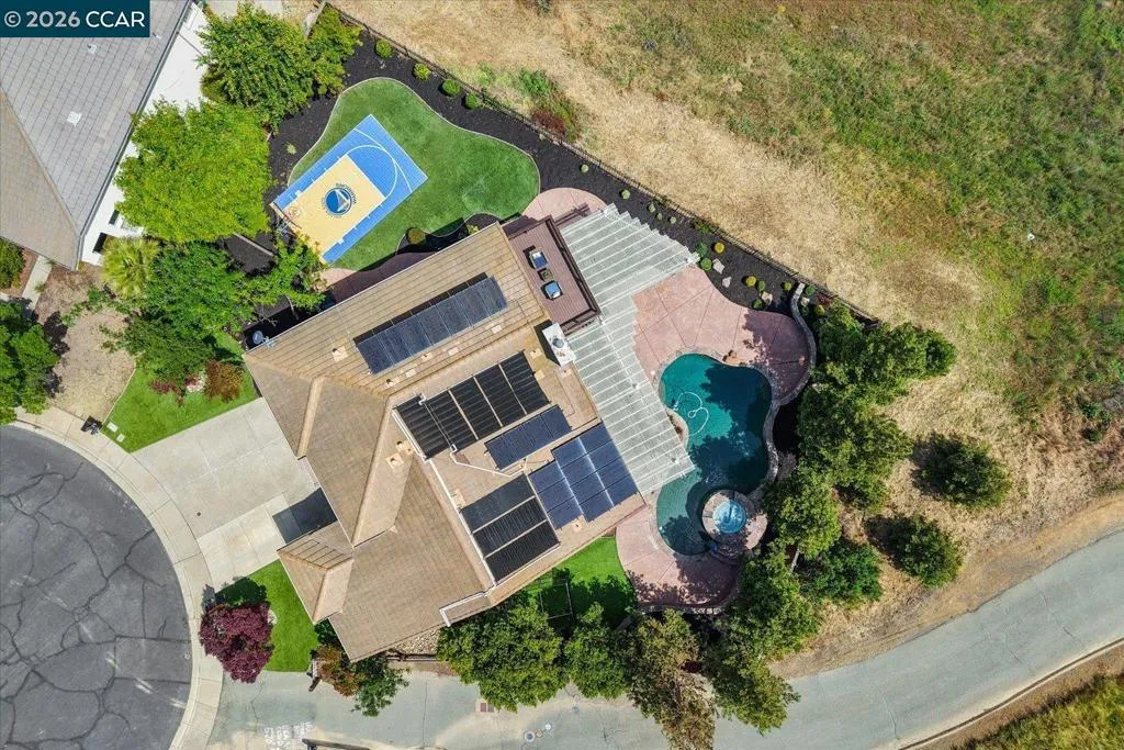 Welcome to 9013 Elk Drive in Clayton, a beautifully maintained 4-bedroom, 3-bathroom home offering 2,879 sq ft of comfortable living space, ideally situated on a quiet cul-de-sac. Step into a light-filled formal living and dining room featuring soaring ceilings, multiple windows, plantation shutters, and elegant vinyl plank flooring. The thoughtfully designed kitchen offers a breakfast bar, modern appliances including a recently upgraded dishwasher, stovetop, and Advantium oven, a generously sized pantry, and space for casual dining. French doors provide direct access to the backyard, while the adjoining family room features a striking fireplace and abundant windows, creating a warm and welcoming gathering space. The main level includes a bedroom and full bathroom, along with a convenient laundry room, offering flexibility for guests or multigenerational living. Upstairs, a versatile loft provides additional living, office, or flex space. The spacious primary suite serves as a private retreat, complete with a walk-in closet and beautiful hillside and Mt. Diablo views, with windows on two walls and a sliding door leading to a large private Trex deck. The en-suite bathroom features a soaking tub, double vanities, a large walk-in shower, and additional closet storage. Two secondary bedrooms share a well-appointed hall bathroom with double vanities and a tub. The backyard is designed for both entertaining and everyday enjoyment, featuring a large-paved patio area with an expansive covered structure spanning the back of the home, creating multiple shaded spaces for dining and lounging. Enjoy private hillside views, a sparkling pool (currently chlorine with option for saltwater), and a spa. An outdoor built-in barbecue with bar seating serves as a central gathering point, complemented by a small basketball court and low-maintenance landscaping with artificial turf and drought-tolerant plants. Recent upgrades include interior and exterior paint, remodeled bathrooms, updated HVAC, upstairs carpet, fencing, outdoor lighting, and fully owned solar. The pool system has also been fully updated, including sweep, heater, pump, lighting, tank, and filters. Enjoy the perfect balance of outdoor adventure and modern convenience, with nearby walking trails and a variety of shops and restaurants just a short drive away. With its serenity, sense of privacy and generous living space, this home offers an exceptional place to call home. Views: Ridge
