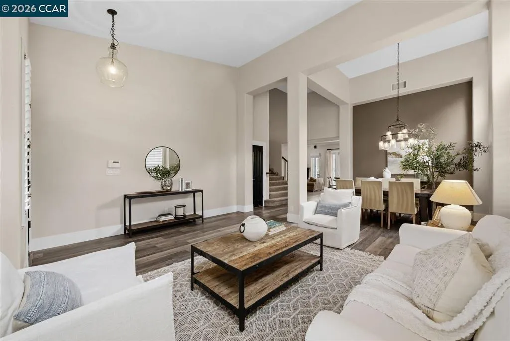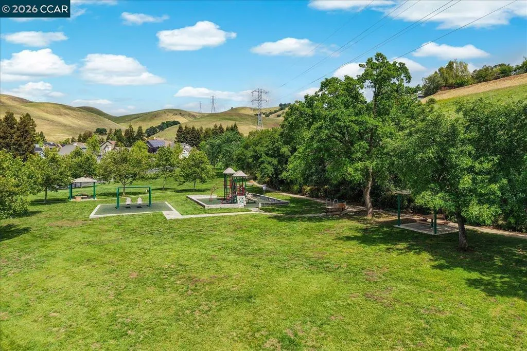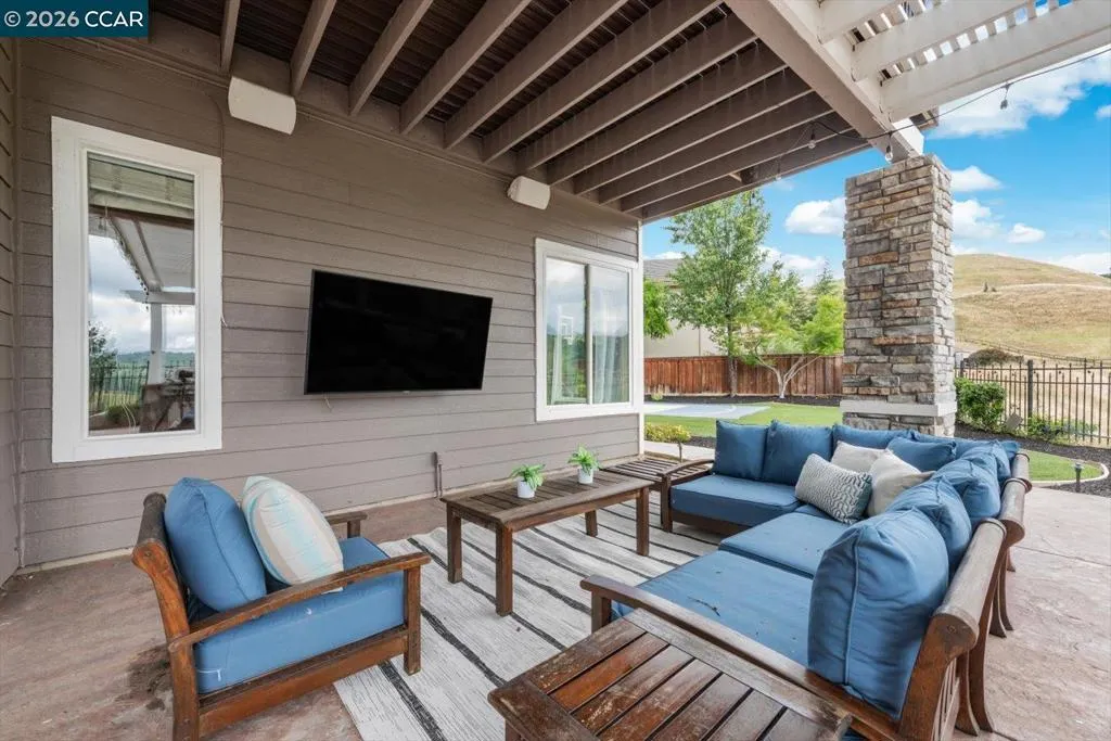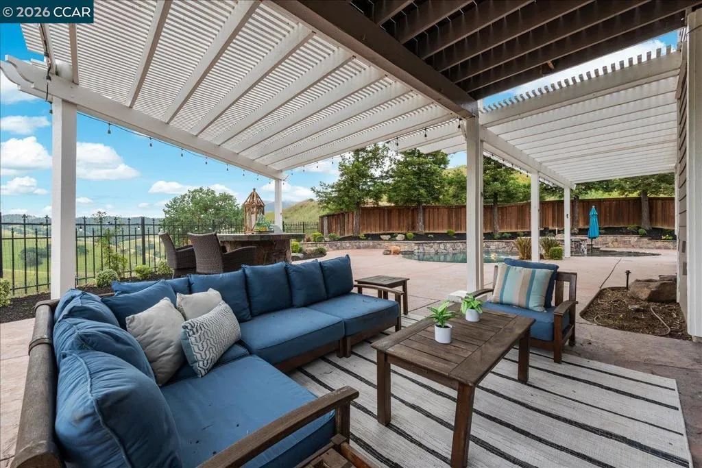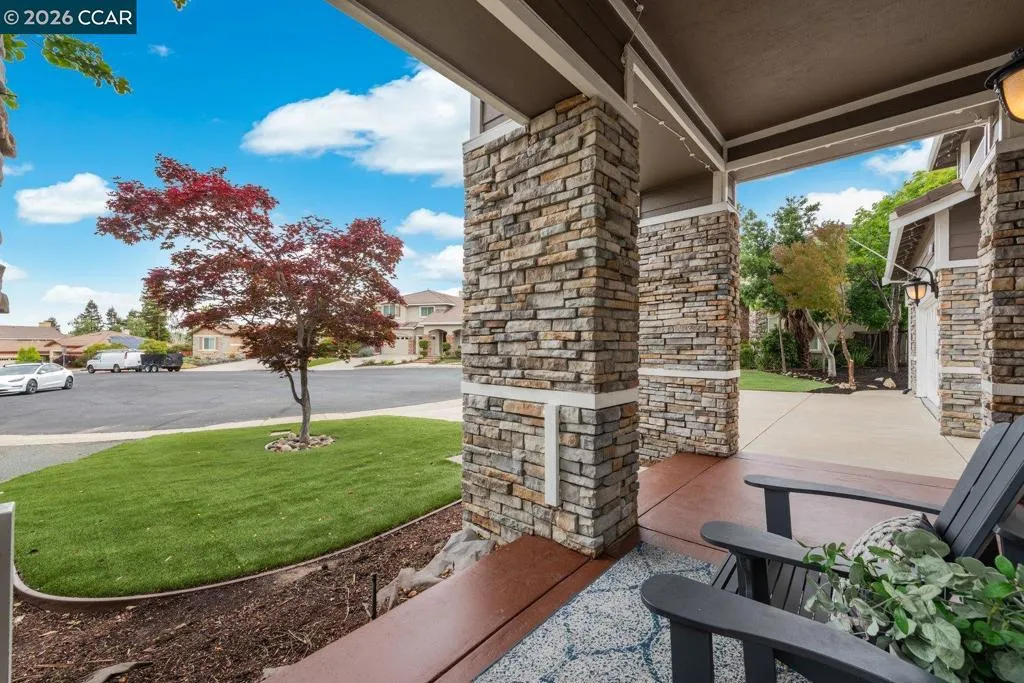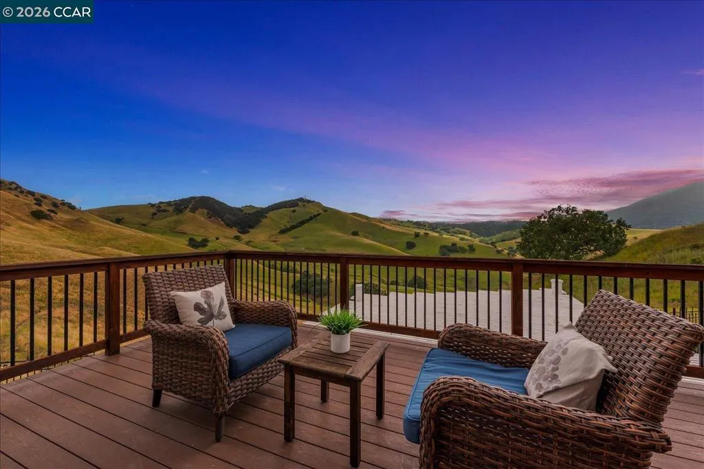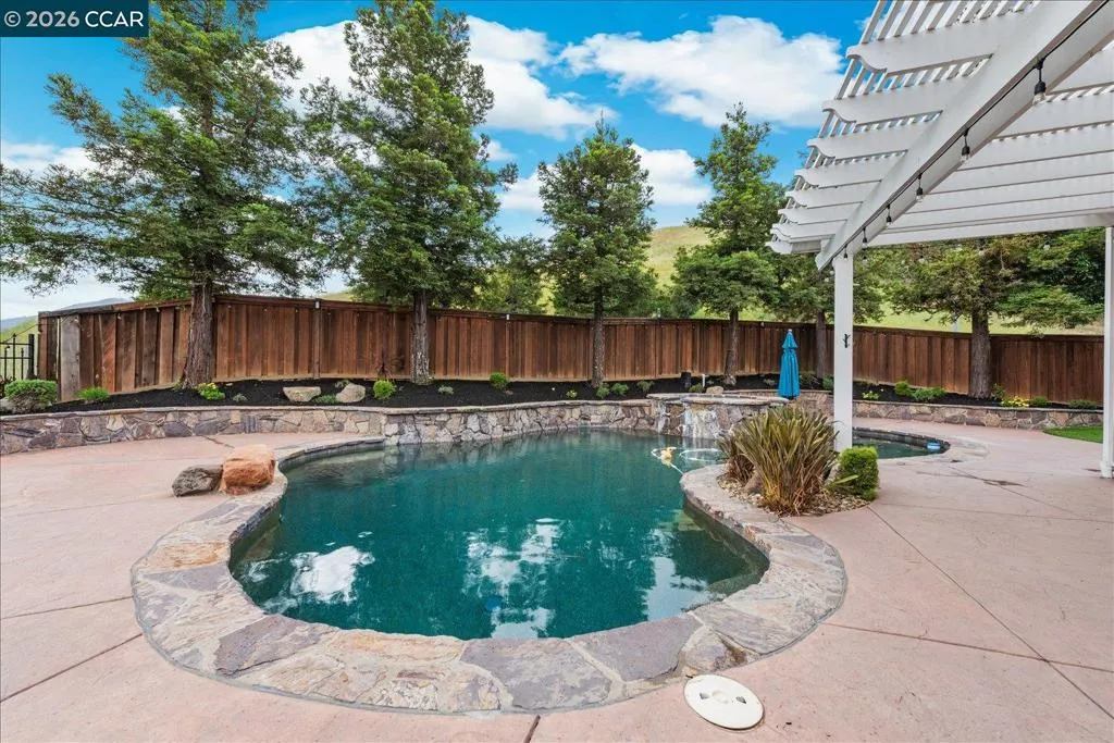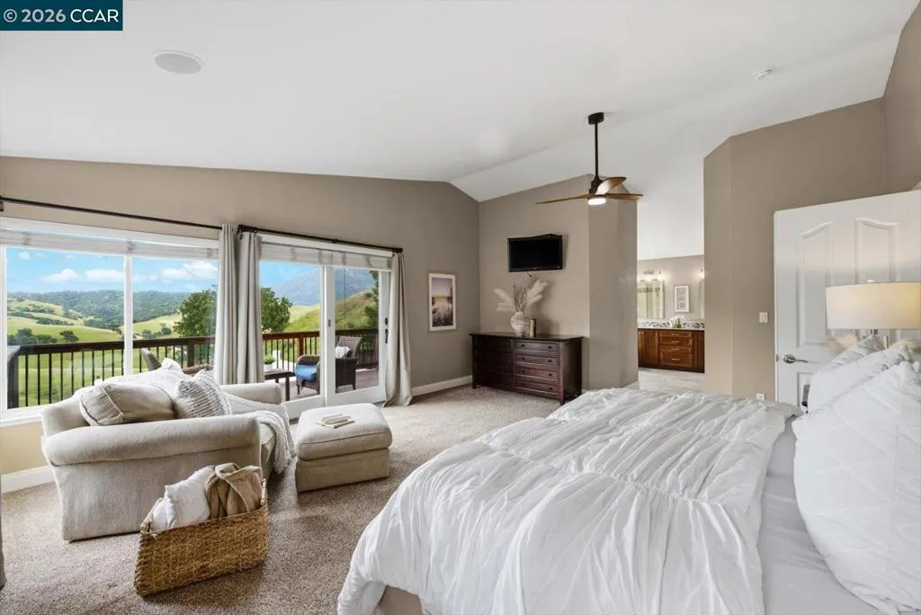 Welcome to 9013 Elk Drive in Clayton, a beautifully maintained 4-bedroom, 3-bathroom home offering 2,879 sq ft of comfortable living space, ideally situated on a quiet cul-de-sac. Step into a light-filled formal living and dining room featuring soaring ceilings, multiple windows, plantation shutters, and elegant vinyl plank flooring. The thoughtfully designed kitchen offers a breakfast bar, modern appliances including a recently upgraded dishwasher, stovetop, and Advantium oven, a generously sized pantry, and space for casual dining. French doors provide direct access to the backyard, while the adjoining family room features a striking fireplace and abundant windows, creating a warm and welcoming gathering space. The main level includes a bedroom and full bathroom, along with a convenient laundry room, offering flexibility for guests or multigenerational living. Upstairs, a versatile loft provides additional living, office, or flex space. The spacious primary suite serves as a private retreat, complete with a walk-in closet and beautiful hillside and Mt. Diablo views, with windows on two walls and a sliding door leading to a large private Trex deck. The en-suite bathroom features a soaking tub, double vanities, a large walk-in shower, and additional closet storage. Two secondary bedrooms share a well-appointed hall bathroom with double vanities and a tub. The backyard is designed for both entertaining and everyday enjoyment, featuring a large-paved patio area with an expansive covered structure spanning the back of the home, creating multiple shaded spaces for dining and lounging. Enjoy private hillside views, a sparkling pool (currently chlorine with option for saltwater), and a spa. An outdoor built-in barbecue with bar seating serves as a central gathering point, complemented by a small basketball court and low-maintenance landscaping with artificial turf and drought-tolerant plants. Recent upgrades include interior and exterior paint, remodeled bathrooms, updated HVAC, upstairs carpet, fencing, outdoor lighting, and fully owned solar. The pool system has also been fully updated, including sweep, heater, pump, lighting, tank, and filters. Enjoy the perfect balance of outdoor adventure and modern convenience, with nearby walking trails and a variety of shops and restaurants just a short drive away. With its serenity, sense of privacy and generous living space, this home offers an exceptional place to call home. Views: Ridge