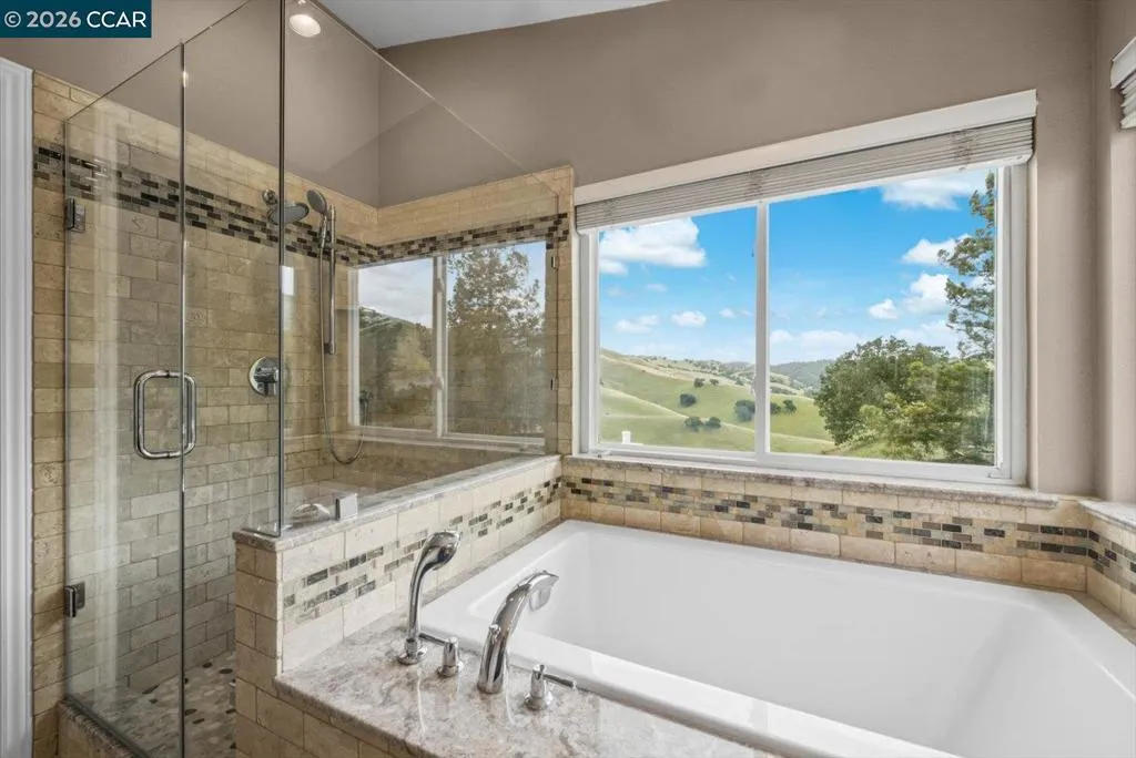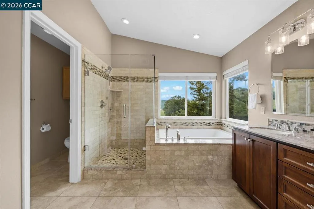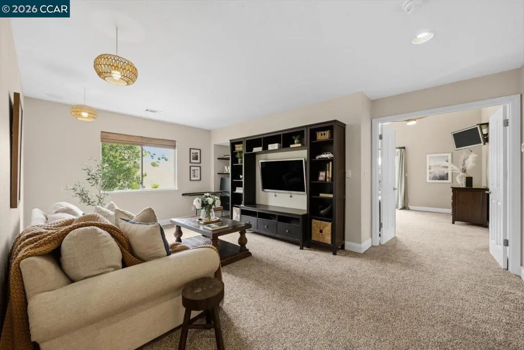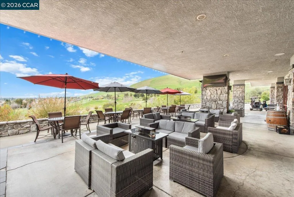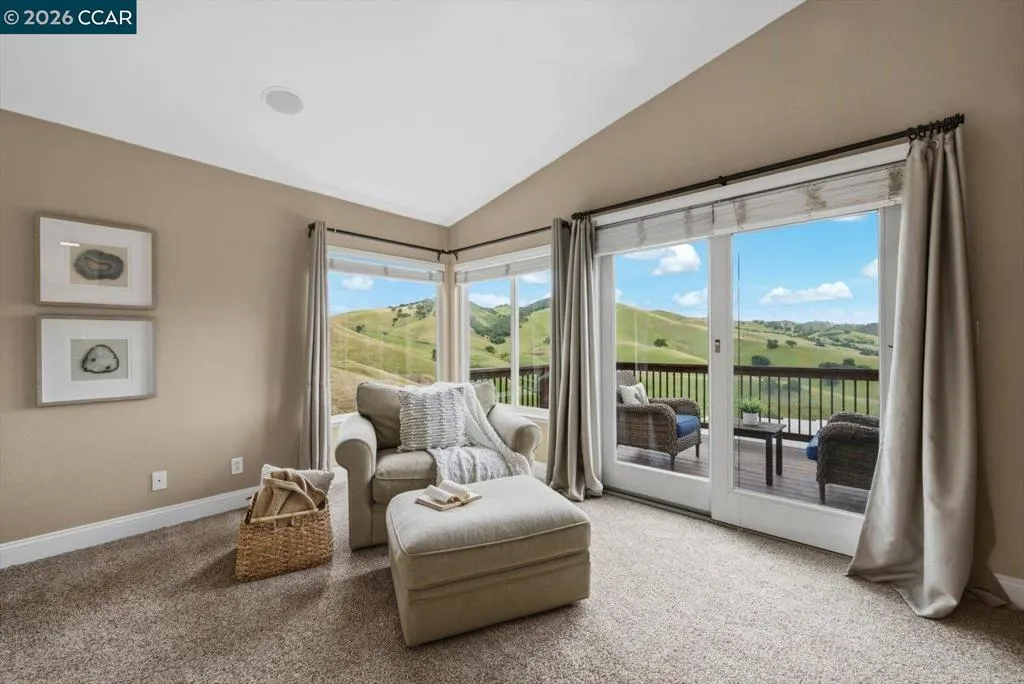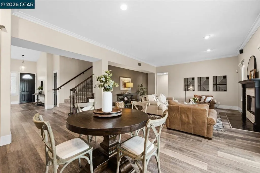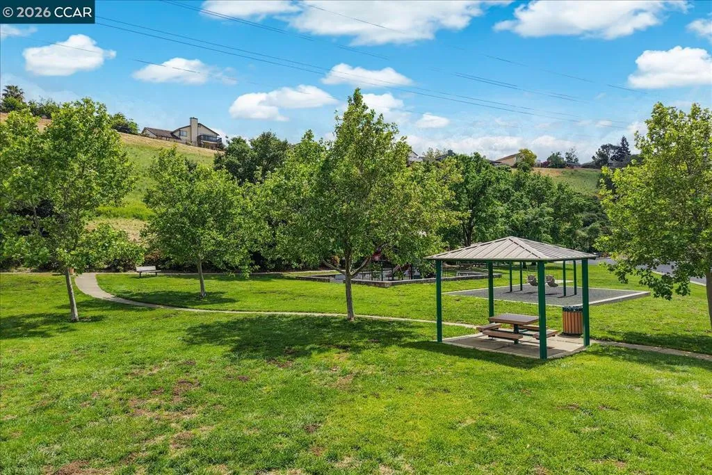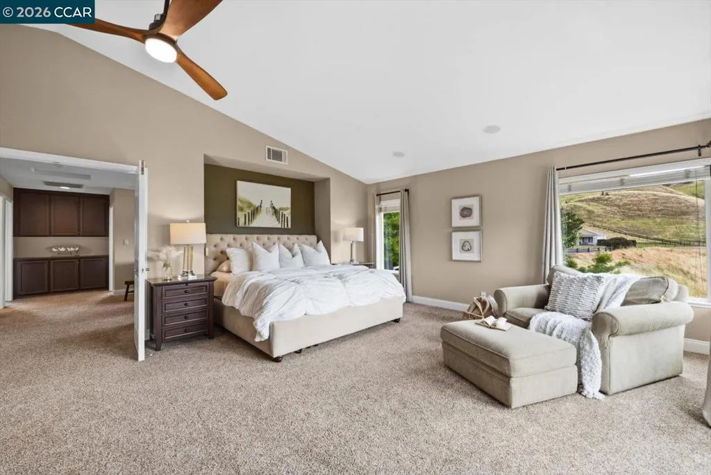 Welcome to 9013 Elk Drive in Clayton, a beautifully maintained 4-bedroom, 3-bathroom home offering 2,879 sq ft of comfortable living space, ideally situated on a quiet cul-de-sac. Step into a light-filled formal living and dining room featuring soaring ceilings, multiple windows, plantation shutters, and elegant vinyl plank flooring. The thoughtfully designed kitchen offers a breakfast bar, modern appliances including a recently upgraded dishwasher, stovetop, and Advantium oven, a generously sized pantry, and space for casual dining. French doors provide direct access to the backyard, while the adjoining family room features a striking fireplace and abundant windows, creating a warm and welcoming gathering space. The main level includes a bedroom and full bathroom, along with a convenient laundry room, offering flexibility for guests or multigenerational living. Upstairs, a versatile loft provides additional living, office, or flex space. The spacious primary suite serves as a private retreat, complete with a walk-in closet and beautiful hillside and Mt. Diablo views, with windows on two walls and a sliding door leading to a large private Trex deck. The en-suite bathroom features a soaking tub, double vanities, a large walk-in shower, and additional closet storage. Two secondary bedrooms share a well-appointed hall bathroom with double vanities and a tub. The backyard is designed for both entertaining and everyday enjoyment, featuring a large-paved patio area with an expansive covered structure spanning the back of the home, creating multiple shaded spaces for dining and lounging. Enjoy private hillside views, a sparkling pool (currently chlorine with option for saltwater), and a spa. An outdoor built-in barbecue with bar seating serves as a central gathering point, complemented by a small basketball court and low-maintenance landscaping with artificial turf and drought-tolerant plants. Recent upgrades include interior and exterior paint, remodeled bathrooms, updated HVAC, upstairs carpet, fencing, outdoor lighting, and fully owned solar. The pool system has also been fully updated, including sweep, heater, pump, lighting, tank, and filters. Enjoy the perfect balance of outdoor adventure and modern convenience, with nearby walking trails and a variety of shops and restaurants just a short drive away. With its serenity, sense of privacy and generous living space, this home offers an exceptional place to call home. Views: Ridge