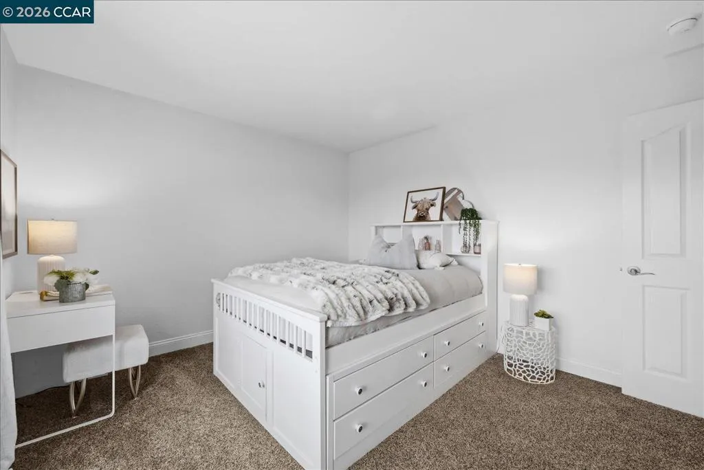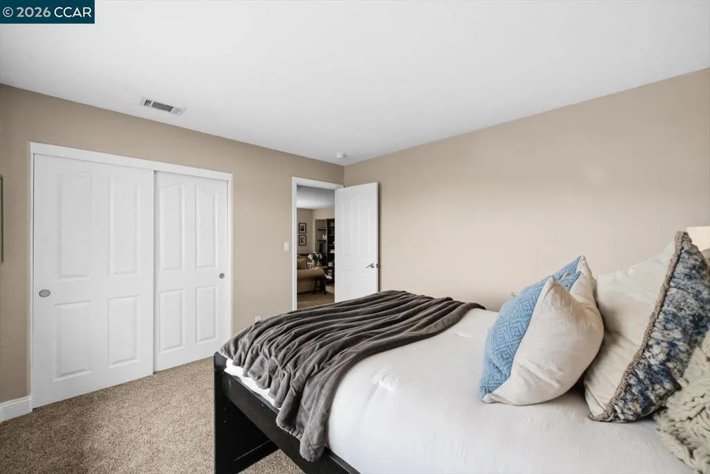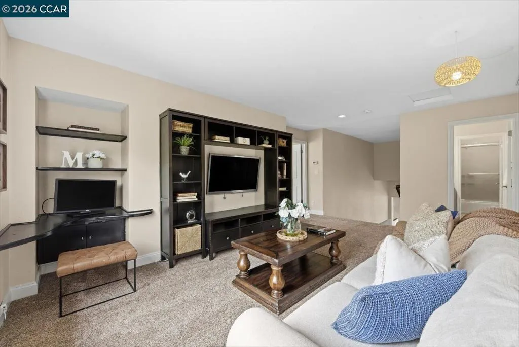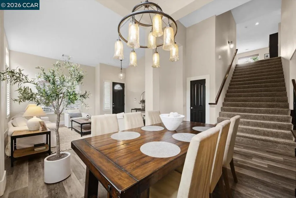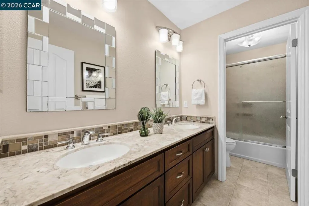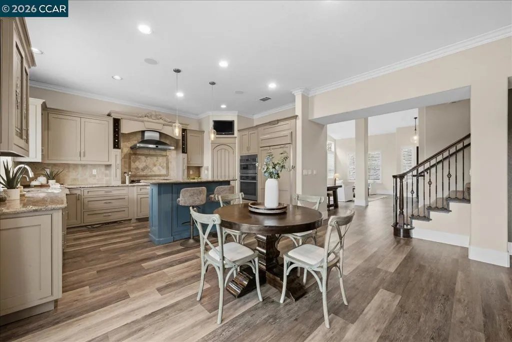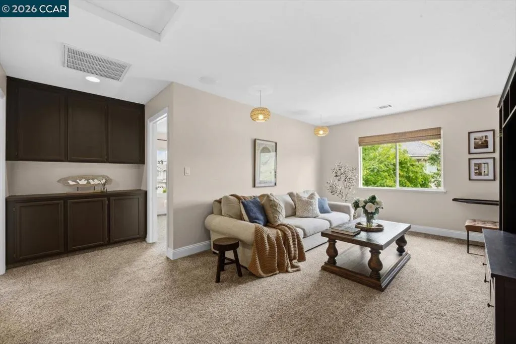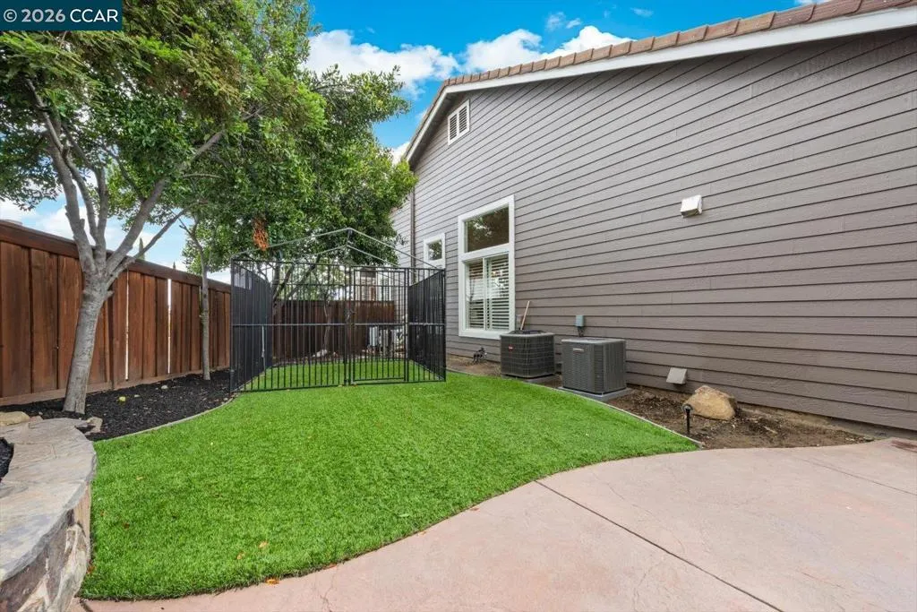 Welcome to 9013 Elk Drive in Clayton, a beautifully maintained 4-bedroom, 3-bathroom home offering 2,879 sq ft of comfortable living space, ideally situated on a quiet cul-de-sac. Step into a light-filled formal living and dining room featuring soaring ceilings, multiple windows, plantation shutters, and elegant vinyl plank flooring. The thoughtfully designed kitchen offers a breakfast bar, modern appliances including a recently upgraded dishwasher, stovetop, and Advantium oven, a generously sized pantry, and space for casual dining. French doors provide direct access to the backyard, while the adjoining family room features a striking fireplace and abundant windows, creating a warm and welcoming gathering space. The main level includes a bedroom and full bathroom, along with a convenient laundry room, offering flexibility for guests or multigenerational living. Upstairs, a versatile loft provides additional living, office, or flex space. The spacious primary suite serves as a private retreat, complete with a walk-in closet and beautiful hillside and Mt. Diablo views, with windows on two walls and a sliding door leading to a large private Trex deck. The en-suite bathroom features a soaking tub, double vanities, a large walk-in shower, and additional closet storage. Two secondary bedrooms share a well-appointed hall bathroom with double vanities and a tub. The backyard is designed for both entertaining and everyday enjoyment, featuring a large-paved patio area with an expansive covered structure spanning the back of the home, creating multiple shaded spaces for dining and lounging. Enjoy private hillside views, a sparkling pool (currently chlorine with option for saltwater), and a spa. An outdoor built-in barbecue with bar seating serves as a central gathering point, complemented by a small basketball court and low-maintenance landscaping with artificial turf and drought-tolerant plants. Recent upgrades include interior and exterior paint, remodeled bathrooms, updated HVAC, upstairs carpet, fencing, outdoor lighting, and fully owned solar. The pool system has also been fully updated, including sweep, heater, pump, lighting, tank, and filters. Enjoy the perfect balance of outdoor adventure and modern convenience, with nearby walking trails and a variety of shops and restaurants just a short drive away. With its serenity, sense of privacy and generous living space, this home offers an exceptional place to call home. Views: Ridge