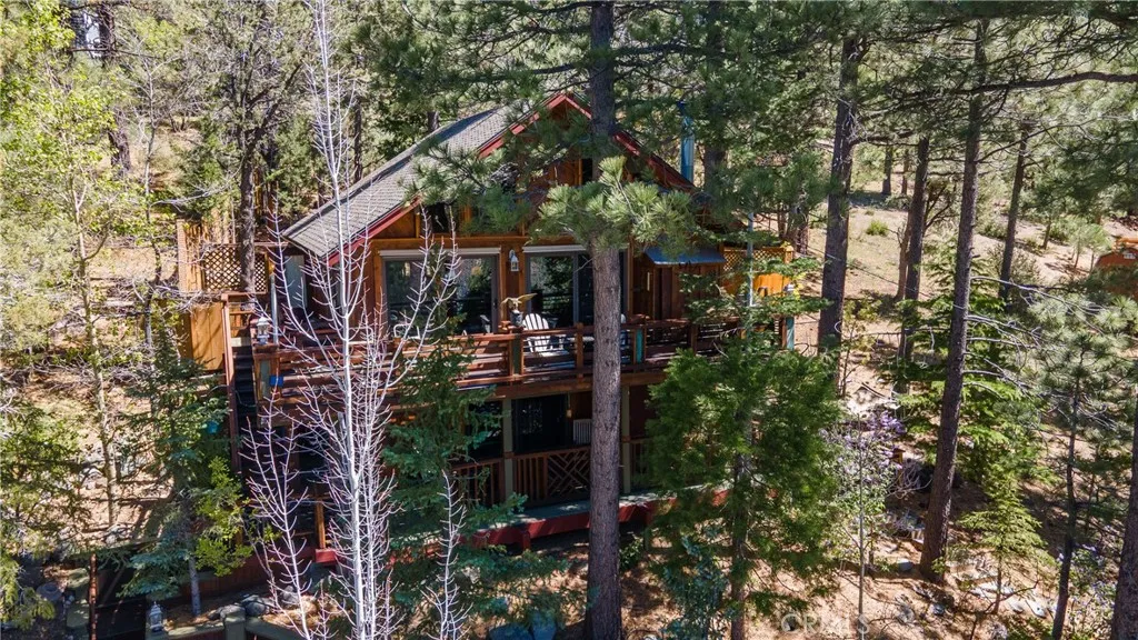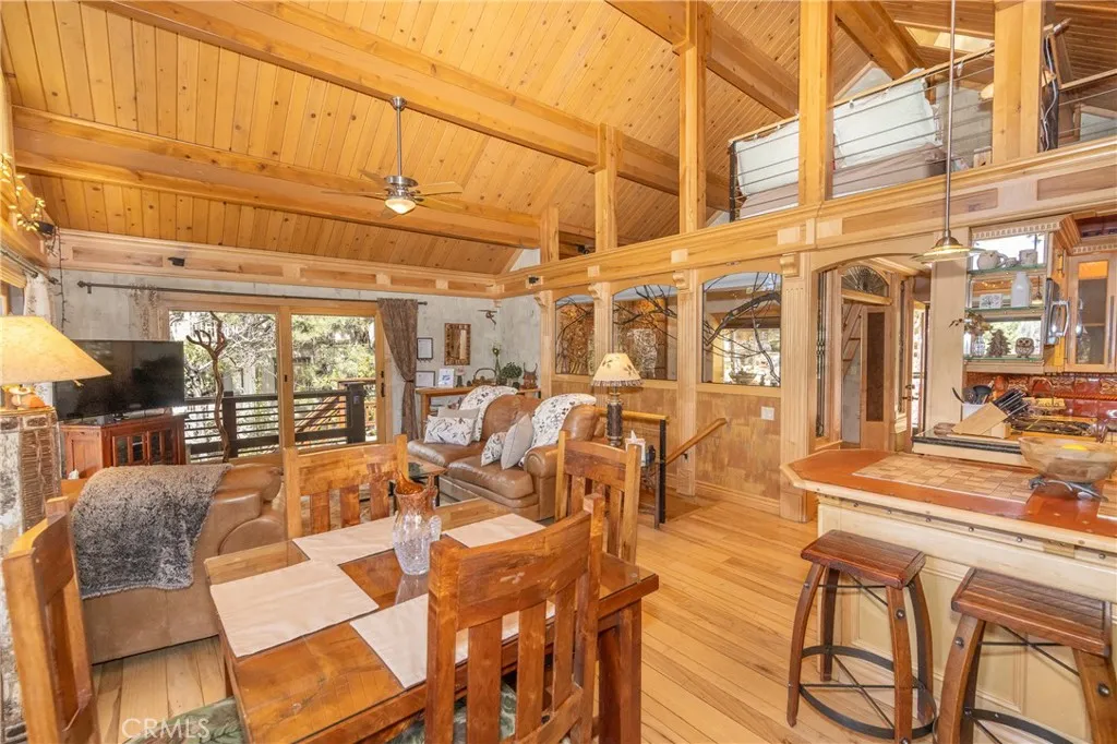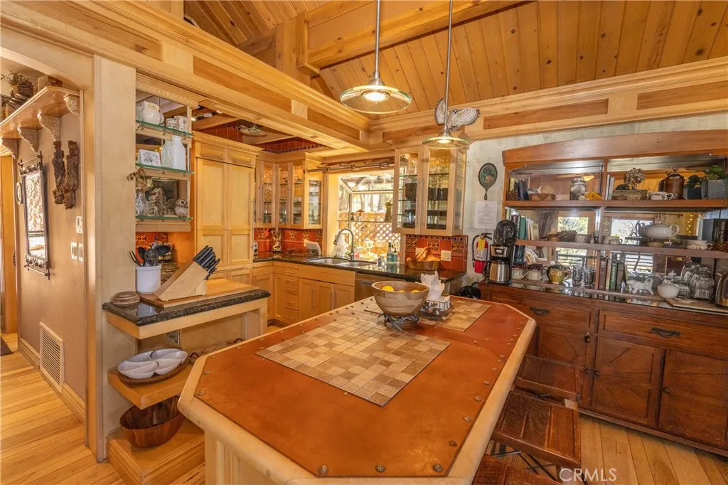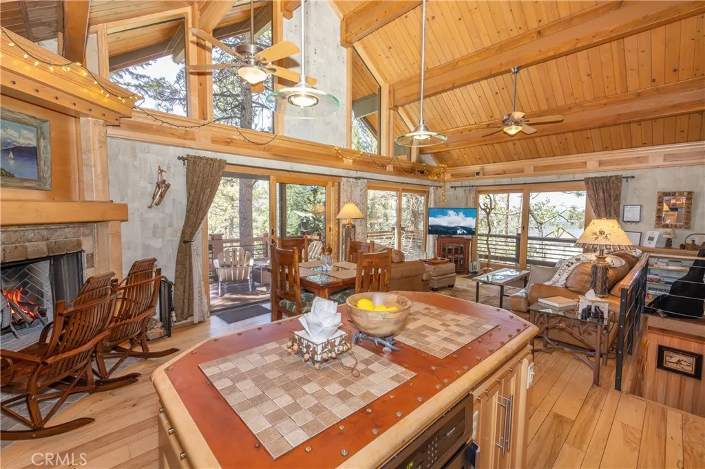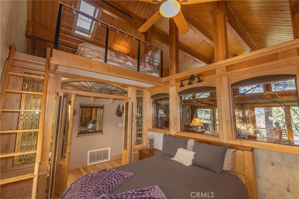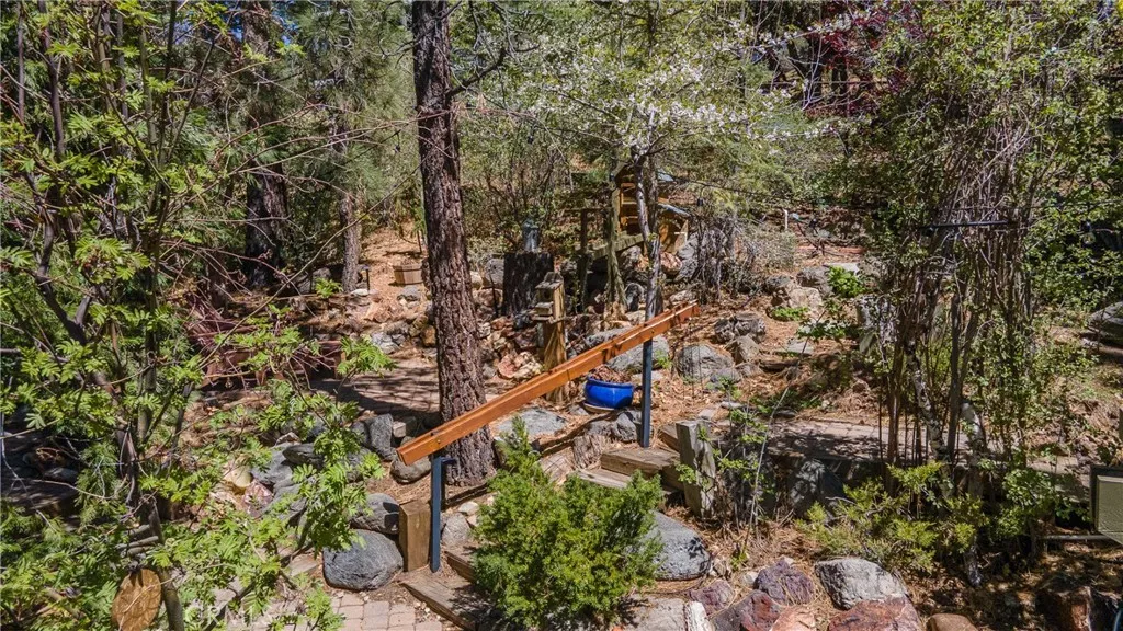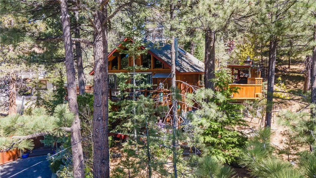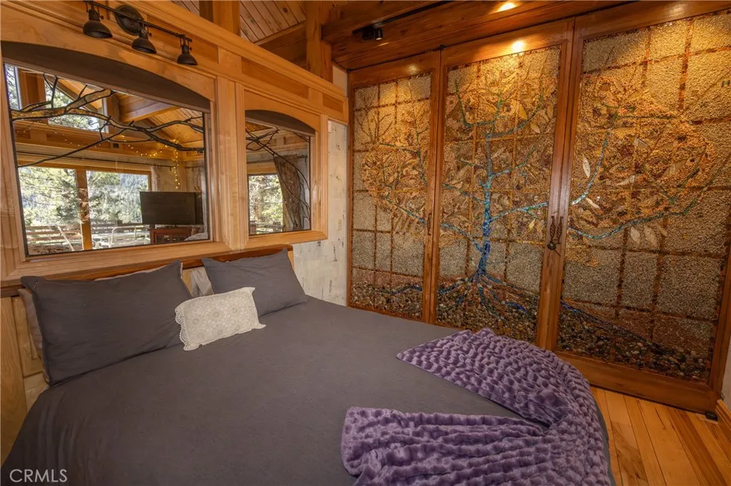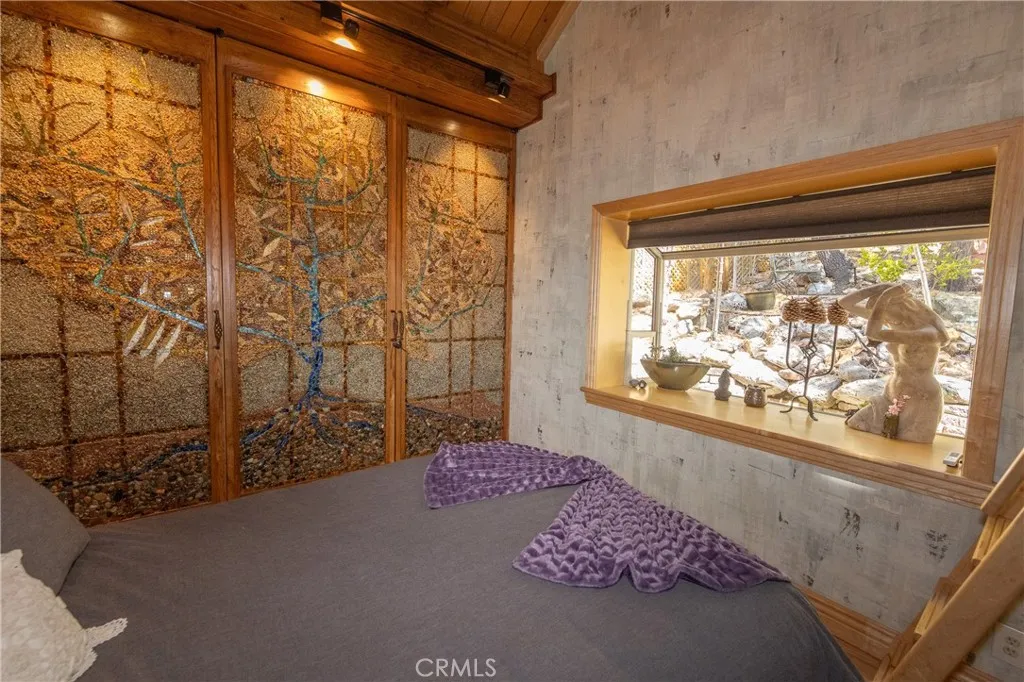 Perched among the trees in sought-after Moonridge, this one-of-a-kind “Tree of Life” retreat is far more than a cabin—it’s an enchanted artistic and writer’s retreat, a living work of art. This 2-bedroom with a loft, 2-bath artisan-crafted home offers a rare blend of architectural beauty, natural surroundings, and unforgettable views of the lake and ski slopes, all just minutes from Bear Mountain. Originally handcrafted over a decade by a master craftsman as a tribute to his wife, every inch of this home tells a story. Custom woodwork, intricate glass details, and curated artistic elements are thoughtfully woven throughout, highlighted by the stunning “Tree of Life” mosaic—an irreplaceable centerpiece that defines the home’s character. The open-concept living space is warm and inviting, designed to bring the outdoors in with expansive windows framing treetop vistas. A custom kitchen features high-end appliances, unique finishes, and a handcrafted island, flowing seamlessly into the dining and living areas—perfect for entertaining, quiet mountain evenings, or creative inspiration. The main-level “Tree of Life” suite serves as a romantic and artistic sanctuary, ideal for reflection, writing, or peaceful escape. It features a cozy queen bed and one of the home’s most breathtaking focal points. This room showcases extraordinary custom leaded glasswork and three handcrafted cedar closet doors, each weighing approximately 200 pounds and adorned with an intricate mosaic of crushed stone, glass, and tile. Taking over a year to complete, this remarkable installation stands as a true testament to craftsmanship, artistry, and devotion. Step outside to find a private, serene setting complete with a landscaped garden, tranquil waterfall, gazebo, and spa—creating a truly enchanted retreat atmosphere surrounded by nature, perfect for artists, writers, or anyone seeking inspiration and escape. Homes of this caliber and character rarely come to market. When they do, they command attention and often sell well above typical market comparisons due to their irreplaceable design and craftsmanship. There truly is nothing else like it in Big Bear. Whether you’re looking for a personal escape, a luxury short-term rental, or a standout investment, this property offers an opportunity that simply cannot be replicated. Don’t miss your chance to own one of Big Bear’s most iconic and unforgettable homes.