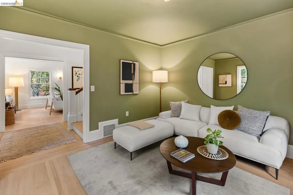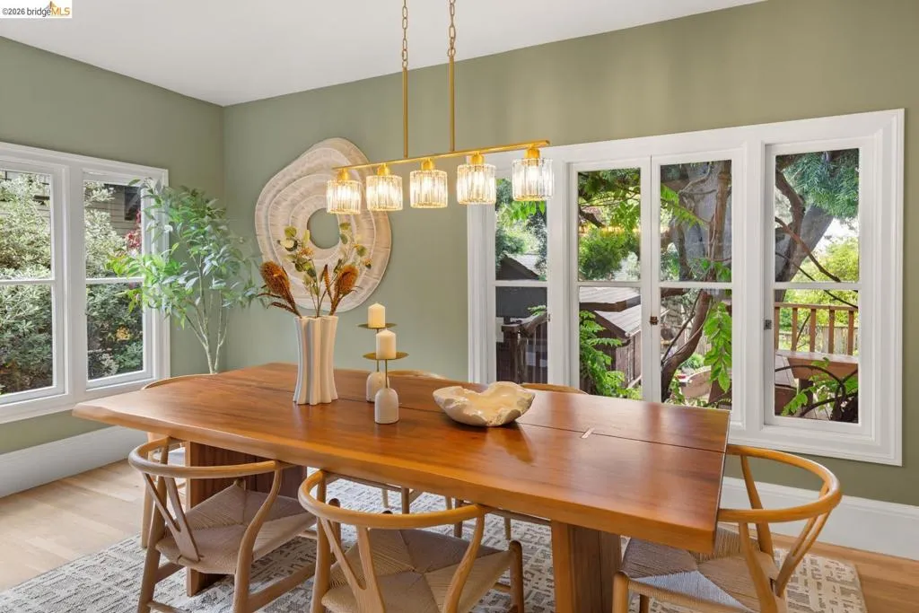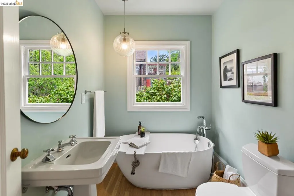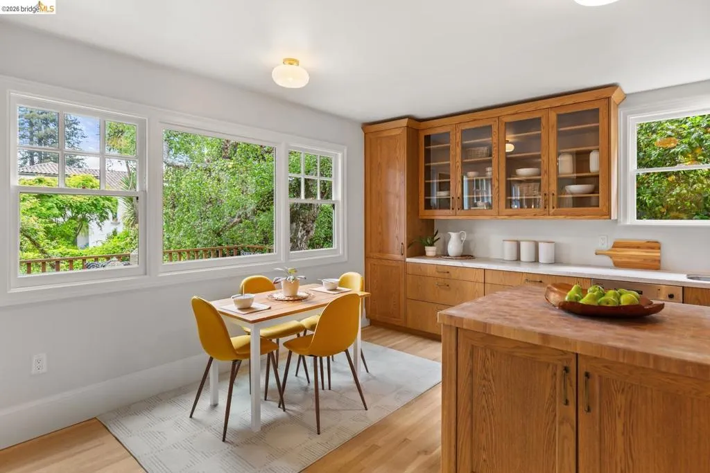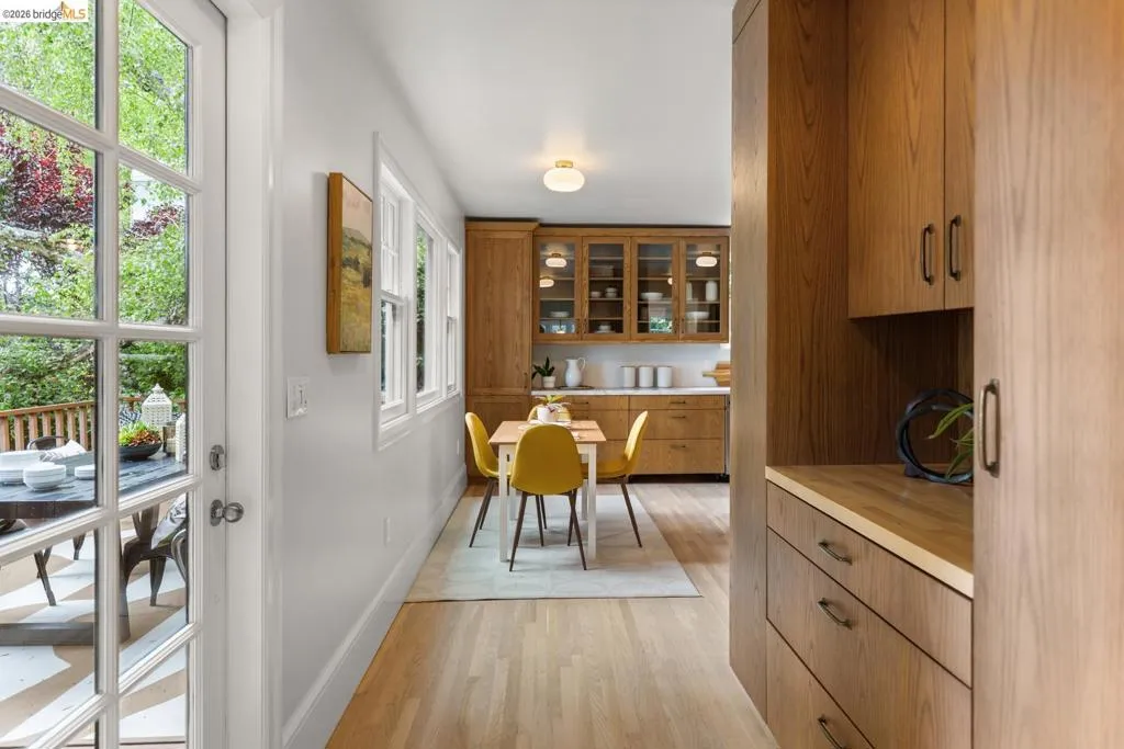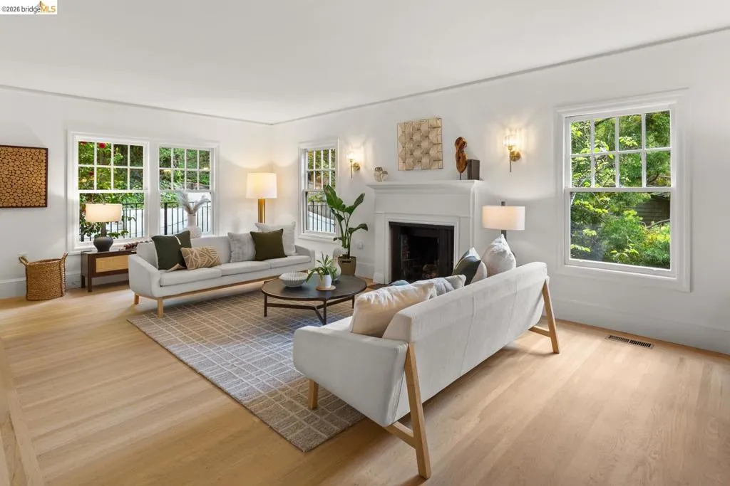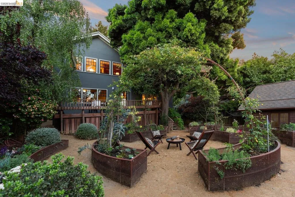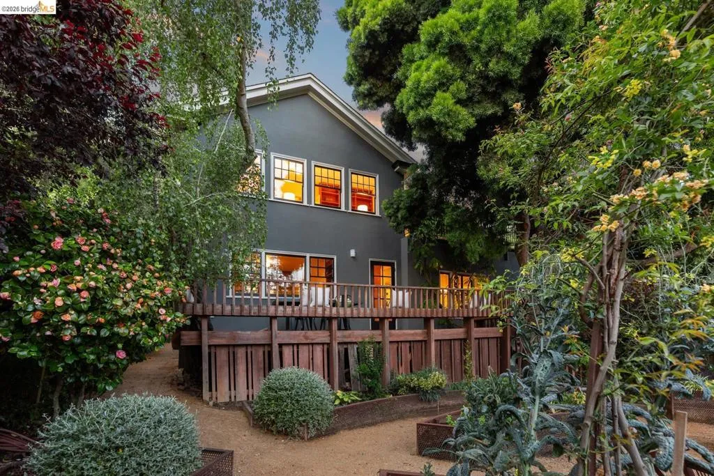 Classic updated Claremont traditional set on a lushly landscaped lot with beautifully landscaped gardens and a spacious driveway. The main level features a welcoming entry, combined living and dining rooms with fireplace, and a generous library/family room and walls of built-ins. In addition, an enclosed sunroom adds flexibility and charm and a full bath on the entry level provides ease and comfort. The recently renovated eat-in kitchen showcases custom walnut cabinetry, marble countertops, and top-of-the-line appliances. French doors provide direct access to a rear deck overlooking the beautifully designed formal gardens with circular walkways, vegetable beds, mature trees and lush plantings that evoke a romance and scale and are perfect for entertaining and play. Upstairs, three additional bedrooms including a spacious primary suite are bathed in natural light and a large office with a wall of windows frames enjoys serene garden views. A charming upstairs balcony provides indoor-outdoor flow and can be directly accessed from 2 rooms. A detached semi-finished studio to the rear of the garden includes a half bath and is plumbed for a kitchen and shower and offers future potential. Ideally located on a coveted Claremont street close to hiking trails, Rockridge, Elmwood, the Domingo Avenue. shops, and the Claremont Hotel. Timeless architecture, modern comfort, and prime setting! BESO EXEMPT, BERK MAIL, OAKLAND TAXES.