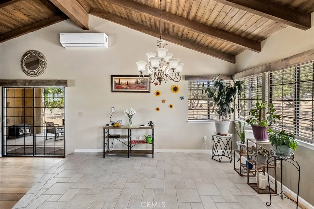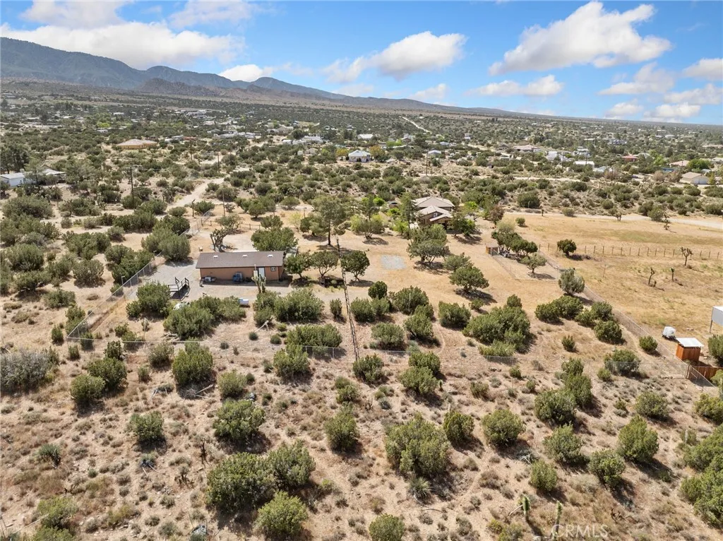 Tucked into the high desert landscape of south Pinon Hills, this charming 3 bedroom, 2.5 bath home offers the perfect blend of rustic character and comfortable living on 2.28 private acres. From the moment you arrive, the sweeping mountain views and dramatic sunset skies set the tone for everything this property delivers. Inside, soaring wood-beamed ceilings and warm tongue-and-groove wood create an inviting, cabin-inspired atmosphere throughout the main living areas. The great room is anchored by a stunning floor-to-ceiling stacked stone fireplace — the heart of the home on cool high desert evenings. The ori-level design of the home invites you in with the main level entry the leads to the living room with beautiful wood flooring which wind around to the dining area and kitchen. The kitchen features abundant quality oak cabinetry, updated granite countertops, a breakfast bar, and mountain views right from the sink. A spacious secondary living area with vaulted beamed ceilings, an additional wood burning stove, a mini-split, and an elegant chandelier offers flexible space for dining, a sunroom, or additional lounge. Step outside to the covered patio — wrapped in beautiful stacked stone and topped with a pergola — the ideal space to entertain or simply take in the natural surroundings. The detached two-car garage is a standout bonus, featuring full insulation, a mini-split system, and a finished living space complete with wood-paneled walls, vaulted wood ceilings, LVP flooring, a kitchenette, and its own private entrance. Whether you envision a guest suite, ADU, home office, or studio, this space is ready to make it happen. This building is separately fenced and offers it's own private drive in access so would be simple to rent out or occupy with family and still maintain privacy. Additionally, the traditional garage space could be converted back to a regular garage. Set on 2.28 fully fenced acres among mature Joshua trees, native desert landscape and planted fruit trees, this property offers the space, privacy, and character that are increasingly hard to find.