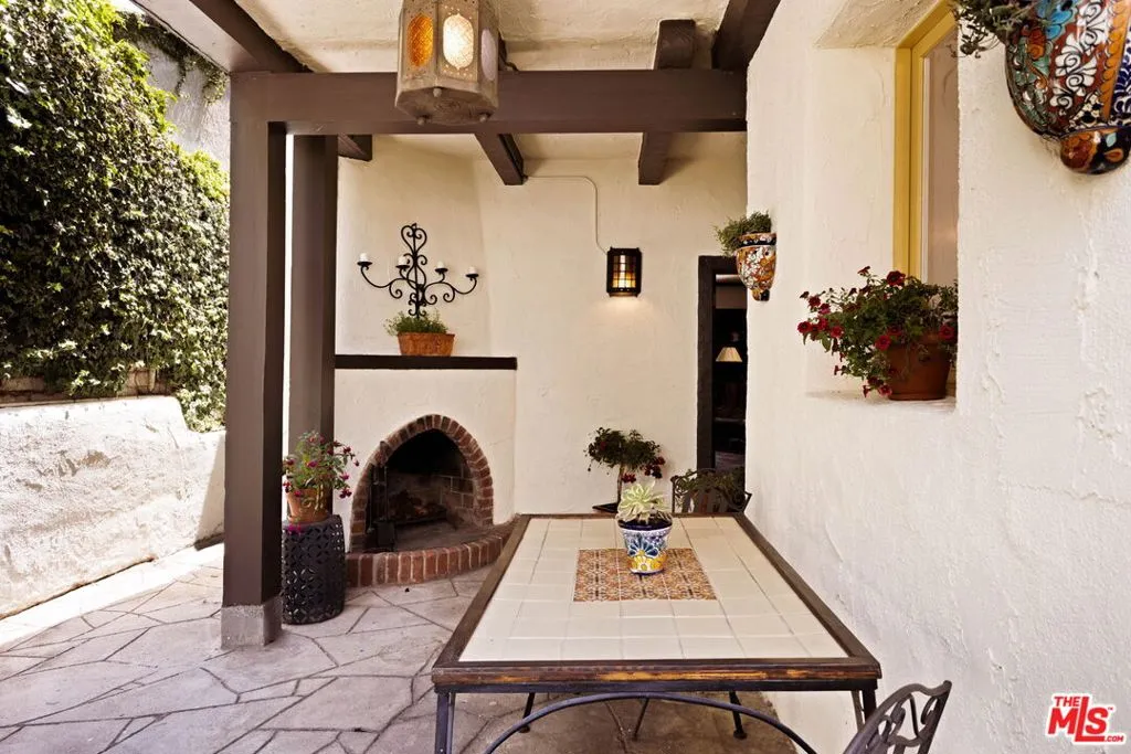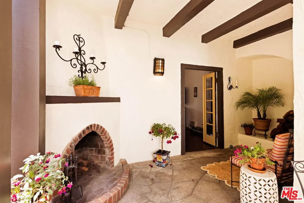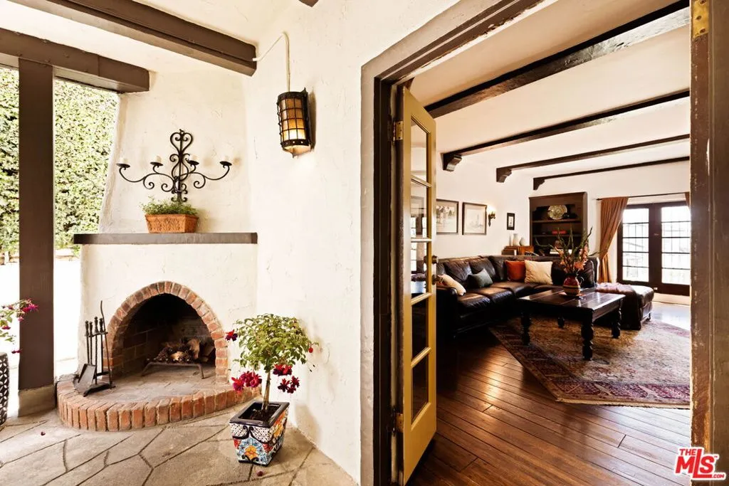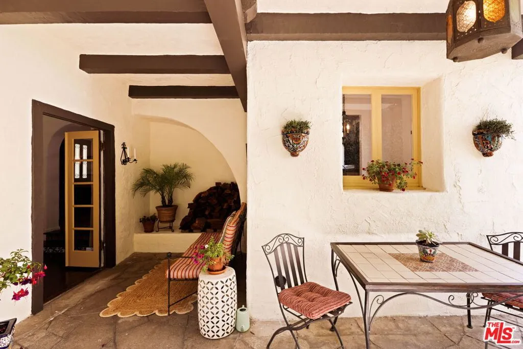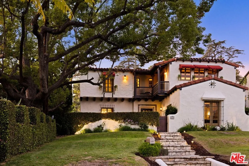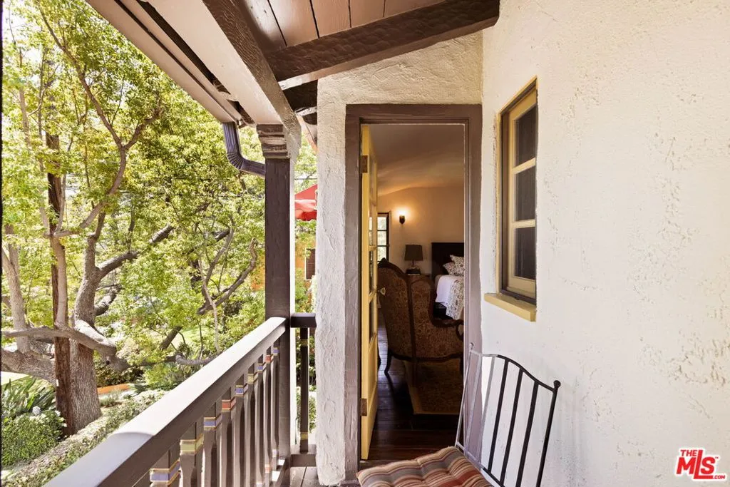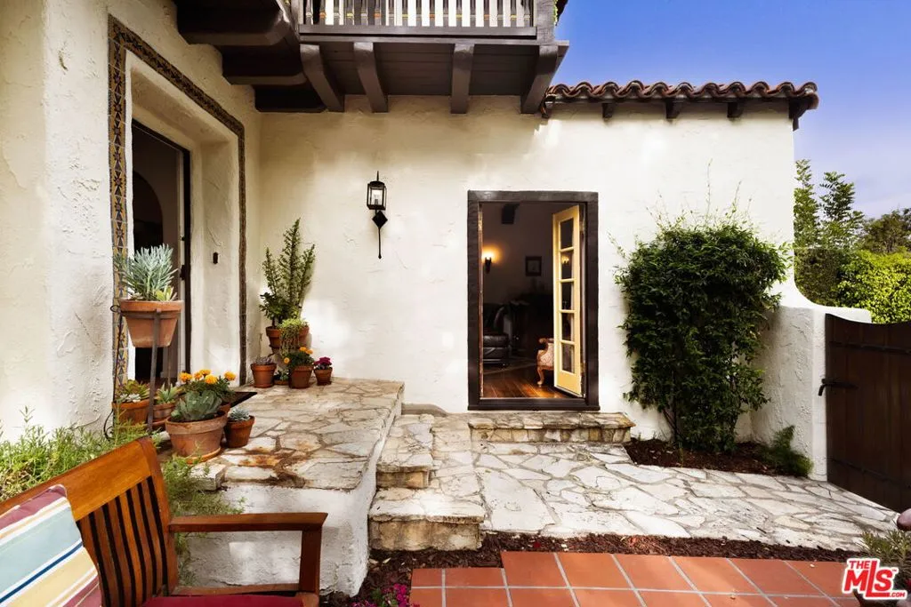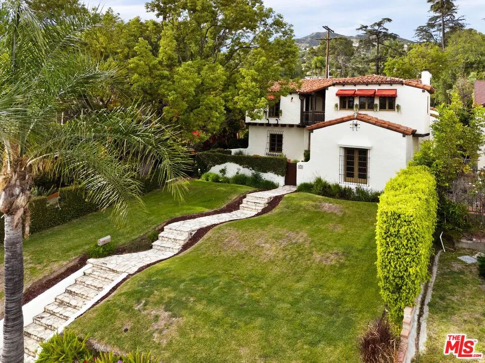 When Ben Sherwood, designer of Los Angeles' famed Snow White cottages, built this home in Rossmoyne, he chose a gently elevated lot and positioned it to capture sweeping views toward Downtown Los Angeles and the Glendale skyline, long before those skylines took shape. He brought with him a clear architectural sensibility rooted in old-world design, shaping a residence defined by intention, detail, and enduring charm. Set in Rossmoyne, the home opens to a front courtyard shaded by a mature tree, where a flagstone path and original mosaic tile at the entry mark a clear and memorable arrival. Exposed wood beams, hardwood floors, and a plaster fireplace give the living room its character, with built-ins and French doors opening back to the courtyard, where shifting light throughout the day adds a quiet, almost storybook quality to the space. Arched openings guide the flow into the dining room, where large French windows bring in natural light and the same beam detail continues overhead. The kitchen sits just off the dining room, with tilework that remains consistent with the home's period and character, and opens to a breakfast nook tucked beneath an arched ceiling with built-in niches, creating a small, tucked-away space that looks out to the garden, where mature roses and a bird bath attract a steady presence of seasonal birds. Upstairs, all three bedrooms are positioned away from the main living areas. The primary suite feels like a private retreat, with a sitting area, a fireplace, and French doors that open to a balcony overlooking the surrounding greenery and distant city views. A walk-in closet and a beautifully appointed bath complete the suite, in keeping with the home's overall character. A loggia-style outdoor living space extends directly from the main living areas, with exposed beams overhead, textured plaster walls, and an arched brick fireplace anchoring the space, which takes on a warm, atmospheric, and dreamy quality as the light fades in the evening. There is space here for both dining and seating, with easy access to additional patio and grassy areas beyond. The casita sits toward the rear of the lot and includes its own bathroom, offering flexibility for guests, a home office, or studio use. The street-to-street lot allows for access from Mountain, where a detached garage is positioned at the rear of the property. Throughout, tilework, plaster walls, wood beams, and arched transitions remain consistent with the home's period and character, reflecting Sherwood's approach to design and proportion. Later additions, including the casita and primary expansion, were also completed under his direction, maintaining continuity with the original structure.