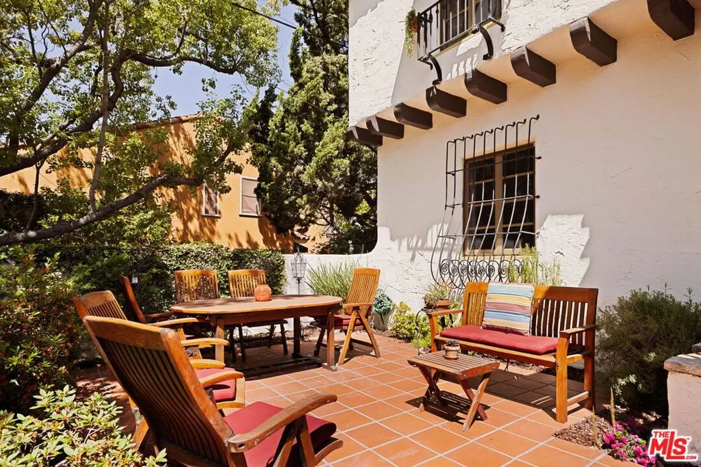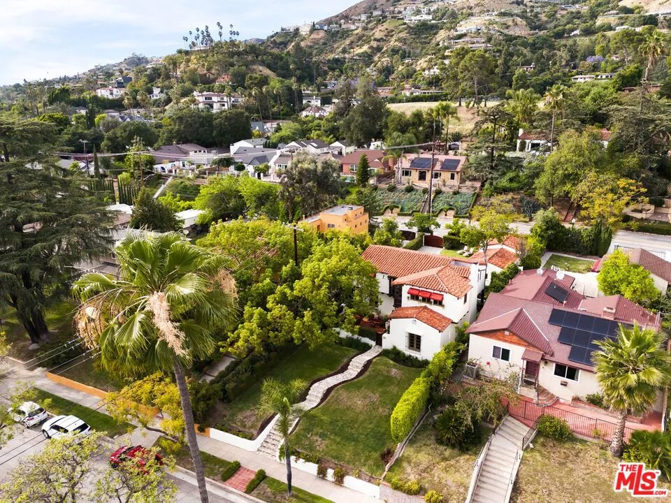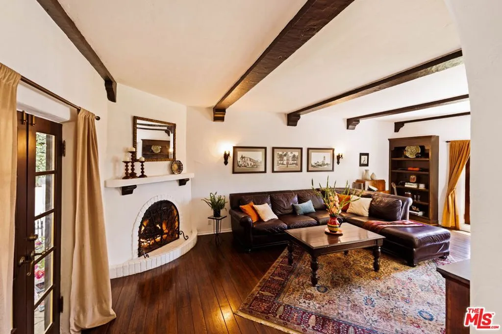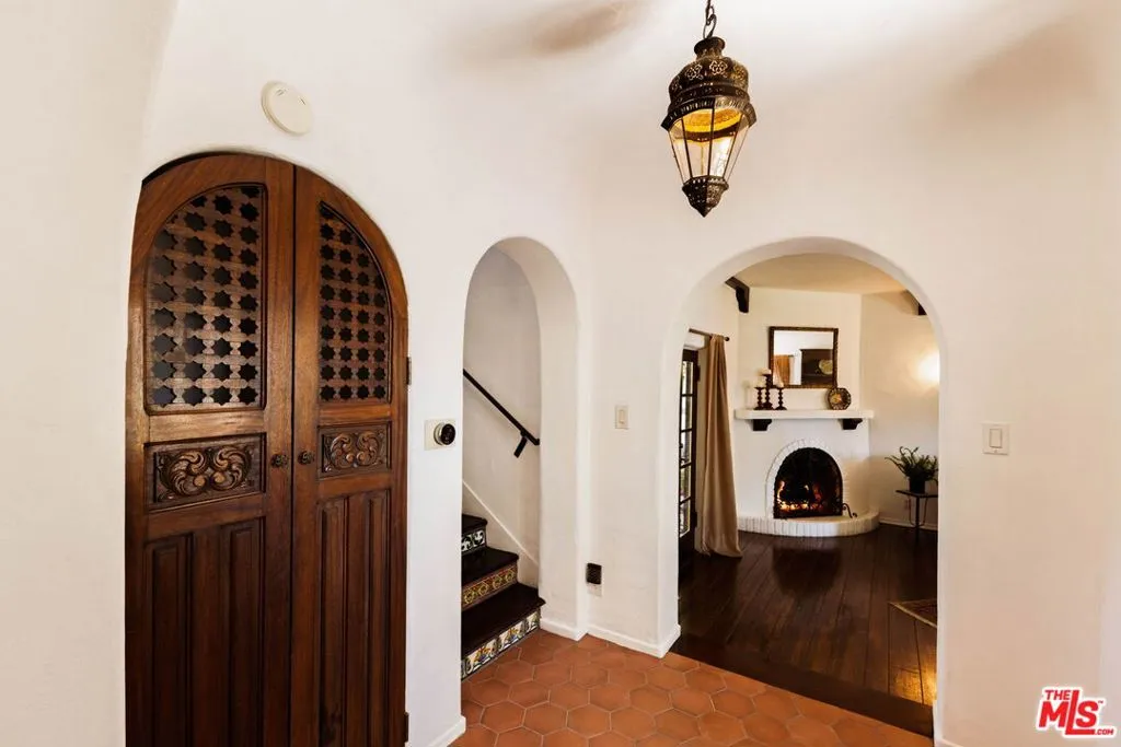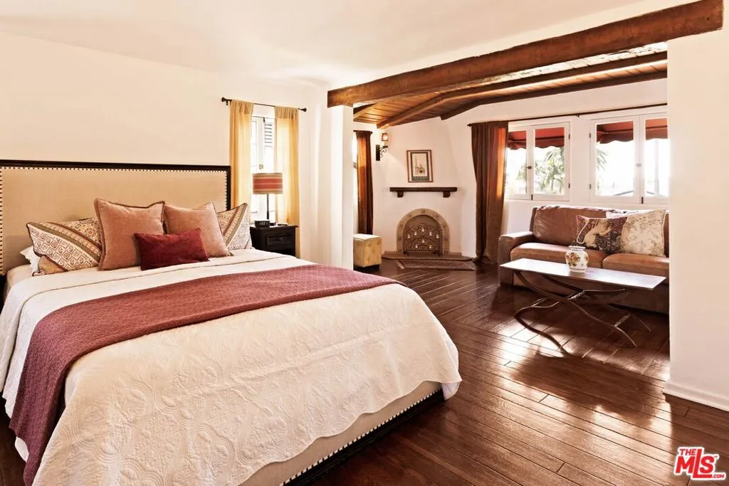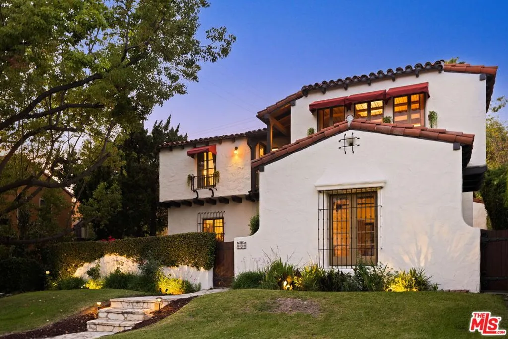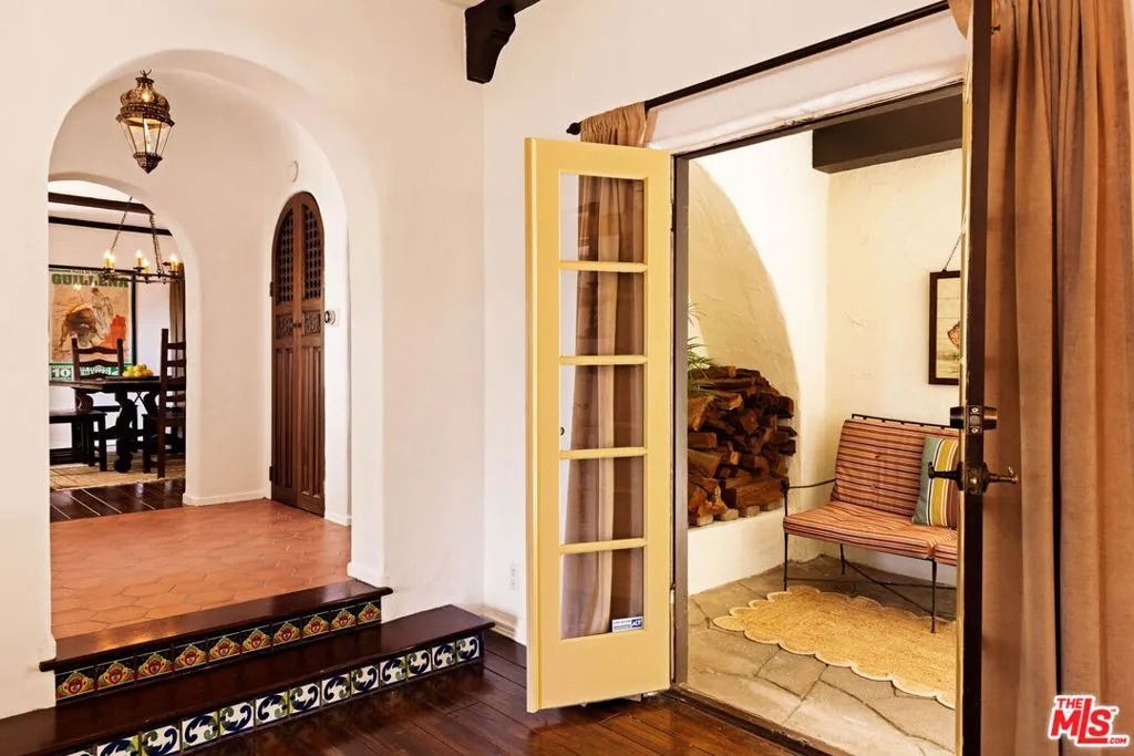 When Ben Sherwood, designer of Los Angeles' famed Snow White cottages, built this home in Rossmoyne, he chose a gently elevated lot and positioned it to capture sweeping views toward Downtown Los Angeles and the Glendale skyline, long before those skylines took shape. He brought with him a clear architectural sensibility rooted in old-world design, shaping a residence defined by intention, detail, and enduring charm. Set in Rossmoyne, the home opens to a front courtyard shaded by a mature tree, where a flagstone path and original mosaic tile at the entry mark a clear and memorable arrival. Exposed wood beams, hardwood floors, and a plaster fireplace give the living room its character, with built-ins and French doors opening back to the courtyard, where shifting light throughout the day adds a quiet, almost storybook quality to the space. Arched openings guide the flow into the dining room, where large French windows bring in natural light and the same beam detail continues overhead. The kitchen sits just off the dining room, with tilework that remains consistent with the home's period and character, and opens to a breakfast nook tucked beneath an arched ceiling with built-in niches, creating a small, tucked-away space that looks out to the garden, where mature roses and a bird bath attract a steady presence of seasonal birds. Upstairs, all three bedrooms are positioned away from the main living areas. The primary suite feels like a private retreat, with a sitting area, a fireplace, and French doors that open to a balcony overlooking the surrounding greenery and distant city views. A walk-in closet and a beautifully appointed bath complete the suite, in keeping with the home's overall character. A loggia-style outdoor living space extends directly from the main living areas, with exposed beams overhead, textured plaster walls, and an arched brick fireplace anchoring the space, which takes on a warm, atmospheric, and dreamy quality as the light fades in the evening. There is space here for both dining and seating, with easy access to additional patio and grassy areas beyond. The casita sits toward the rear of the lot and includes its own bathroom, offering flexibility for guests, a home office, or studio use. The street-to-street lot allows for access from Mountain, where a detached garage is positioned at the rear of the property. Throughout, tilework, plaster walls, wood beams, and arched transitions remain consistent with the home's period and character, reflecting Sherwood's approach to design and proportion. Later additions, including the casita and primary expansion, were also completed under his direction, maintaining continuity with the original structure.