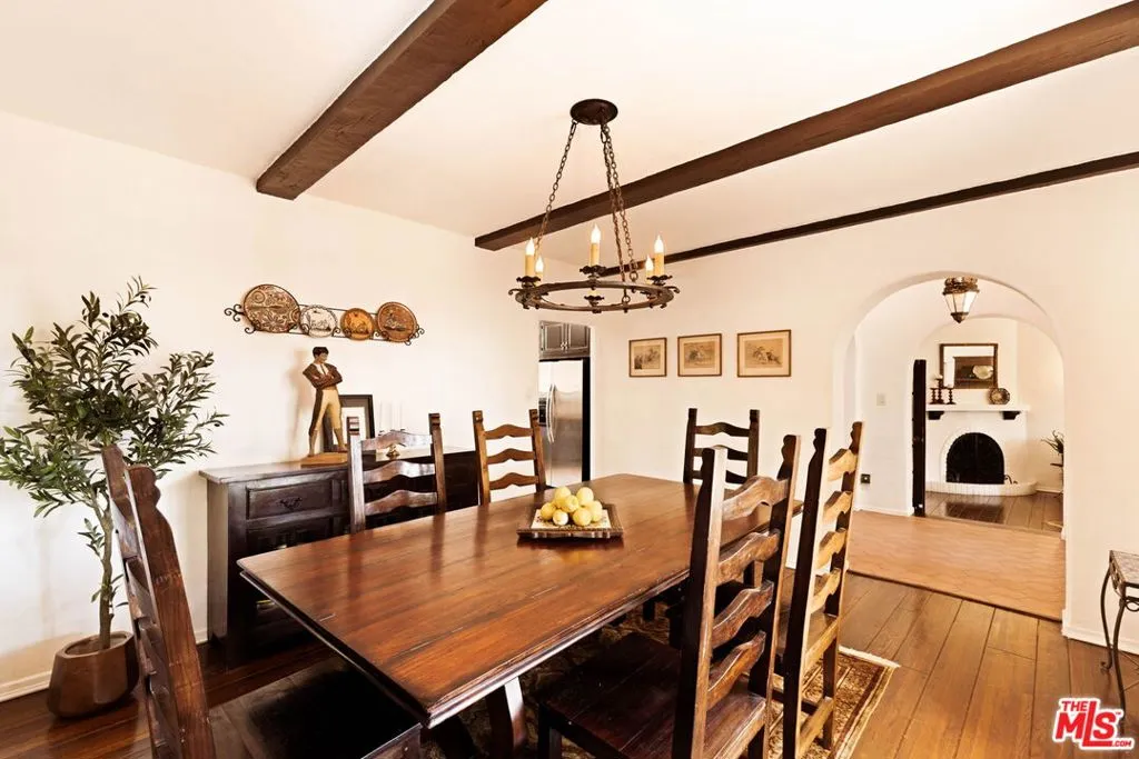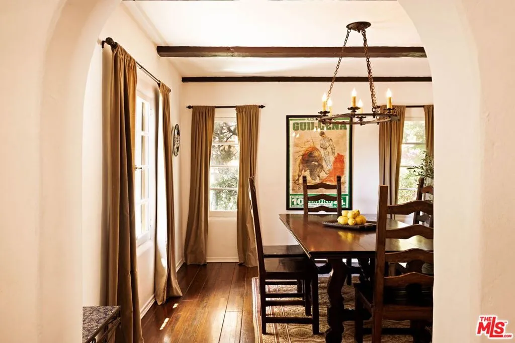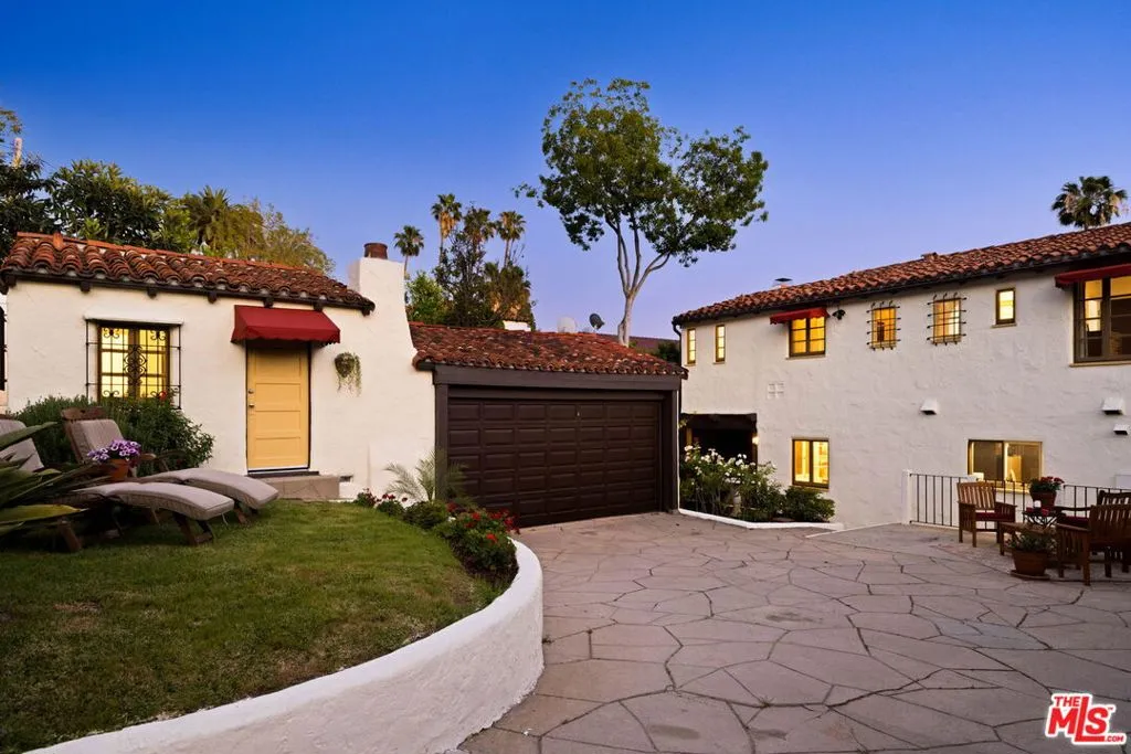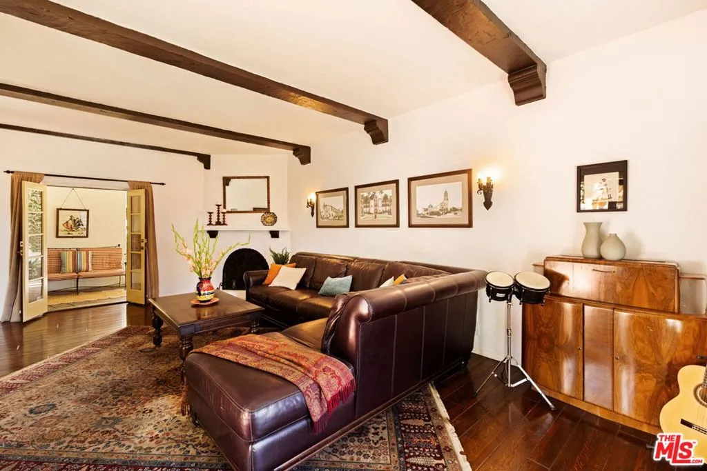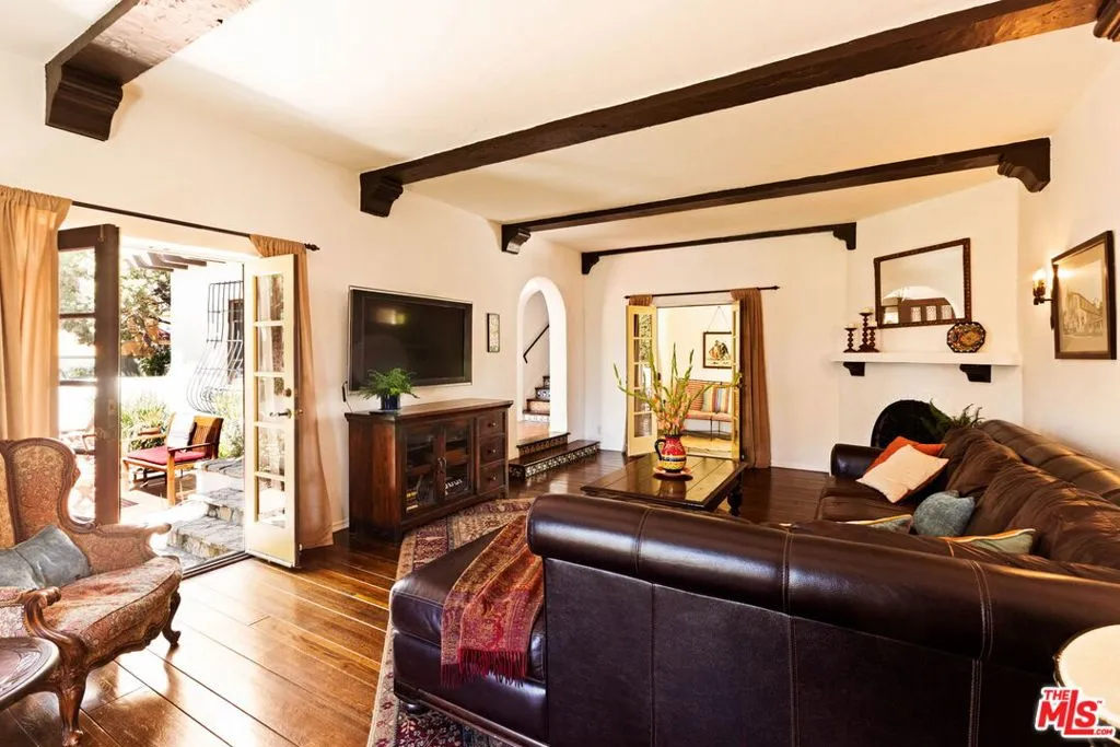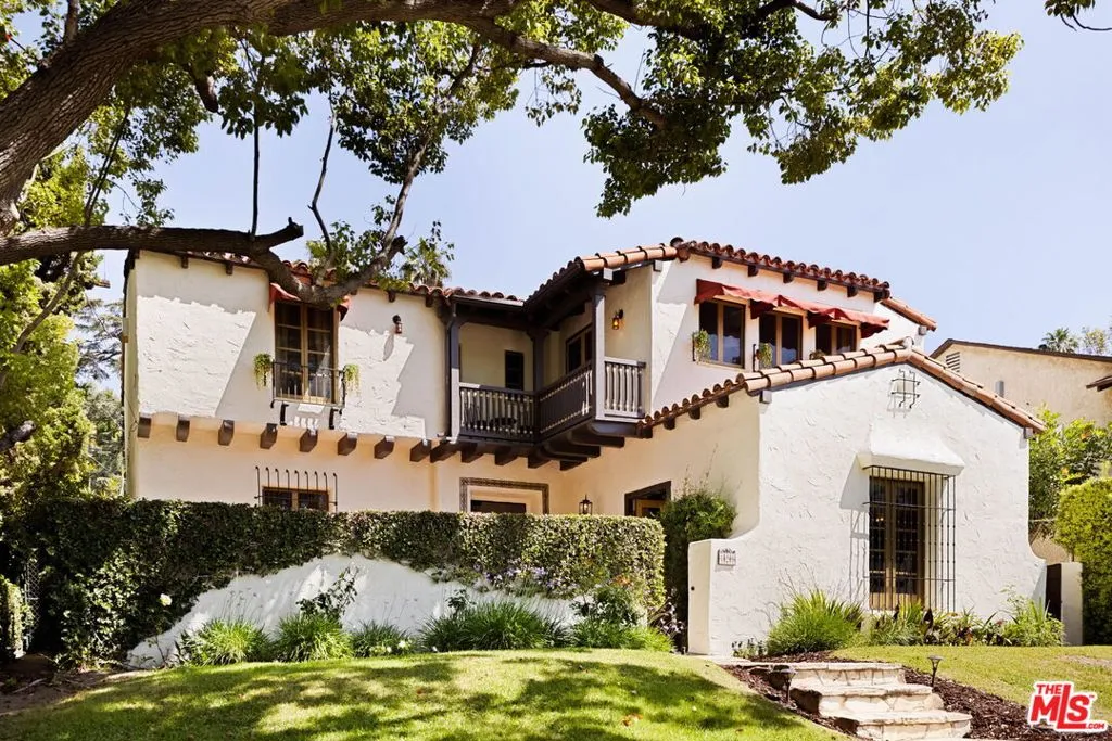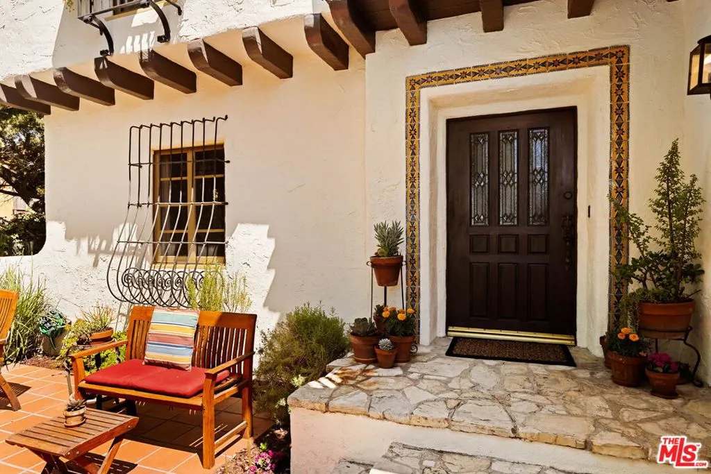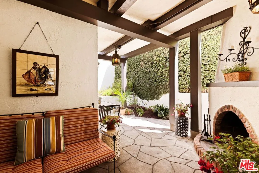 When Ben Sherwood, designer of Los Angeles' famed Snow White cottages, built this home in Rossmoyne, he chose a gently elevated lot and positioned it to capture sweeping views toward Downtown Los Angeles and the Glendale skyline, long before those skylines took shape. He brought with him a clear architectural sensibility rooted in old-world design, shaping a residence defined by intention, detail, and enduring charm. Set in Rossmoyne, the home opens to a front courtyard shaded by a mature tree, where a flagstone path and original mosaic tile at the entry mark a clear and memorable arrival. Exposed wood beams, hardwood floors, and a plaster fireplace give the living room its character, with built-ins and French doors opening back to the courtyard, where shifting light throughout the day adds a quiet, almost storybook quality to the space. Arched openings guide the flow into the dining room, where large French windows bring in natural light and the same beam detail continues overhead. The kitchen sits just off the dining room, with tilework that remains consistent with the home's period and character, and opens to a breakfast nook tucked beneath an arched ceiling with built-in niches, creating a small, tucked-away space that looks out to the garden, where mature roses and a bird bath attract a steady presence of seasonal birds. Upstairs, all three bedrooms are positioned away from the main living areas. The primary suite feels like a private retreat, with a sitting area, a fireplace, and French doors that open to a balcony overlooking the surrounding greenery and distant city views. A walk-in closet and a beautifully appointed bath complete the suite, in keeping with the home's overall character. A loggia-style outdoor living space extends directly from the main living areas, with exposed beams overhead, textured plaster walls, and an arched brick fireplace anchoring the space, which takes on a warm, atmospheric, and dreamy quality as the light fades in the evening. There is space here for both dining and seating, with easy access to additional patio and grassy areas beyond. The casita sits toward the rear of the lot and includes its own bathroom, offering flexibility for guests, a home office, or studio use. The street-to-street lot allows for access from Mountain, where a detached garage is positioned at the rear of the property. Throughout, tilework, plaster walls, wood beams, and arched transitions remain consistent with the home's period and character, reflecting Sherwood's approach to design and proportion. Later additions, including the casita and primary expansion, were also completed under his direction, maintaining continuity with the original structure.