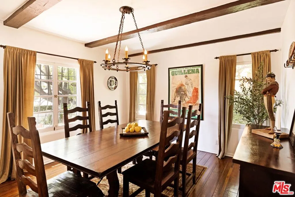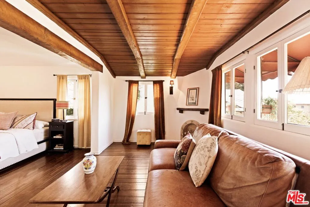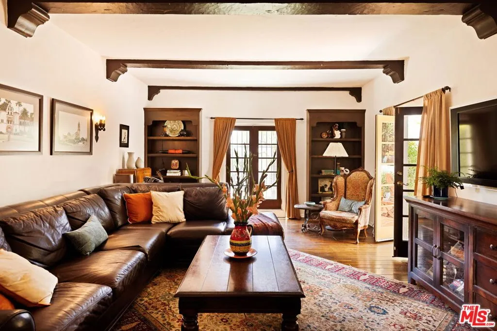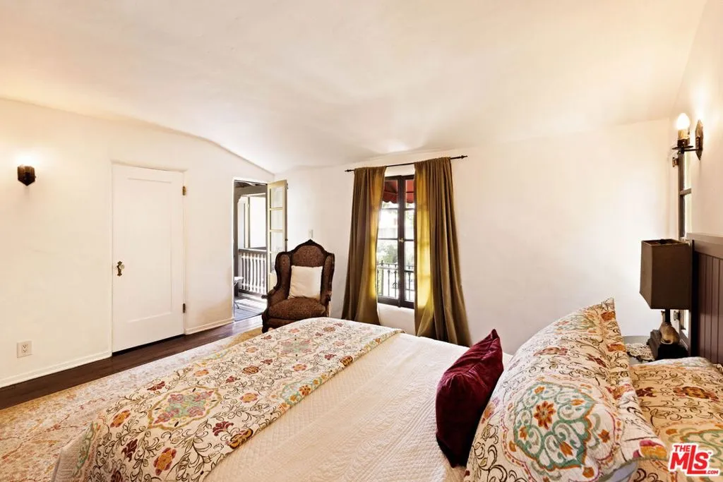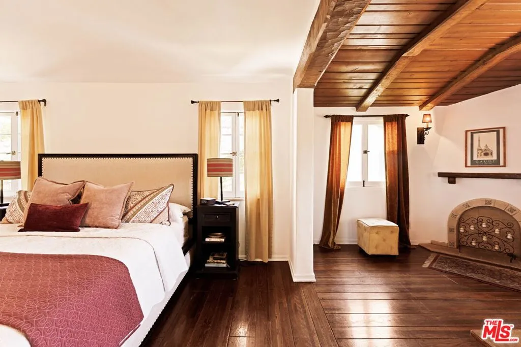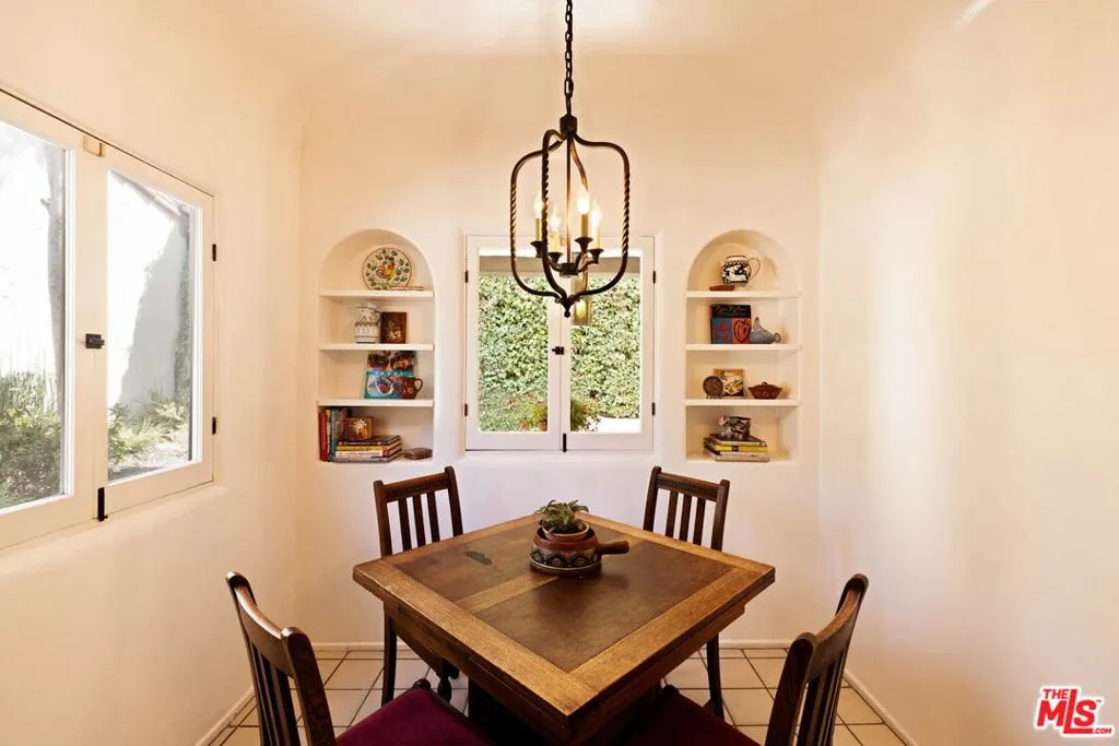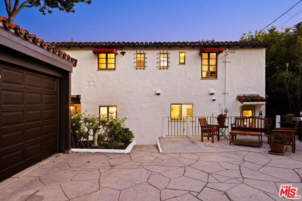 When Ben Sherwood, designer of Los Angeles' famed Snow White cottages, built this home in Rossmoyne, he chose a gently elevated lot and positioned it to capture sweeping views toward Downtown Los Angeles and the Glendale skyline, long before those skylines took shape. He brought with him a clear architectural sensibility rooted in old-world design, shaping a residence defined by intention, detail, and enduring charm. Set in Rossmoyne, the home opens to a front courtyard shaded by a mature tree, where a flagstone path and original mosaic tile at the entry mark a clear and memorable arrival. Exposed wood beams, hardwood floors, and a plaster fireplace give the living room its character, with built-ins and French doors opening back to the courtyard, where shifting light throughout the day adds a quiet, almost storybook quality to the space. Arched openings guide the flow into the dining room, where large French windows bring in natural light and the same beam detail continues overhead. The kitchen sits just off the dining room, with tilework that remains consistent with the home's period and character, and opens to a breakfast nook tucked beneath an arched ceiling with built-in niches, creating a small, tucked-away space that looks out to the garden, where mature roses and a bird bath attract a steady presence of seasonal birds. Upstairs, all three bedrooms are positioned away from the main living areas. The primary suite feels like a private retreat, with a sitting area, a fireplace, and French doors that open to a balcony overlooking the surrounding greenery and distant city views. A walk-in closet and a beautifully appointed bath complete the suite, in keeping with the home's overall character. A loggia-style outdoor living space extends directly from the main living areas, with exposed beams overhead, textured plaster walls, and an arched brick fireplace anchoring the space, which takes on a warm, atmospheric, and dreamy quality as the light fades in the evening. There is space here for both dining and seating, with easy access to additional patio and grassy areas beyond. The casita sits toward the rear of the lot and includes its own bathroom, offering flexibility for guests, a home office, or studio use. The street-to-street lot allows for access from Mountain, where a detached garage is positioned at the rear of the property. Throughout, tilework, plaster walls, wood beams, and arched transitions remain consistent with the home's period and character, reflecting Sherwood's approach to design and proportion. Later additions, including the casita and primary expansion, were also completed under his direction, maintaining continuity with the original structure.