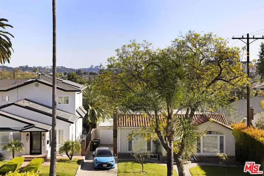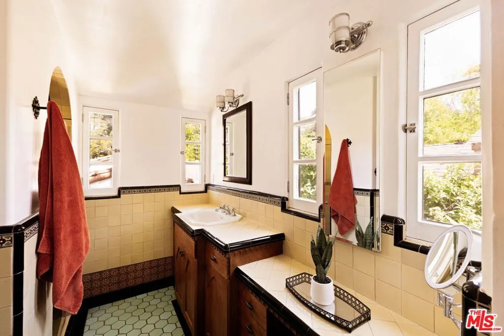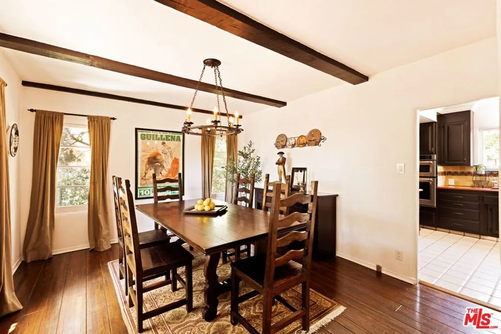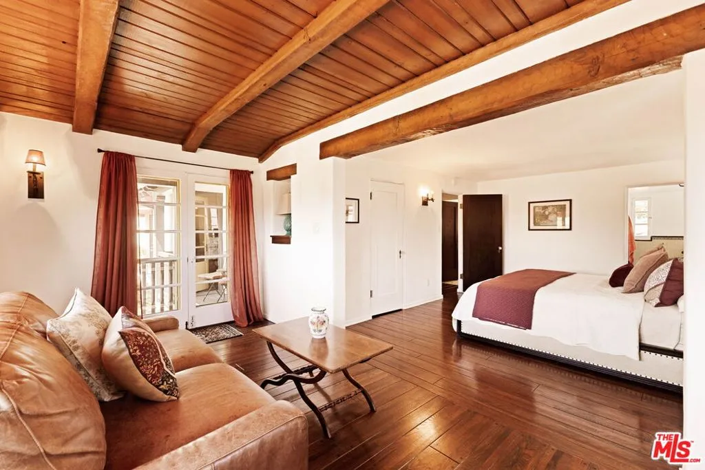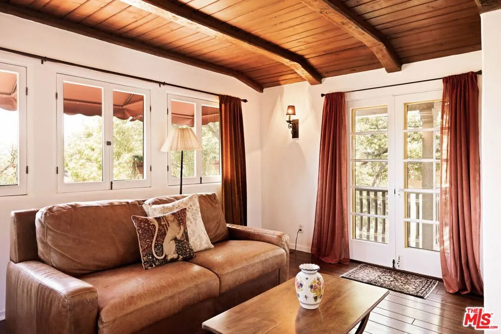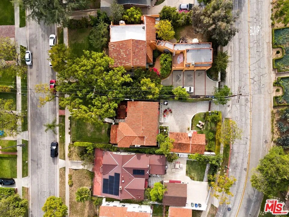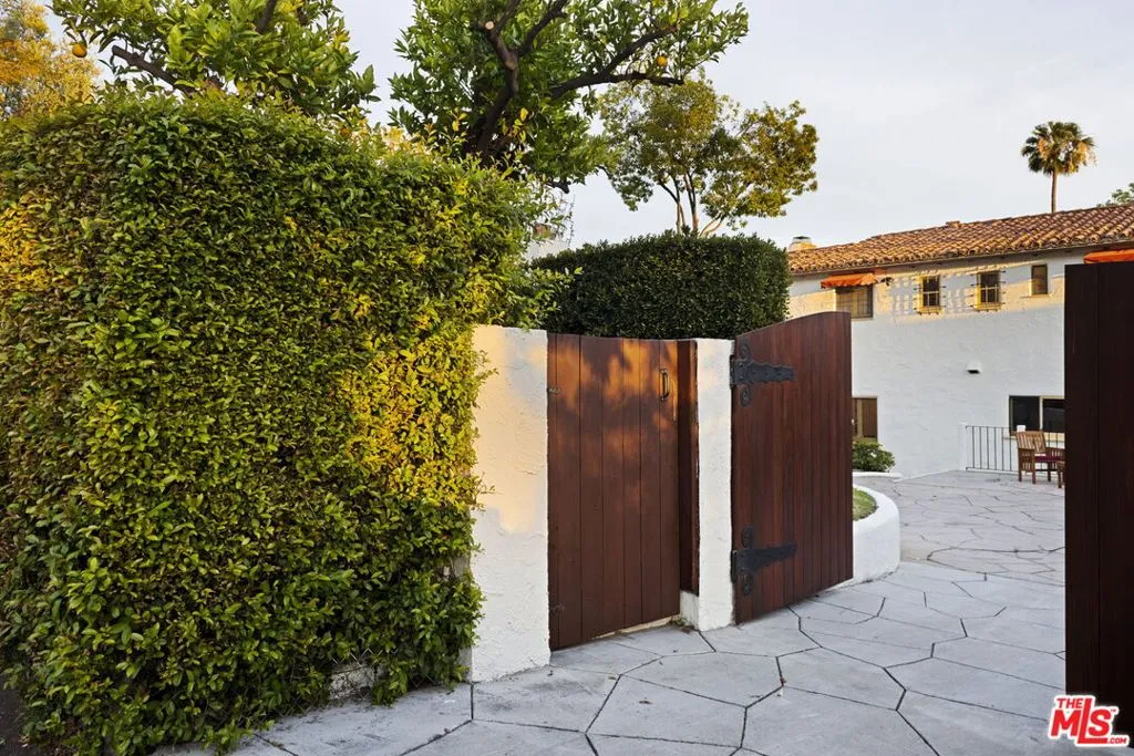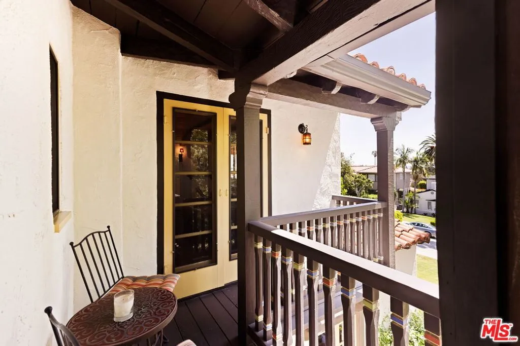 When Ben Sherwood, designer of Los Angeles' famed Snow White cottages, built this home in Rossmoyne, he chose a gently elevated lot and positioned it to capture sweeping views toward Downtown Los Angeles and the Glendale skyline, long before those skylines took shape. He brought with him a clear architectural sensibility rooted in old-world design, shaping a residence defined by intention, detail, and enduring charm. Set in Rossmoyne, the home opens to a front courtyard shaded by a mature tree, where a flagstone path and original mosaic tile at the entry mark a clear and memorable arrival. Exposed wood beams, hardwood floors, and a plaster fireplace give the living room its character, with built-ins and French doors opening back to the courtyard, where shifting light throughout the day adds a quiet, almost storybook quality to the space. Arched openings guide the flow into the dining room, where large French windows bring in natural light and the same beam detail continues overhead. The kitchen sits just off the dining room, with tilework that remains consistent with the home's period and character, and opens to a breakfast nook tucked beneath an arched ceiling with built-in niches, creating a small, tucked-away space that looks out to the garden, where mature roses and a bird bath attract a steady presence of seasonal birds. Upstairs, all three bedrooms are positioned away from the main living areas. The primary suite feels like a private retreat, with a sitting area, a fireplace, and French doors that open to a balcony overlooking the surrounding greenery and distant city views. A walk-in closet and a beautifully appointed bath complete the suite, in keeping with the home's overall character. A loggia-style outdoor living space extends directly from the main living areas, with exposed beams overhead, textured plaster walls, and an arched brick fireplace anchoring the space, which takes on a warm, atmospheric, and dreamy quality as the light fades in the evening. There is space here for both dining and seating, with easy access to additional patio and grassy areas beyond. The casita sits toward the rear of the lot and includes its own bathroom, offering flexibility for guests, a home office, or studio use. The street-to-street lot allows for access from Mountain, where a detached garage is positioned at the rear of the property. Throughout, tilework, plaster walls, wood beams, and arched transitions remain consistent with the home's period and character, reflecting Sherwood's approach to design and proportion. Later additions, including the casita and primary expansion, were also completed under his direction, maintaining continuity with the original structure.