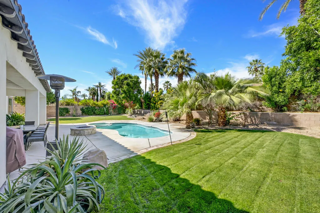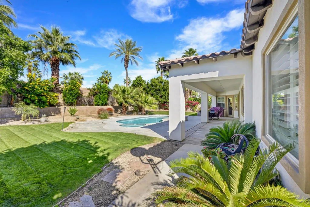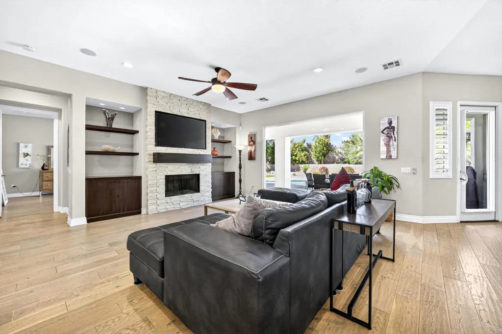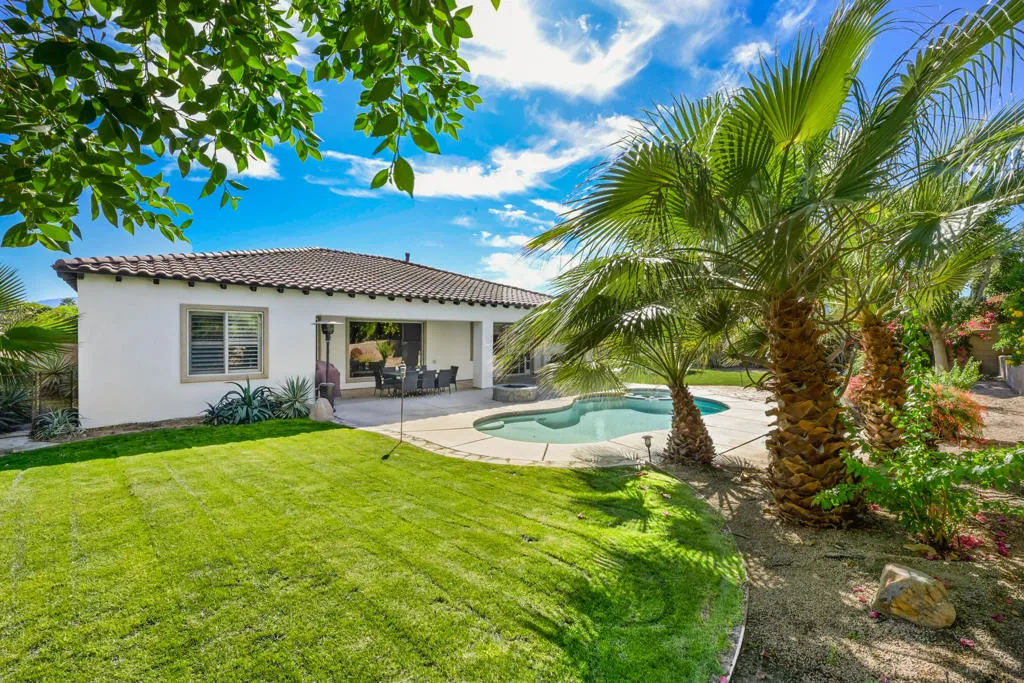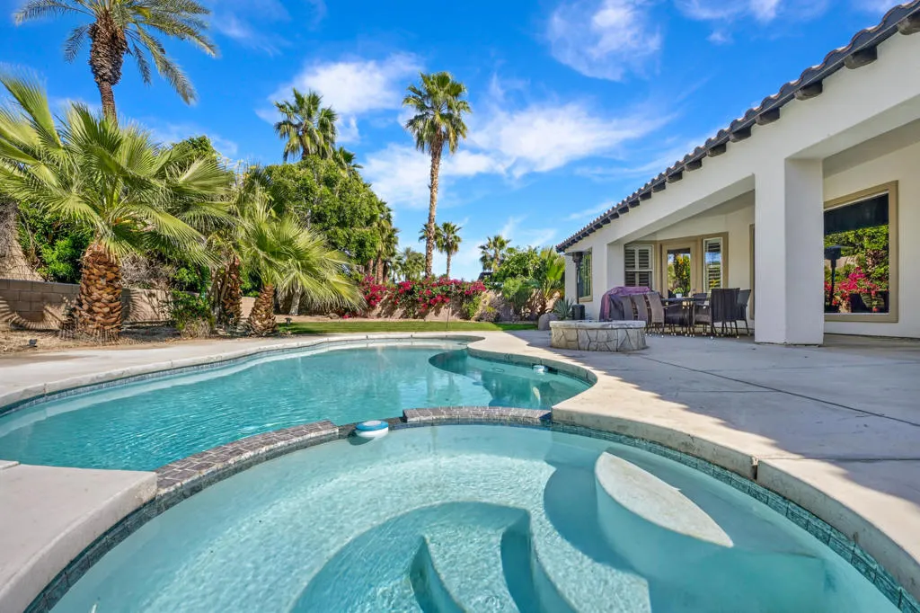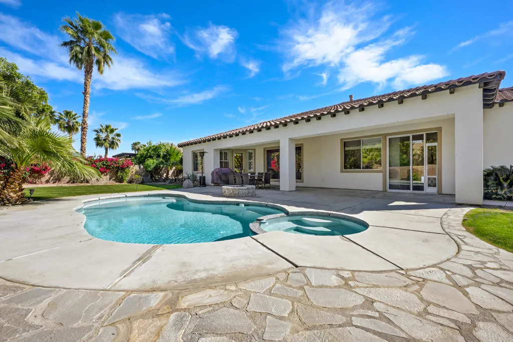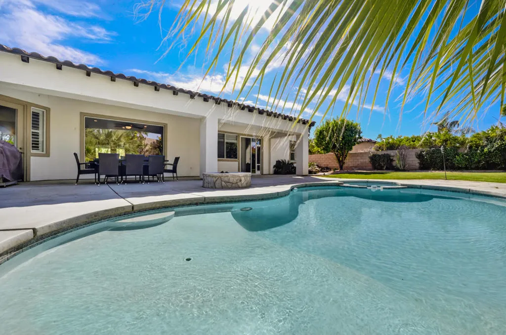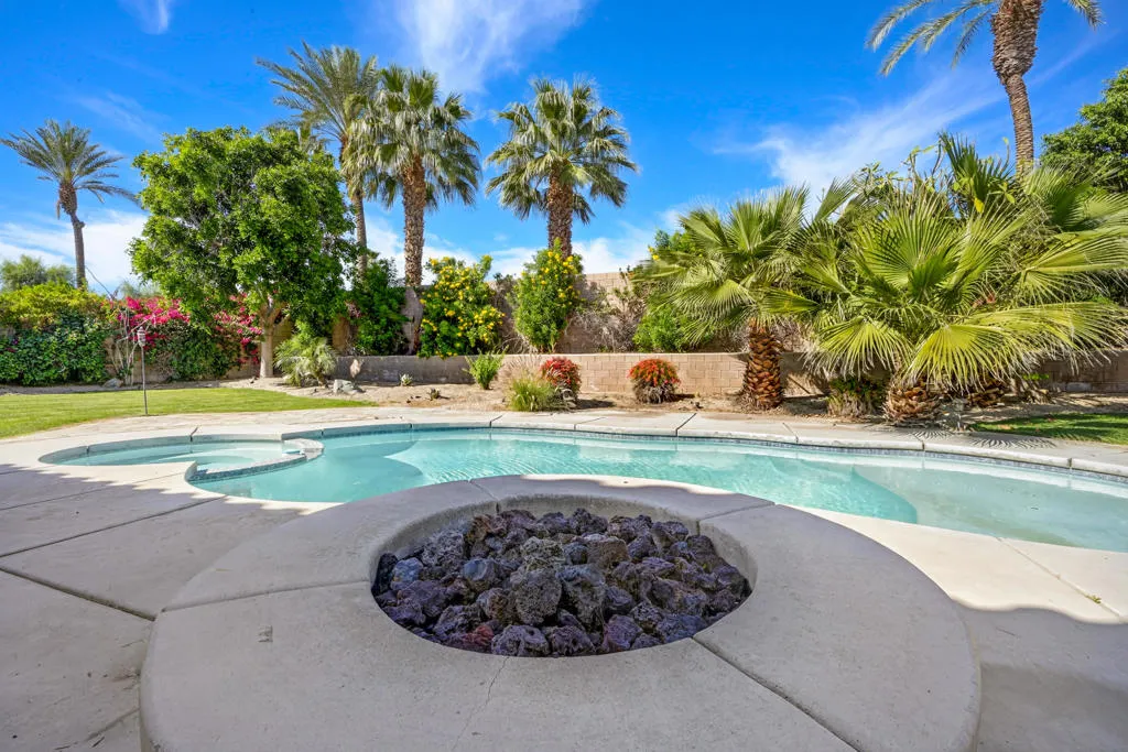 Set within the desirable community of The Orchard in Indio, this well-located 4 bedroom, 3 bath residence presents a compelling opportunity to update and tailor a home to your personal style. Offering a functional layout and generous living spaces, the property blends existing upgrades with excellent potential for further enhancement. Inside, wide-plank wood flooring adds warmth and character, while the open-concept great room serves as the heart of the home--featuring custom built-ins, a stacked stone fireplace, and a large picture window that fills the space with natural light. The kitchen is equipped with GE Profile appliances and opens seamlessly to the main living areas, ideal for both everyday living and entertaining. Wood shutters throughout add a timeless, cohesive touch. Step outside to a private backyard designed for relaxed desert living, complete with a pool and spa, along with a built-in firepit--perfect for hosting or unwinding under the stars. Originally updated in 2017, the home offers a solid foundation with room to elevate and customize. Whether you're seeking a primary residence, seasonal getaway, or investment opportunity, this property delivers flexibility and value. Short-term rental potential during festival season may be possible, subject to local regulations.