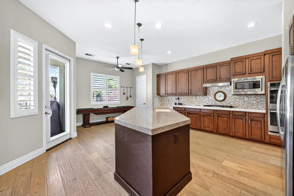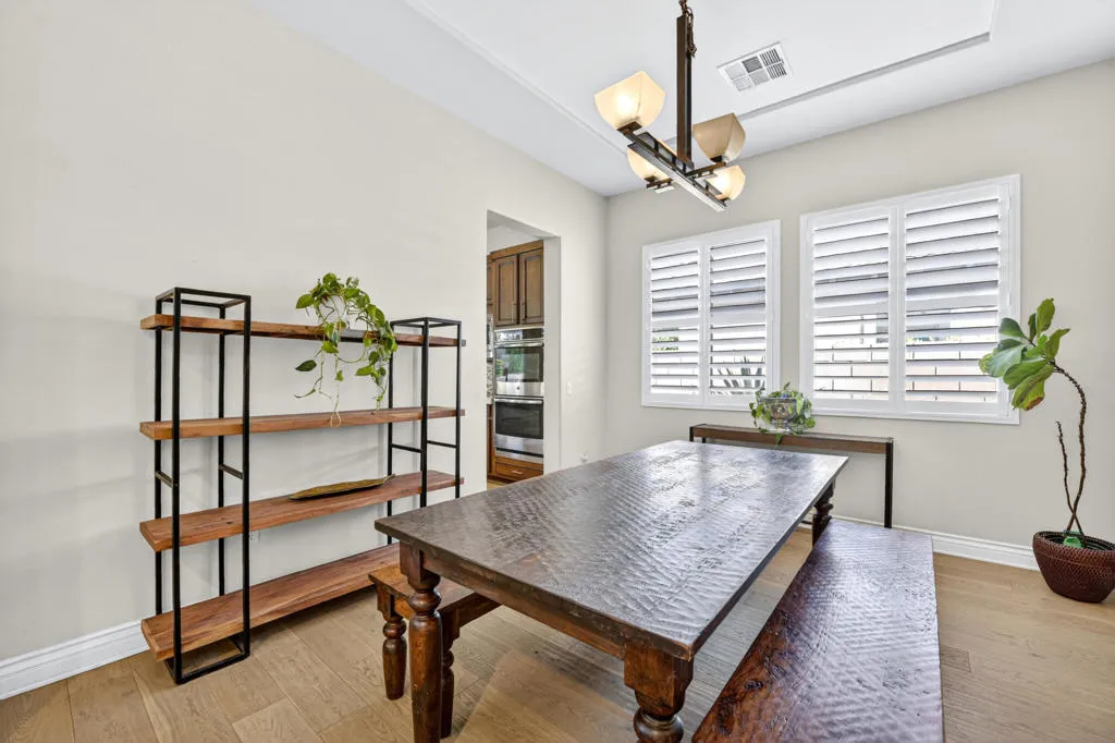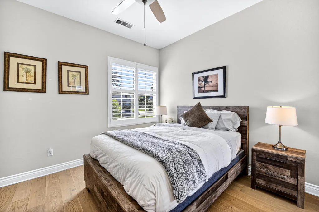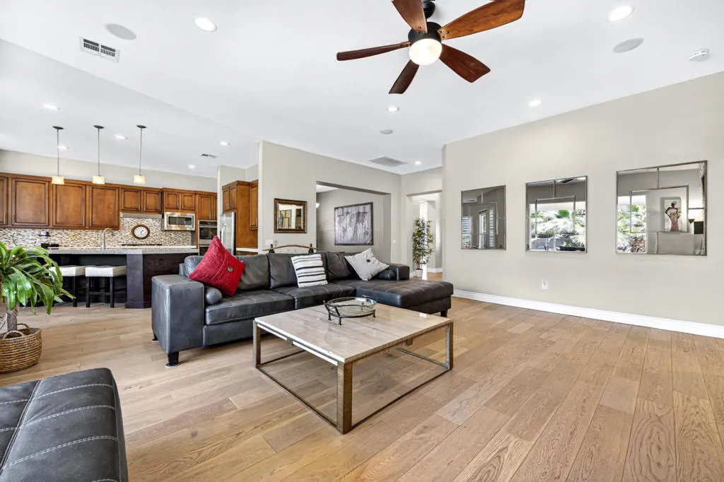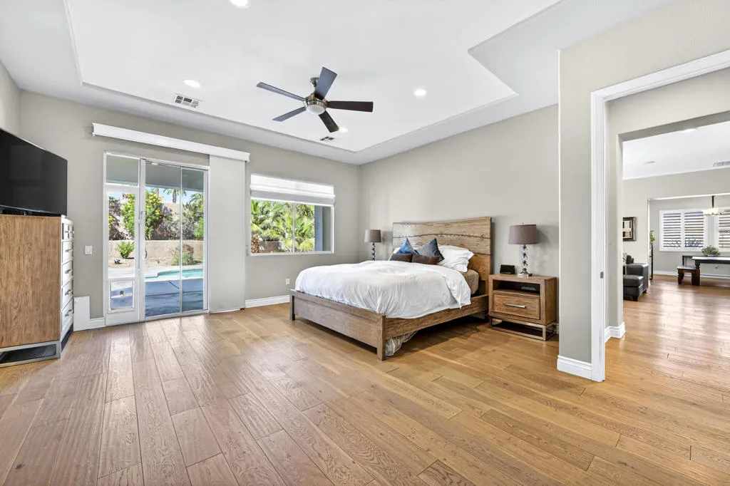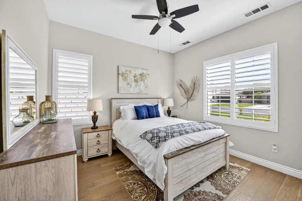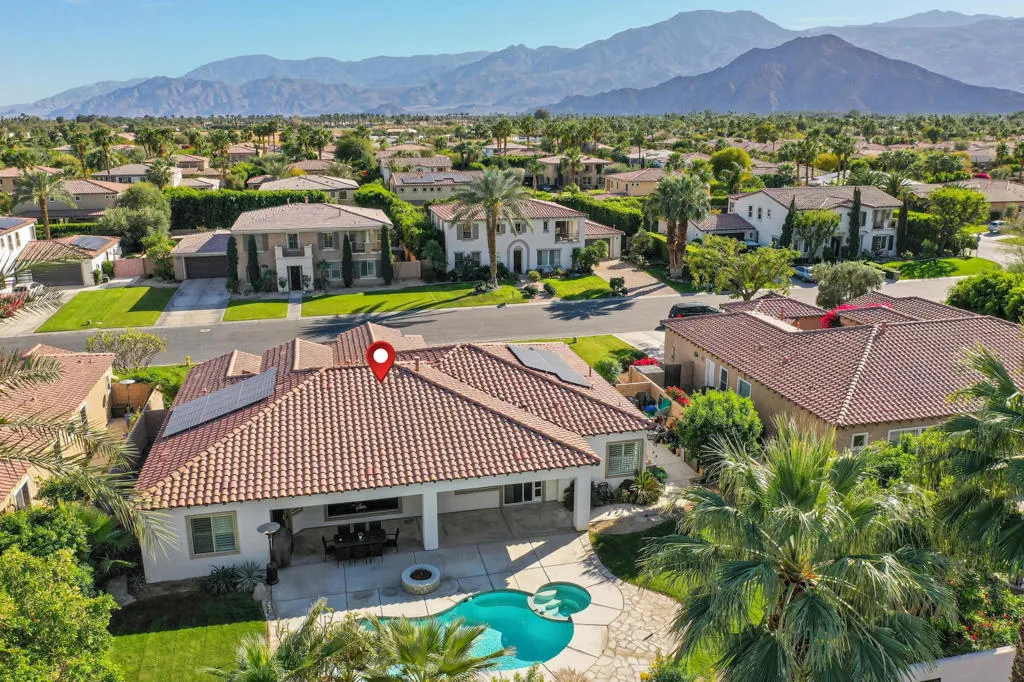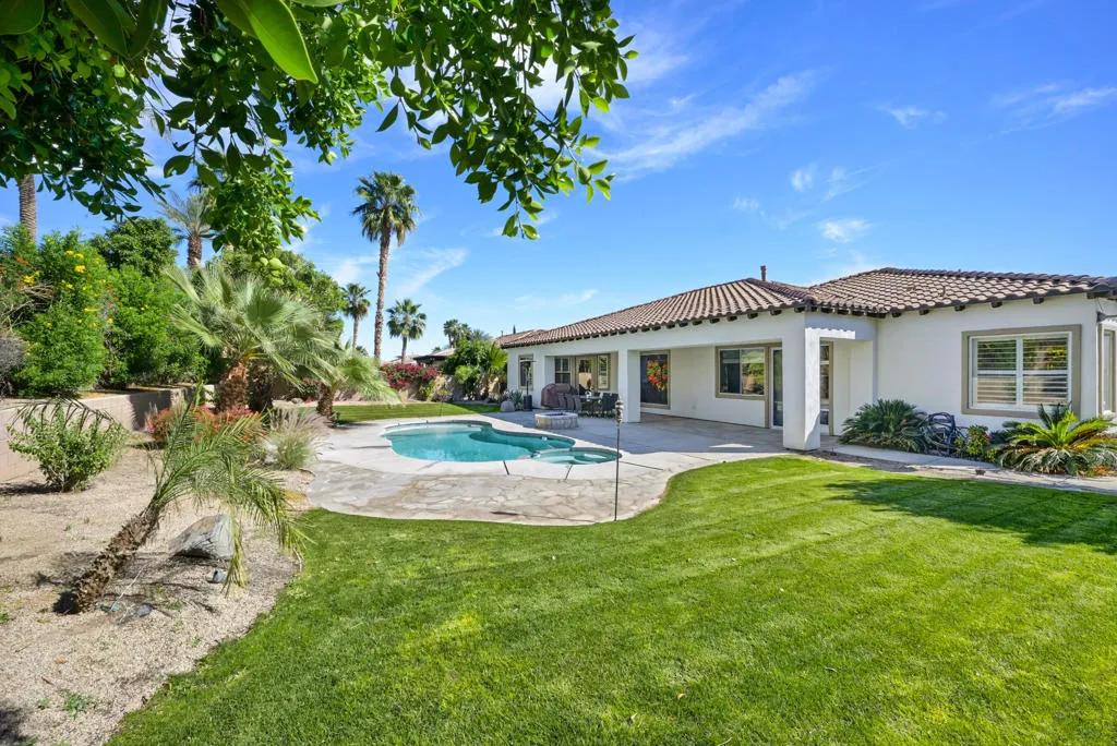 Set within the desirable community of The Orchard in Indio, this well-located 4 bedroom, 3 bath residence presents a compelling opportunity to update and tailor a home to your personal style. Offering a functional layout and generous living spaces, the property blends existing upgrades with excellent potential for further enhancement. Inside, wide-plank wood flooring adds warmth and character, while the open-concept great room serves as the heart of the home--featuring custom built-ins, a stacked stone fireplace, and a large picture window that fills the space with natural light. The kitchen is equipped with GE Profile appliances and opens seamlessly to the main living areas, ideal for both everyday living and entertaining. Wood shutters throughout add a timeless, cohesive touch. Step outside to a private backyard designed for relaxed desert living, complete with a pool and spa, along with a built-in firepit--perfect for hosting or unwinding under the stars. Originally updated in 2017, the home offers a solid foundation with room to elevate and customize. Whether you're seeking a primary residence, seasonal getaway, or investment opportunity, this property delivers flexibility and value. Short-term rental potential during festival season may be possible, subject to local regulations.