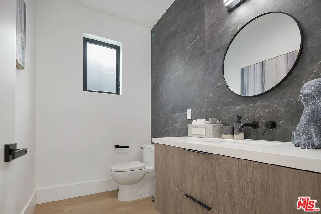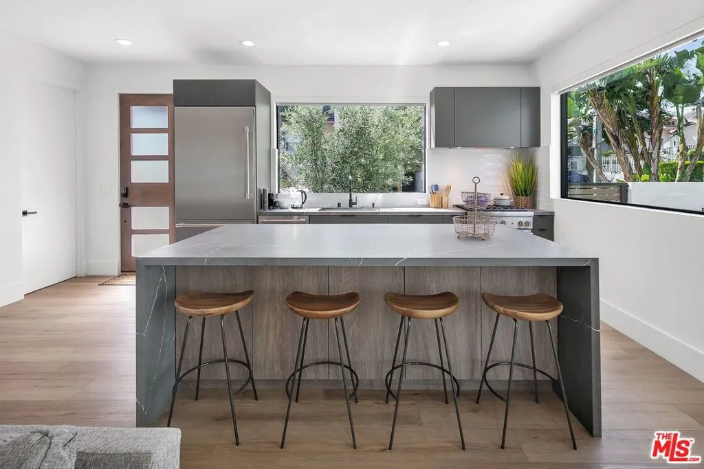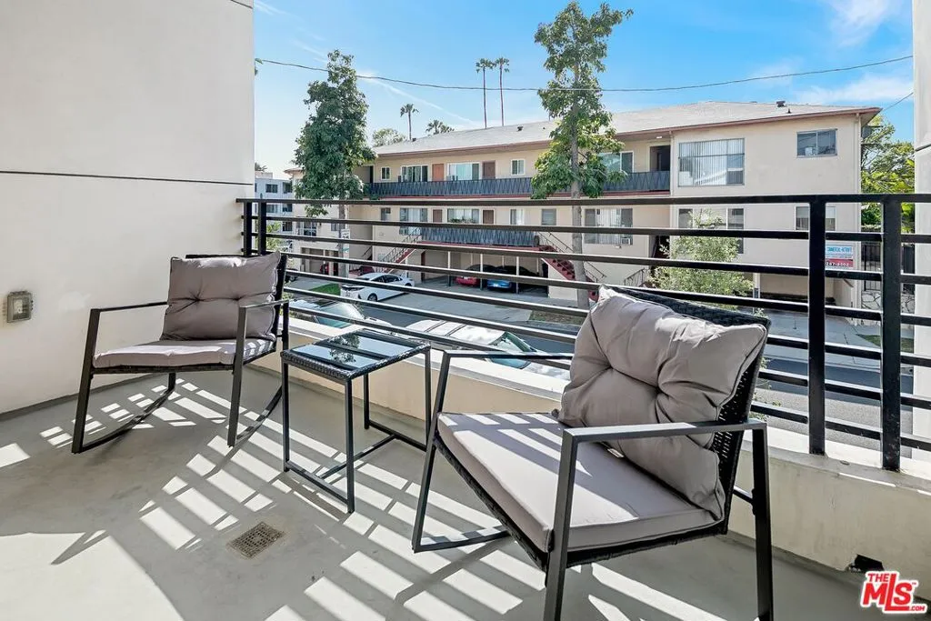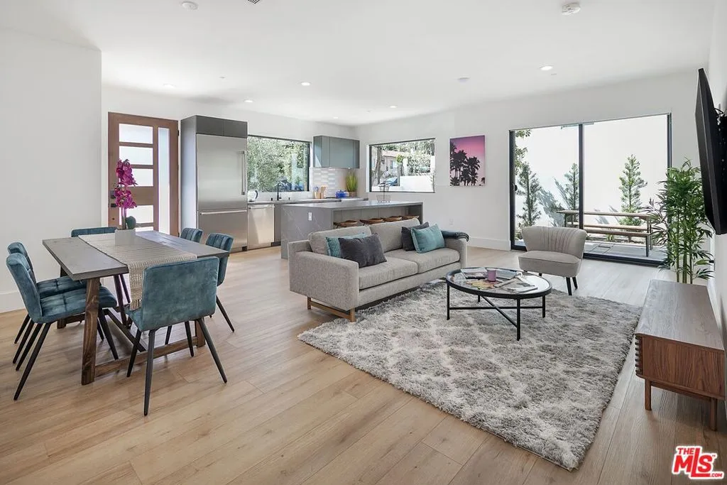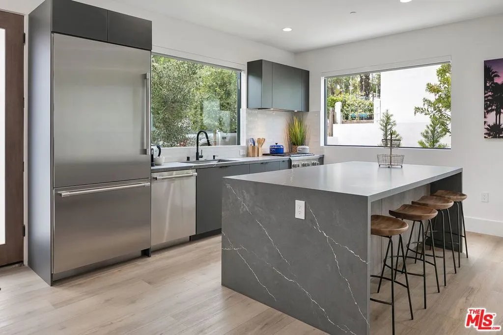 FULLY-FURNISHED, FULL-EQUIPPED. AVAILABLE FOR SHORT AND LONG STAYS brand-new construction in a central West Hollywood location! Walk through the front door to the living space. Relax on the couch and watch your favorite streaming service or local channel on the large flat-screen TV. Cook a meal in the large kitchen with stainless-steel Thermador appliances. Enjoy your food at the gorgeous kitchen island with bar stool seating for 4, or gather in the dining area with a dining table and seating for 6. The first bedroom is situated next to the living room on the first floor, making it easily accessible for anyone. Rest on the Queen bed and enjoy the spa-like attached bathroom with 2 sinks and a shower. Head up the stairs to find the Master suite with a King bed, Smart TV, spacious walk-in closet, and private balcony with lounge furniture. The attached Master bath offers 2 sinks and a shower. Both bedrooms provide room-darkening shades for the best comfort and sleep possible. Step outside to the private patio and enjoy a snack under the tress at the picnic table. The unit offers garage parking for 2 vehicles and laundry room with a washer and dryer. Recessed lighting and hardwood flooring found throughout the home.