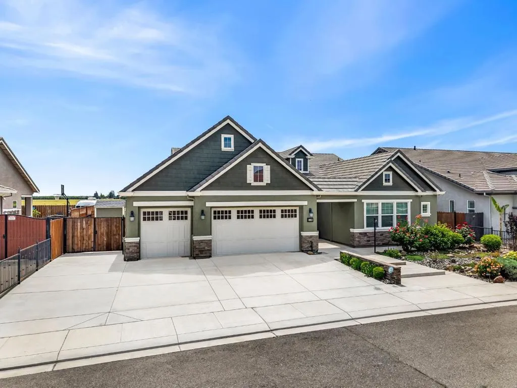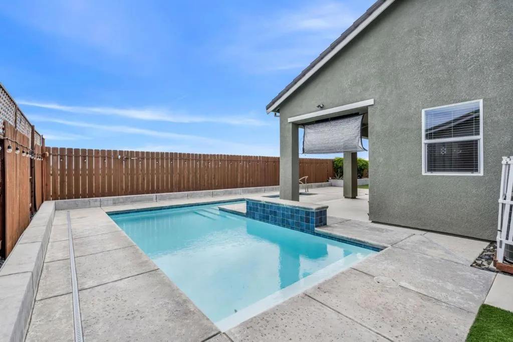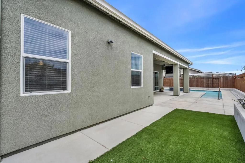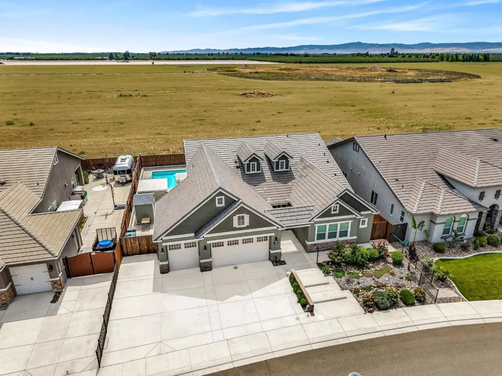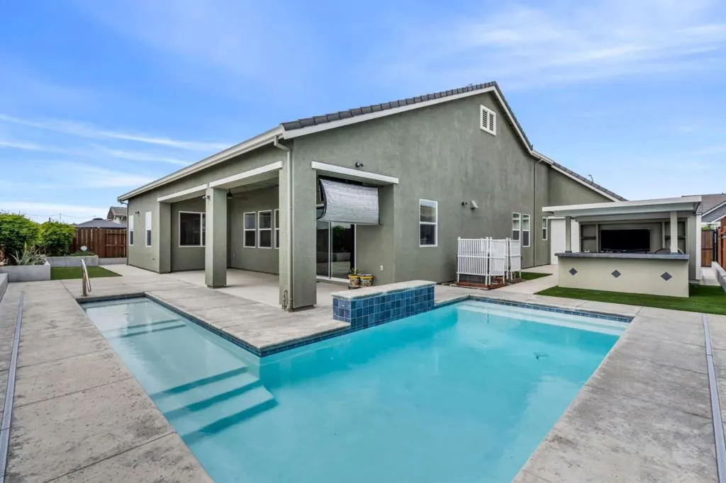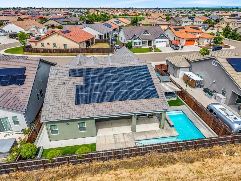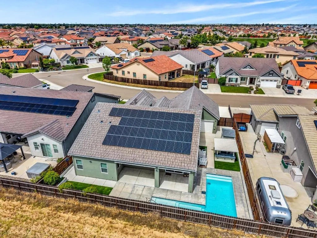 New listing in The Solera Collection! Crafted by Atherton Homes Phase #3 Patagonia Model, this elegantly appointed four-bedroom, 4-bathroom residence offers 2,718 square feet on a generous lot with RV parking in one of Manteca's most sought-after neighborhoods in RIPON school district. Inside, dramatic 12-13-foot coffered ceilings, a light-filled open floor plan, and refined finishes create an elevated sense of space for both everyday living and polished entertaining. Every detail feels curated, yet wonderfully livable. The kitchen and great room extend effortlessly to a resort-caliber backyard with an in-ground Gunite saltwater pool with lighting, an outdoor barbecue island with television, a gas fire pit, and a Tough Shed for discreet storage. OWNED SOLAR system, central heating & Air, a tankless water heater, Whole house fan, water filter & softener system, smart security flood lights with Ring cameras, and a (3) three-car garage with insulated doors enhance comfort and convenience. Moments from shopping at Walmart Supercenter and recreation at Great Wolf Lodge, this exceptional home delivers luxury with ease. Come experience this remarkable home in person and schedule your private tour today.