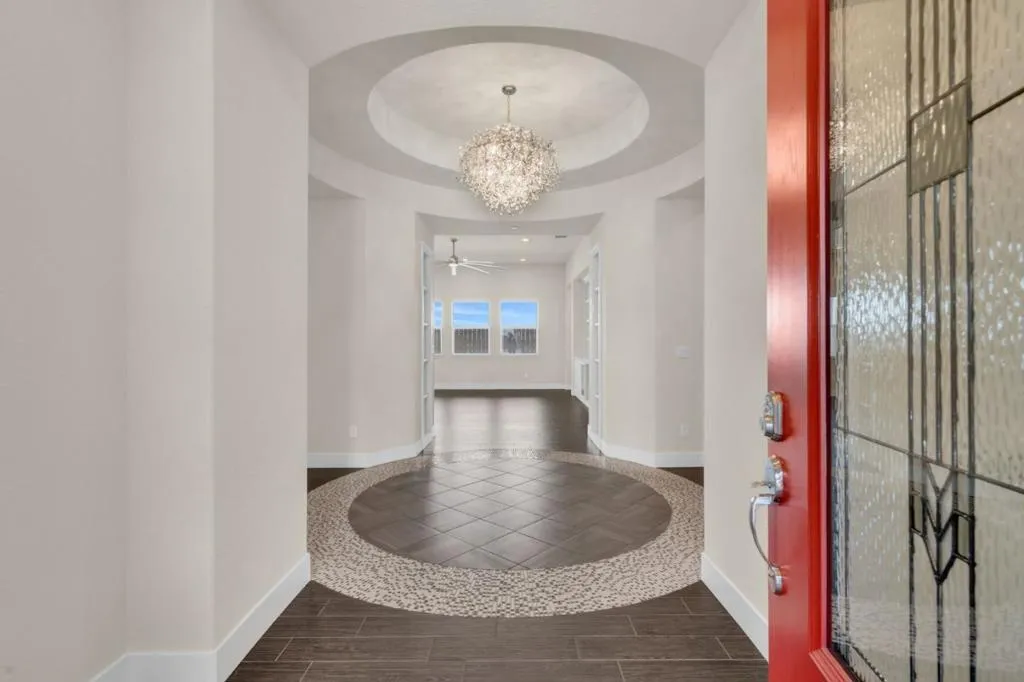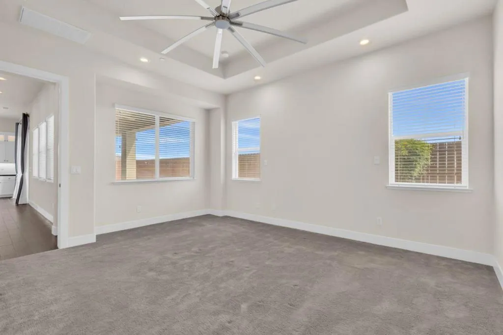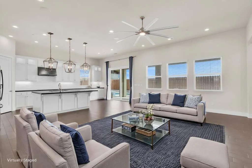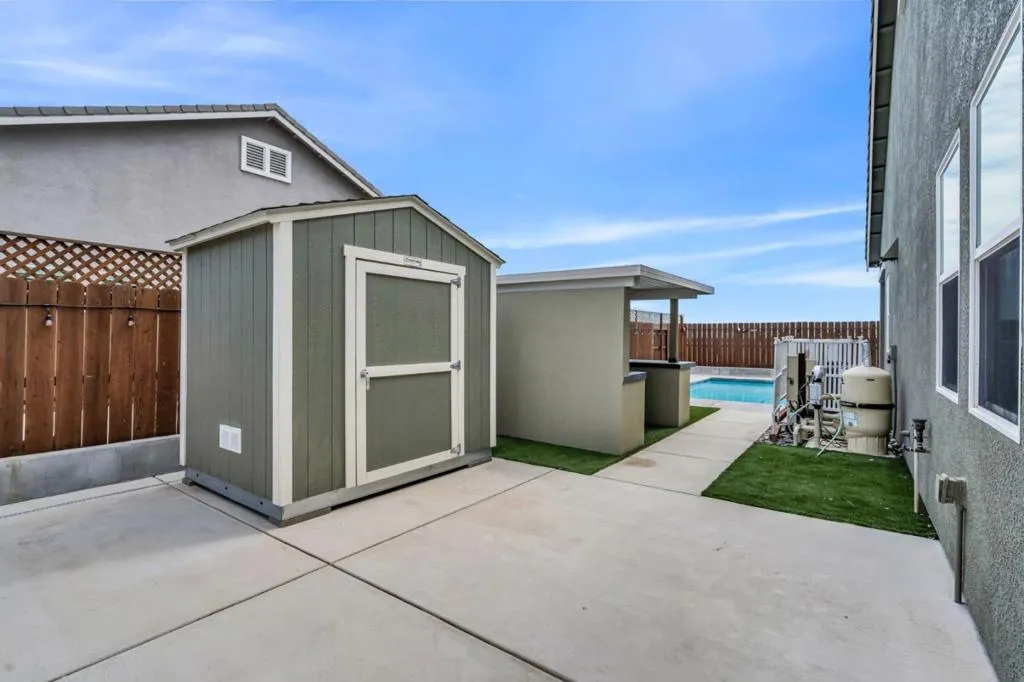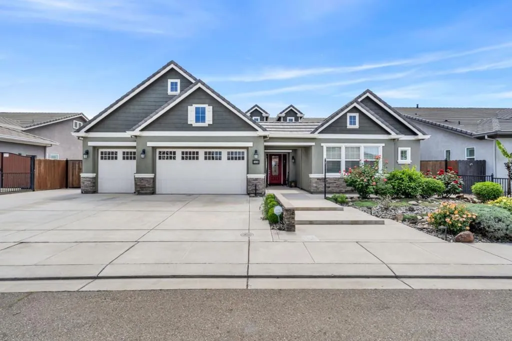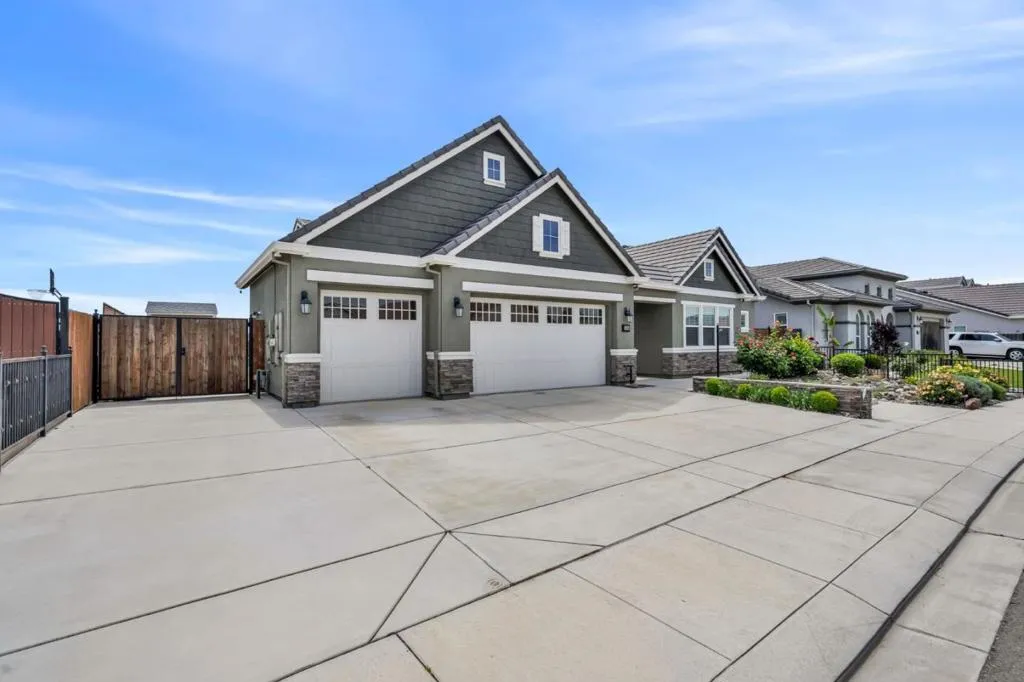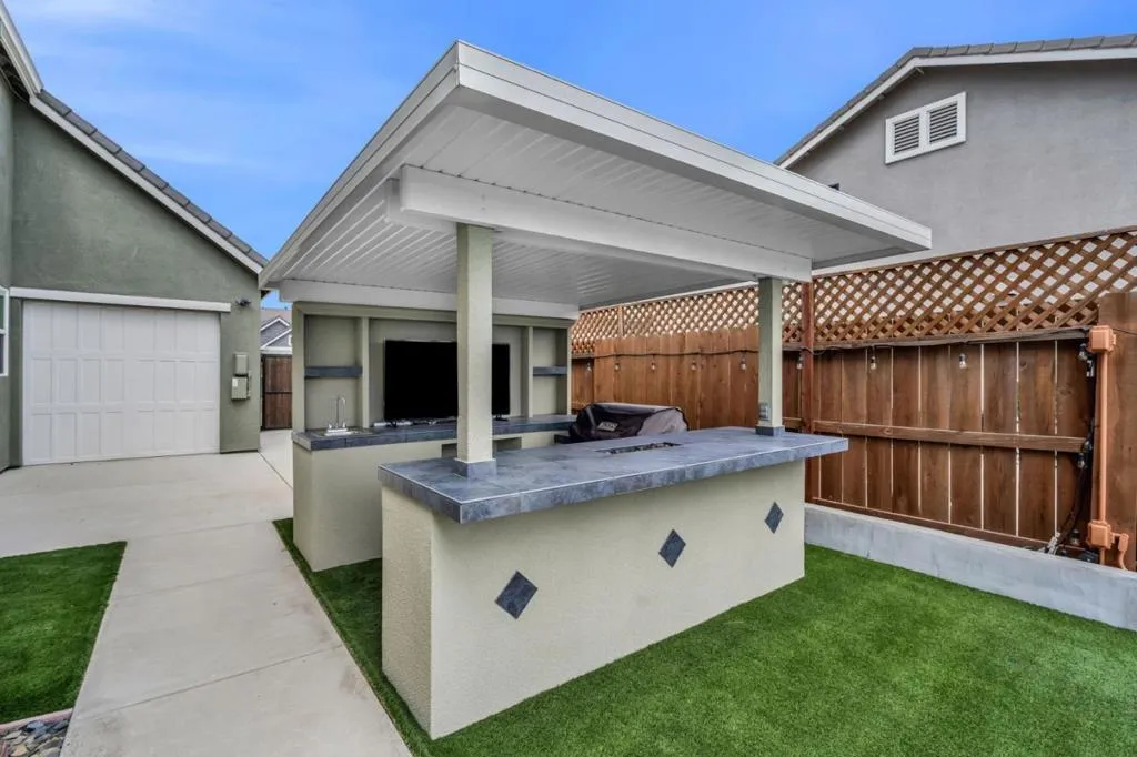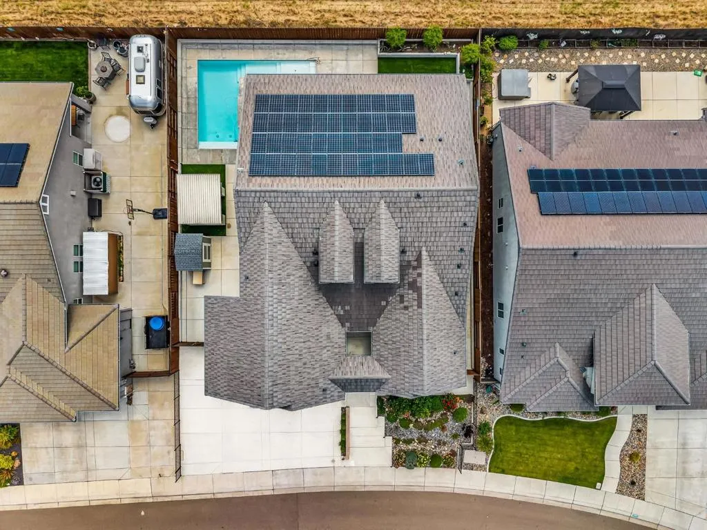 New listing in The Solera Collection! Crafted by Atherton Homes Phase #3 Patagonia Model, this elegantly appointed four-bedroom, 4-bathroom residence offers 2,718 square feet on a generous lot with RV parking in one of Manteca's most sought-after neighborhoods in RIPON school district. Inside, dramatic 12-13-foot coffered ceilings, a light-filled open floor plan, and refined finishes create an elevated sense of space for both everyday living and polished entertaining. Every detail feels curated, yet wonderfully livable. The kitchen and great room extend effortlessly to a resort-caliber backyard with an in-ground Gunite saltwater pool with lighting, an outdoor barbecue island with television, a gas fire pit, and a Tough Shed for discreet storage. OWNED SOLAR system, central heating & Air, a tankless water heater, Whole house fan, water filter & softener system, smart security flood lights with Ring cameras, and a (3) three-car garage with insulated doors enhance comfort and convenience. Moments from shopping at Walmart Supercenter and recreation at Great Wolf Lodge, this exceptional home delivers luxury with ease. Come experience this remarkable home in person and schedule your private tour today.