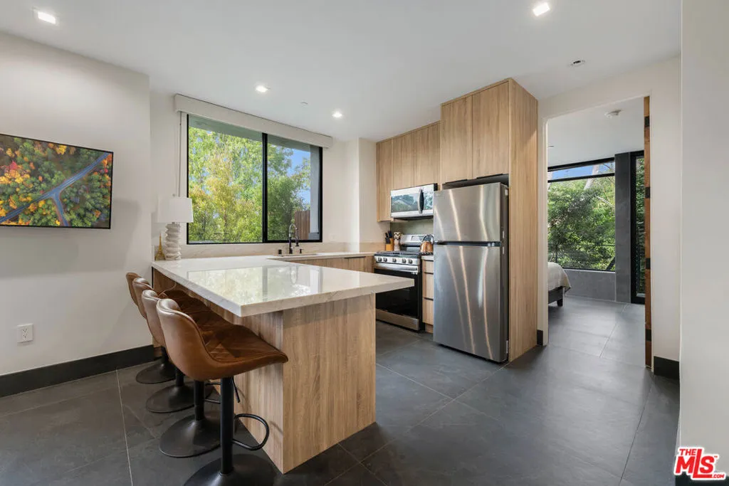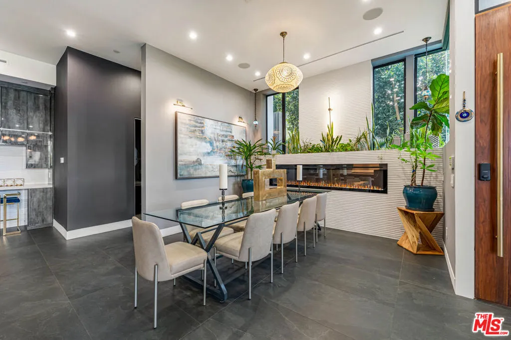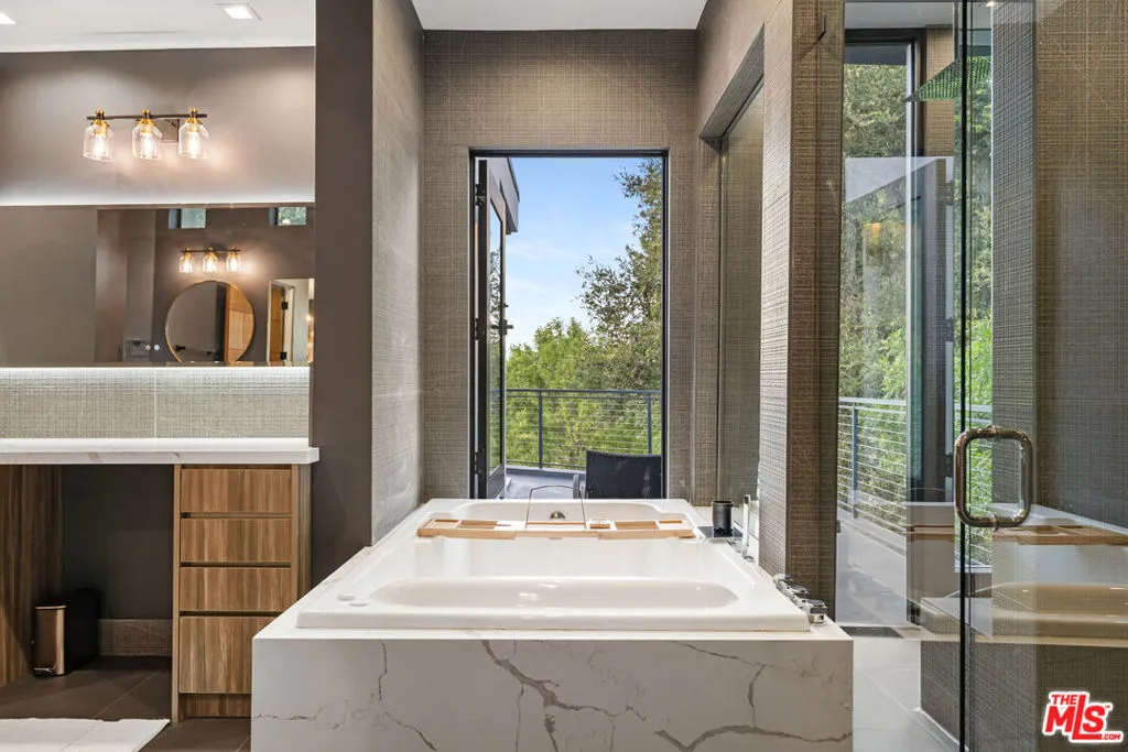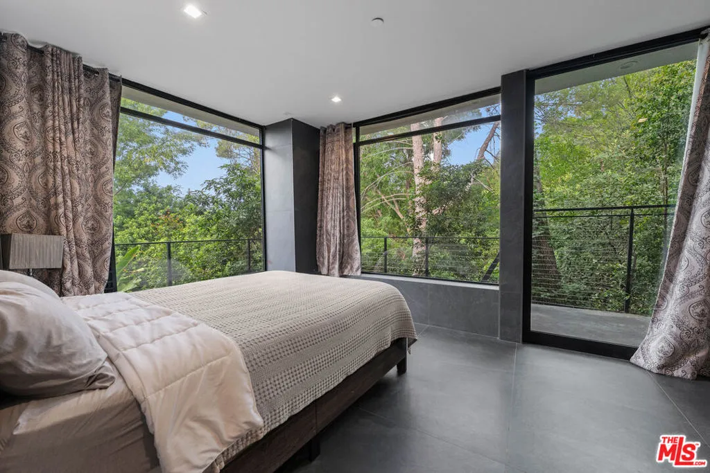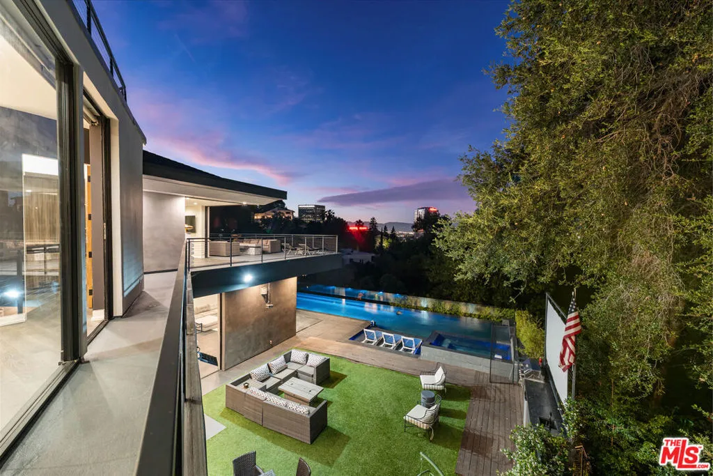 A spectacular gated compound retreat situated on a quiet cul-de-sac above the prestigious Hollywood Hills, the "Skyline Estate" is a newly constructed 6-bedroom, 7-bath designer residence by Alon Zakoot, offering approximately 5,700 square feet of cool, modern design with refined European finishes. A long private driveway leads to this stunning entertainer's estate which boasts sweeping panoramic views spanning the city skyline, mountains, and iconic landmarks including Universal Studios with its Harry Potter castle and the Hollywood Sign. A dramatic double-height entry introduces the home, flowing into expansive open-concept living spaces designed for seamless indoor-outdoor living. The living room is defined by a striking seamless corner of retractable glass doors, opening completely to frame sweeping views and connect directly to the impressive infinity-edge pool. The chef's kitchen is appointed with premium Dacor appliances, a waterfall island, wine refrigeration, and a built-in Miele espresso system, complemented by custom cabinetry and imported Moroccan lighting. Select Venetian plaster walls add subtle texture and depth throughout the interiors. The upper level is anchored by the primary suite, featuring dual walk-in closets plus an additional third closet, a wraparound private balcony, and a spa-inspired bath with dual vanities, a spacious jetted tub, rain shower, and an indoor-outdoor shower. Two additional bedroom suites offer sliding walls of retractable glass that open to a patio with outdoor lounge seating. An upstairs family room with a generous terrace and fire pit provides an ideal setting for taking in sweeping city views or catching some fireworks from Universal Studios. Outdoor spaces are designed for both scale and comfort, highlighted by a 65-foot infinity-edge pool with Baja shelf seating, an oversized spa, multiple lounge areas, and a rooftop deck with outdoor kitchen and fire pit. Additional features include a fully integrated smart home system controlled via iPad, Sonos surround sound, a comprehensive security system with cameras, elevator access, an impressive outdoor entertaining space with built-in projector, a basketball hoop for sport court-style recreation, and multiple terraces. On-site parking for up to 10 cars, along with a separate legal ADU/guest quarters, completes the property. Ideally located just minutes from major studios, hiking trails, and the best of Hollywood, this residence embodies elevated California living.