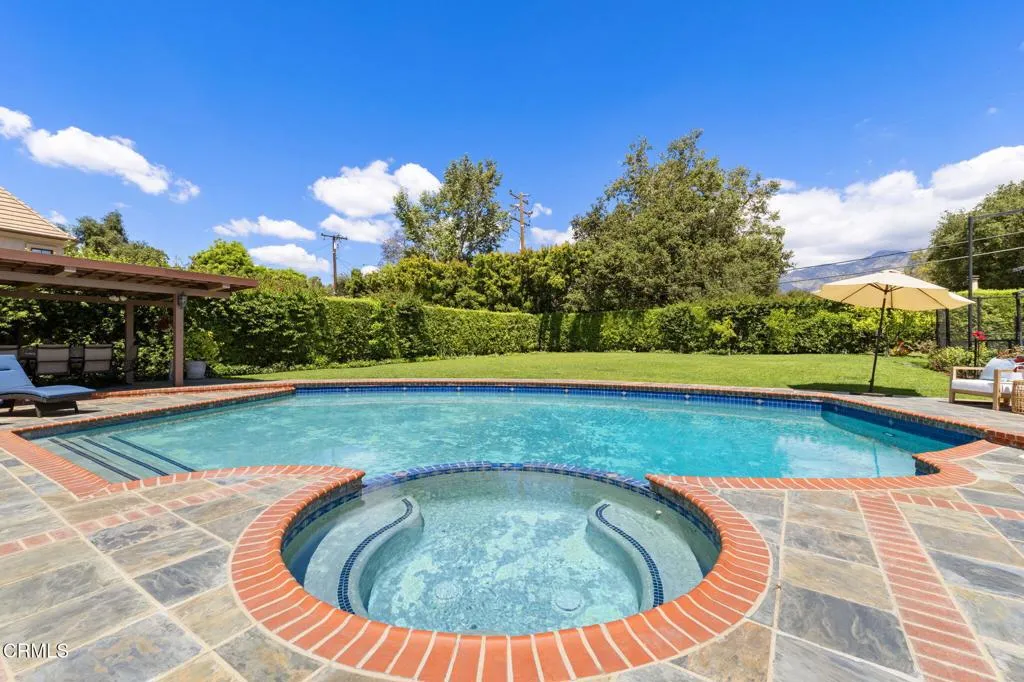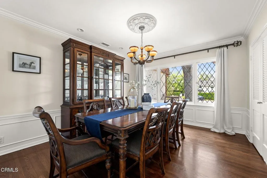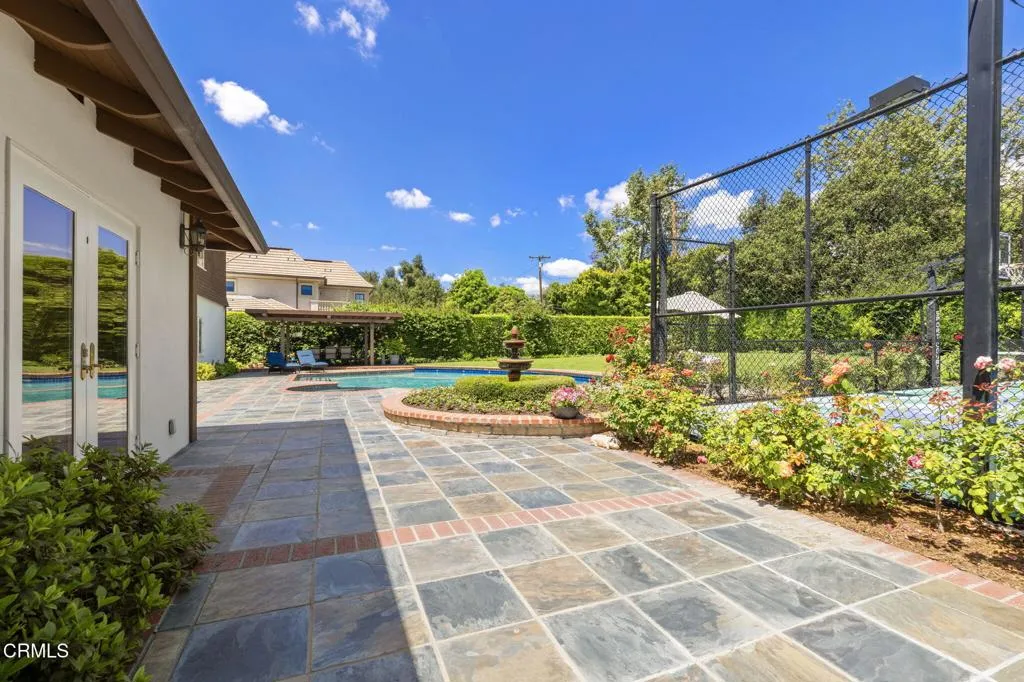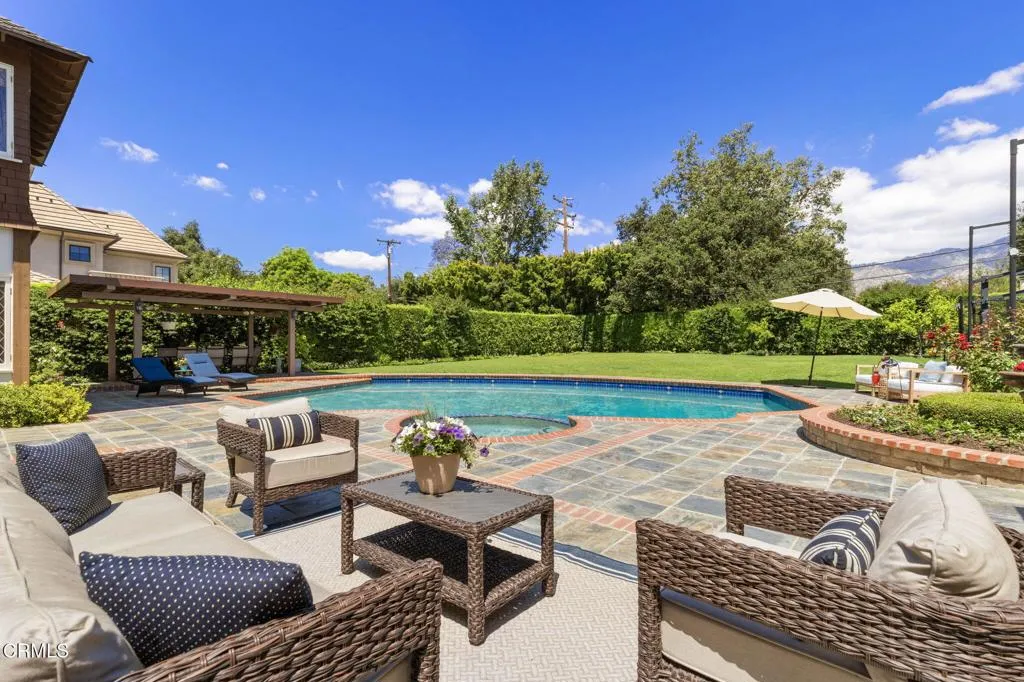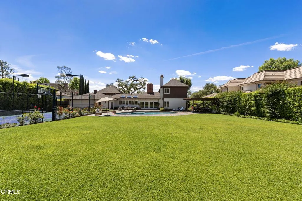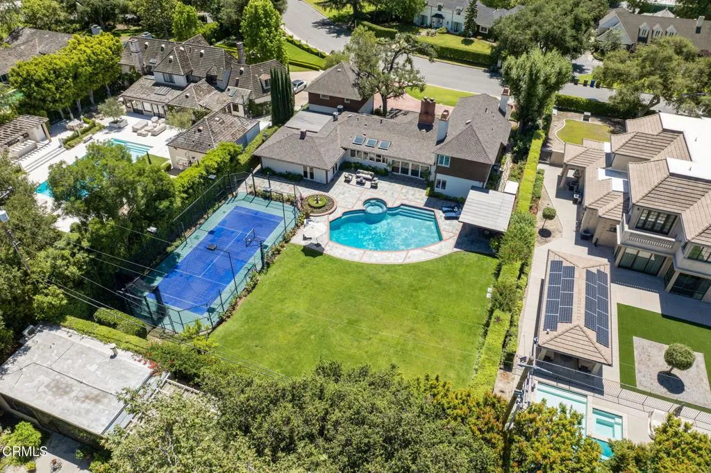 Nestled in the coveted Chapman Woods neighborhood of Pasadena, this timeless English Tudor estate exudes classic elegance and refined character. A circular brick driveway sets a grand first impression, leading into a residence rich with architectural detail and sophisticated design. Inside, the home offers an exceptional blend of formal and relaxed living spaces, including a stately formal living room, an inviting family room, and an expansive game room complete with a wet bar--perfectly suited for both intimate gatherings and large-scale entertaining. At the heart of the home, an open, light-filled kitchen overlooks the lush backyard, creating a seamless connection between indoor living and outdoor beauty. The private primary wing serves as a true retreat, showcasing a luxurious suite with a walk-in closet and its own dedicated library with a fireplace--an inviting and sophisticated sanctuary. Complementing the home are three nicely appointed bedroom en-suites, each designed for comfort and privacy. Ideally suited for multi-generational living, the residence also features a private guest suite tucked within the second-floor east wing. Outdoors, lush, manicured grounds create a resort-like setting with picturesque mountain views, a sparkling pool and spa, and a private sports court--offering endless opportunities for recreation and relaxation. Designed for both comfort and entertaining, this exceptional property embodies the very best of Pasadena living in one of its most sought-after communities.
