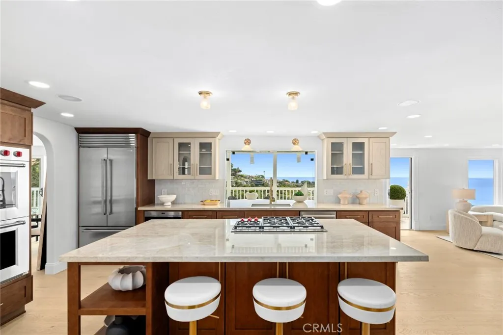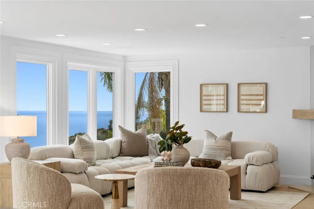 Newly and fully upgraded, this exceptional residence at 1675 Tahiti Avenue captures the essence of coastal living in Laguna Beach. Spanning approximately 3,843 square feet on an expansive 30,320-square-foot lot, the home offers five bedrooms plus an office, thoughtfully designed to embrace its breathtaking setting. From the moment you enter, unobstructed panoramic views unfold stretching from the rolling hills of Laguna Beach to the Pacific Ocean. Natural light fills the main living areas through large picture windows and multiple sliding glass doors, creating a seamless transition to the expansive rear deck where indoor-outdoor living takes center stage. The open concept layout is designed for both refined entertaining and everyday living. A modern kitchen anchored by Taj Mahal quartzite and a central island features a Wolf cooktop, double ovens, and a Sub-Zero refrigerator flowing effortlessly into the dining and living areas, all oriented to capture the home’s sweeping ocean vistas. Whether enjoying vibrant sunsets over the water or relaxing by the fireplace on cooler coastal evenings, the home offers an environment that is both inviting and sophisticated. The upper level includes four spacious bedrooms and a laundry room. The primary suite serves as a private retreat, offering ocean views, direct access to a private deck, and a spa-inspired bath with a custom walk-in closet, soaking tub, and oversized shower. The lower level provides a flexible space that can function as a private apartment-style suite with an en-suite bath or as a media room or additional lounge. Outdoor spaces further enhance the property with a rare, generous flat area that maximizes the oversized lot, ideal for entertaining, creating an outdoor pavilion, or simply enjoying the surrounding ocean vistas and sunsets. Located in the highly sought-after Mystic Hills neighborhood, the home is moments from parks, hiking trails, award-winning schools, and Laguna Beach’s vibrant downtown, known for its renowned restaurants, boutiques, and galleries. Experience coastal living at its finest in one of Laguna Beach’s most desirable settings.