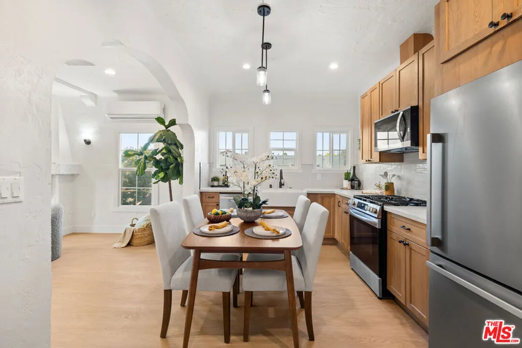 Step into a rare offering where timeless elegance meets modern comfort in the heart of Los Angeles coveted West Adams District. This 1935 Spanish Revival residence captures the romance of a bygone era while embracing thoughtful updates designed for today's lifestyle. Behind its classic white stucco facade and terracotta tile roof, accented with soft blue detailing, the home immediately evokes architectural distinction. Arched windows paired with decorative shutters frame the exterior with character, while curved lines and period craftsmanship create an unforgettable first impression. Inside, a bright and airy living room welcomes you with high, textured ceilings and beautifully preserved plaster walls. A sculpted fireplace serves as a striking focal point, anchoring the space with warmth and artistry. New flooring flows seamlessly throughout, enhancing both cohesion and comfort. The remodeled kitchen blends vintage inspiration with modern functionality, featuring thoughtfully designed cabinetry and updated amenities that cater to both everyday living and entertaining. The bathroom continues the home's narrative with tasteful, period-style tilework that honors its heritage while offering contemporary ease. Natural light pours through expansive windows, illuminating every corner and revealing tranquil views of tree-lined streets. A quaint Juliette balcony offers the perfect setting to unwind and enjoy golden California sunsets. Positioned in the vibrant West Adams neighborhood, this residence places you moments from beloved cafes, local boutiques, and cultural landmarks, delivering a lifestyle that is both dynamic and deeply rooted in Los Angeles history. Offered as a TIC (25% undivided interest), this is a distinctive opportunity to own a piece of architectural heritage. The home includes valuable permitted upgrades, including HVAC, electrical improvements, kitchen and bath renovations, a foundation retrofit, roof work, and termite clearance. Flexible financing options, including as little as 10% down with a 30-year fixed structure, further enhance accessibility. This is more than a home; it is a curated living experience where history, style, and opportunity converge.