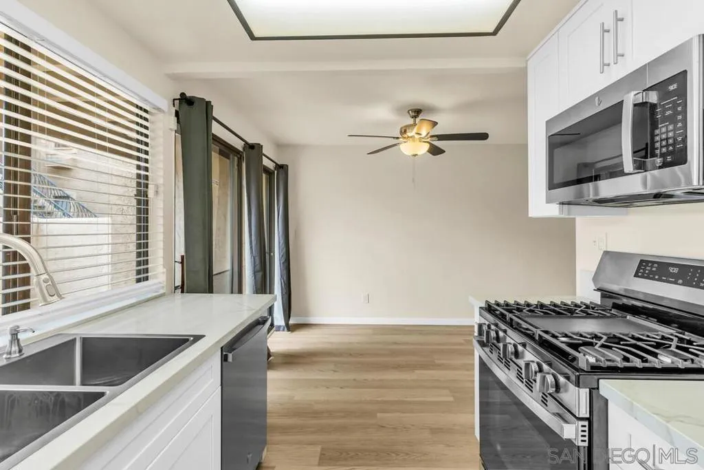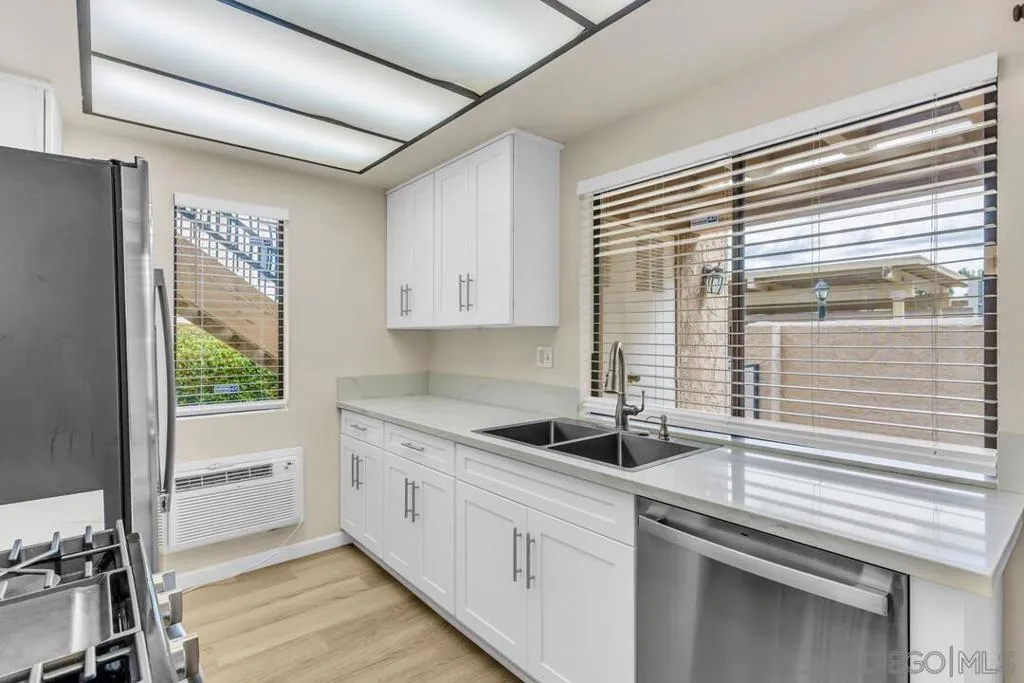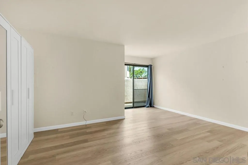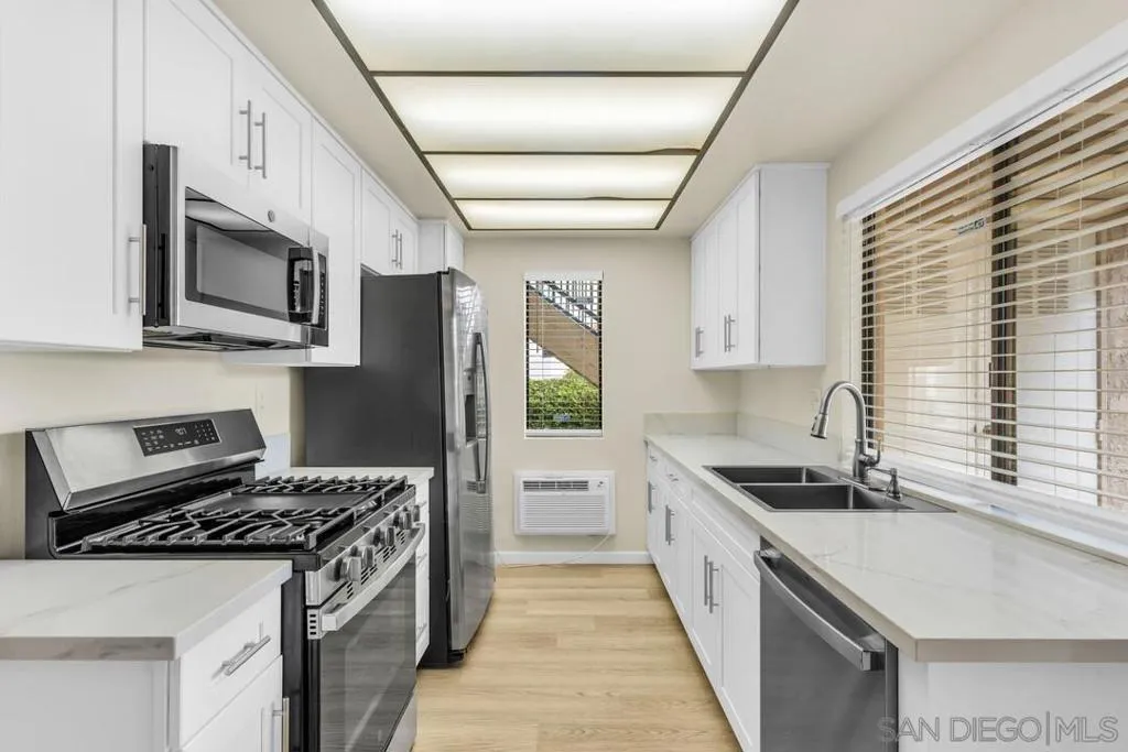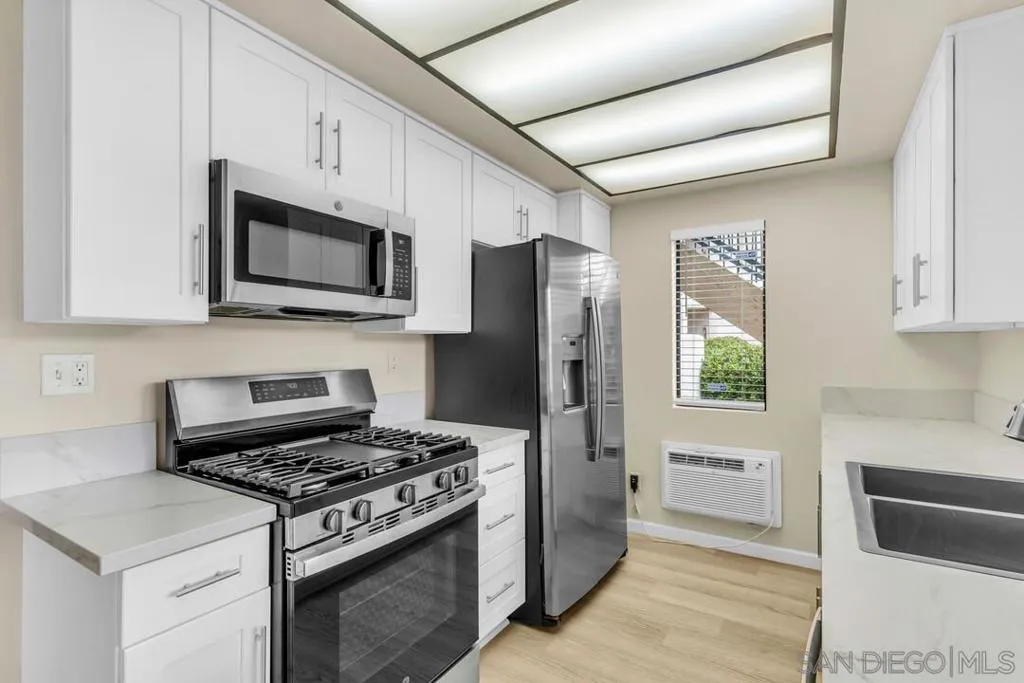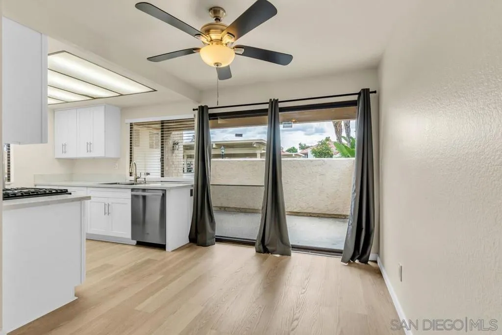 Beautiful move-in ready ground-floor condo in the heart of Mira Mesa. This spacious 1 bed, 1 bath unit features fresh neutral paint and durable LVP flooring throughout, creating a clean and modern feel from the moment you walk in. The updated kitchen showcases quartz countertops, stainless steel appliances, and crisp white shaker cabinetry for a timeless, contemporary look. The generously sized primary bedroom offers excellent space along with its own private patio. The sleek, refreshed bathroom ties in beautifully with the kitchen finishes, featuring a matching vanity, updated tub, and stylish contemporary details. A second patio off the living room expands your living space outdoors, while a convenient stacked washer/dryer is located in the exterior storage closet. Located in Villa Mar Condos, this home offers a desirable central location near schools, parks, hiking trails, and convenient access to Sorrento Valley. Enjoy the ideal balance of comfort, convenience, and accessibility in a well-maintained community.