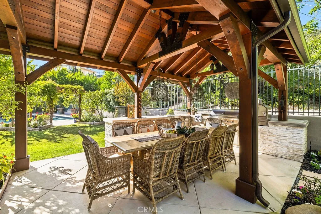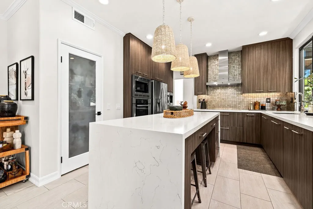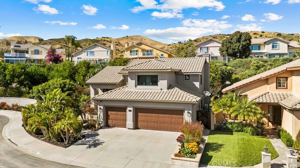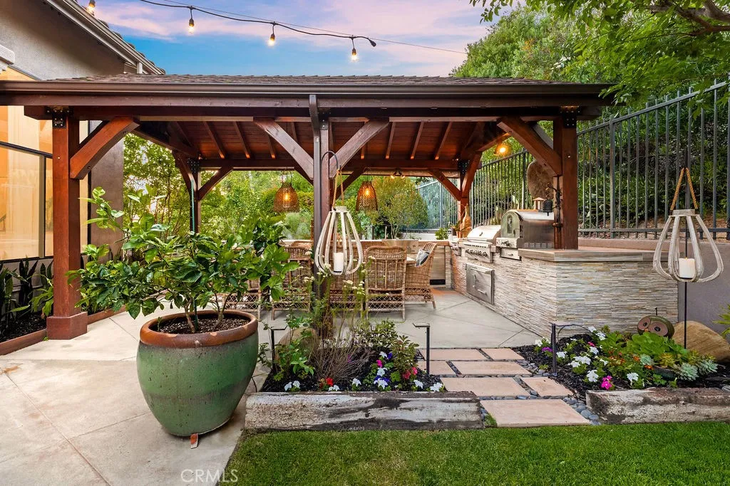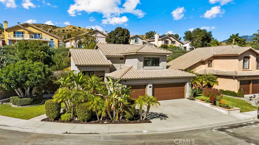 Look no further—this extraordinary luxury residence nestled on a 7500 sq ft lot on a quiet cul-de-sac in the prestigious hillside enclave of Foothill Ranch is a true statement of refined living. Meticulously reimagined with elevated design and premier finishes, this home offers an unparalleled blend of sophistication, comfort, and resort-inspired elegance. At the heart of the home, the designer chef’s kitchen is a masterpiece, appointed with a full suite of Bosch appliances, including a built-in coffee system and wine refrigerator, complemented by sleek quartz countertops, custom cabinetry, and a center island with dual sided seating. A bespoke, temperature-conscious wine display elegantly tucked beneath the staircase adds a striking architectural focal point. Every detail has been thoughtfully curated, with rich solid wood flooring throughout the home. Step outside to a private resort-caliber backyard retreat designed for the most discerning entertainer. Created for elevated outdoor living, the backyard is artfully divided into three distinct entertainment spaces, creating the ultimate private resort experience. Enjoy evenings gathered around the expansive seating area with a stone fire pit, perfect for intimate conversations under the stars. Host unforgettable dinners beneath a beautifully crafted covered wood structure, boasting a show stopping chef-caliber outdoor kitchen—featuring a premium Coyote BBQ, dual side burners, cocktail bar, wine and beverage refrigeration, ice maker, and a handcrafted pizza oven—designed to impress. Unwind poolside beside the sparkling resurfaced PebbleTec pool, recently enhanced with new coping, designer tile, and a saltwater chlorination system. Or, end your day soaking in the spa while taking in breathtaking sunset views, offering a daily escape that feels like a five-star retreat. Guests will appreciate the versatile main-level bedroom, (currently styled as an office)—ideal for both guests or multi-generational living. The primary suite captures tranquil backyard views and is complemented by a spa-inspired bath and an expansive wraparound closet. Two additional generous sized bedrooms and remodeled bath complete the upper level. Significant capital improvements include a new HVAC system, full PEX re-pipe, double-insulated Milgard windows, insulated garage doors, and an upgraded laundry room that reflects both style and functionality. This is more than a home—it is a luxury lifestyle experience!