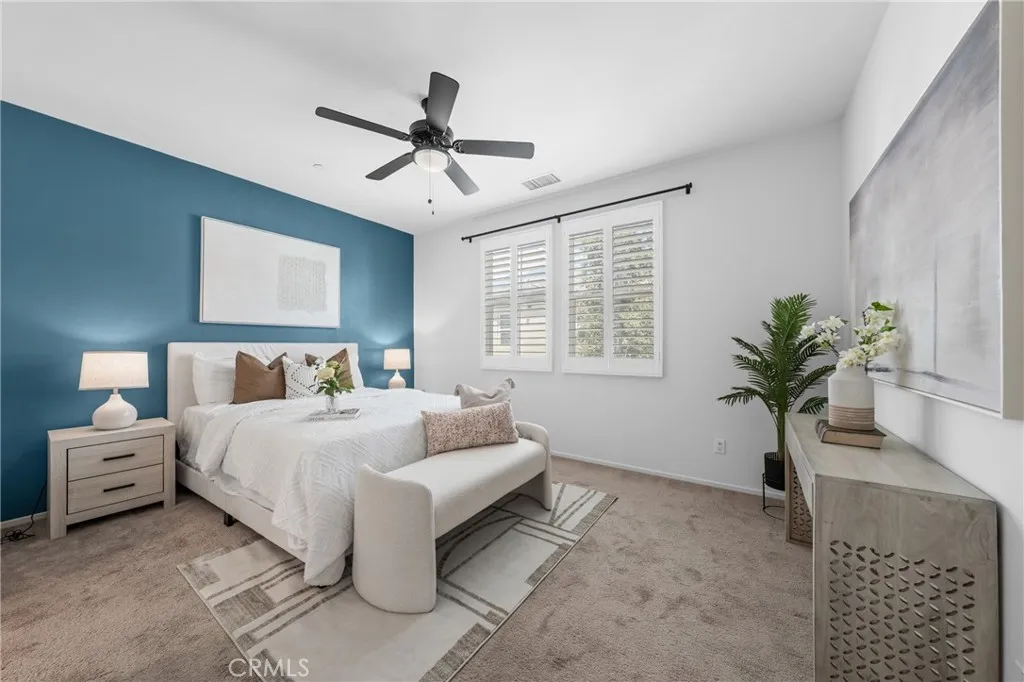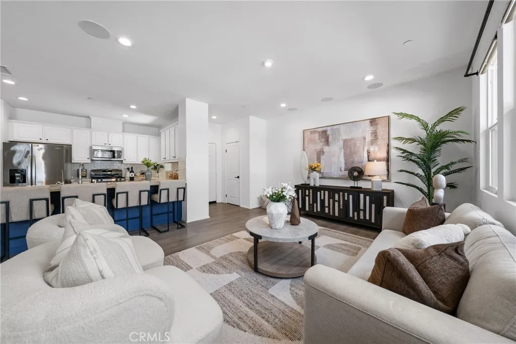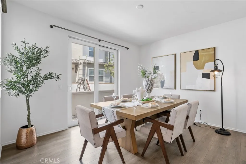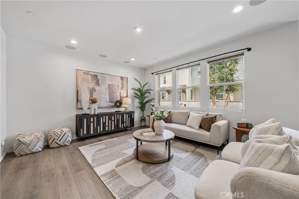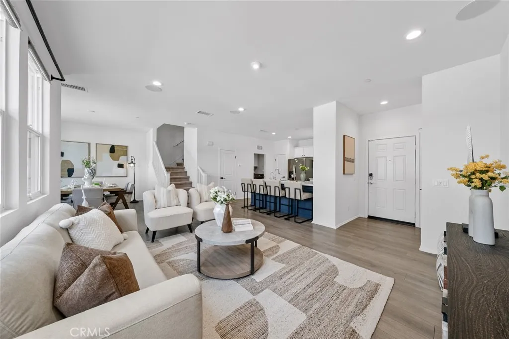 Built in 2019, this 3-bedroom, 2.5-bath condo offers 1,554 sqft of modern, move-in ready living. The open-concept main level connects the kitchen, dining, and living areas in a natural, inviting layout. The kitchen is well-appointed with white cabinetry, quartz countertops, a custom tile backsplash, a generous pantry, and stainless steel appliances. Laminate wood flooring, recessed lighting, and dual-pane windows complete the clean, contemporary feel throughout. Upstairs, the primary suite includes a walk-in closet, dual sinks, updated fixtures, and a walk-in shower. Two additional bedrooms are comfortably sized and share a full bathroom with a shower-over-tub, and flexible for family, guests, or a home office. An individual laundry room and extra storage add to everyday convenience. Energy efficiency is a standout feature: the solar system helps keep utility costs down, and a tankless water heater rounds out the home's modern systems. No Mello-Roos. The HOA recently completed an exterior repaint of the community. The unit is conveniently located near green space and community parking, with easy access to guest parking throughout. Community amenities include a resort-style pool, BBQ area, and well-kept park-like greenbelts. Everyday essentials are all within easy reach, Stater Bros, Walmart and Target are within 10 minutes, and Costco is just under 15 minutes. Close to the 60 freeway. Whether you're buying your first home or simplifying your lifestyle, this is the one worth seeing in person.