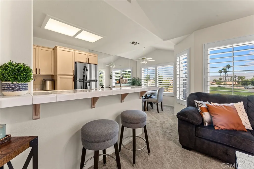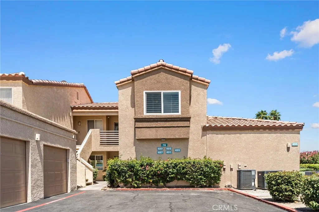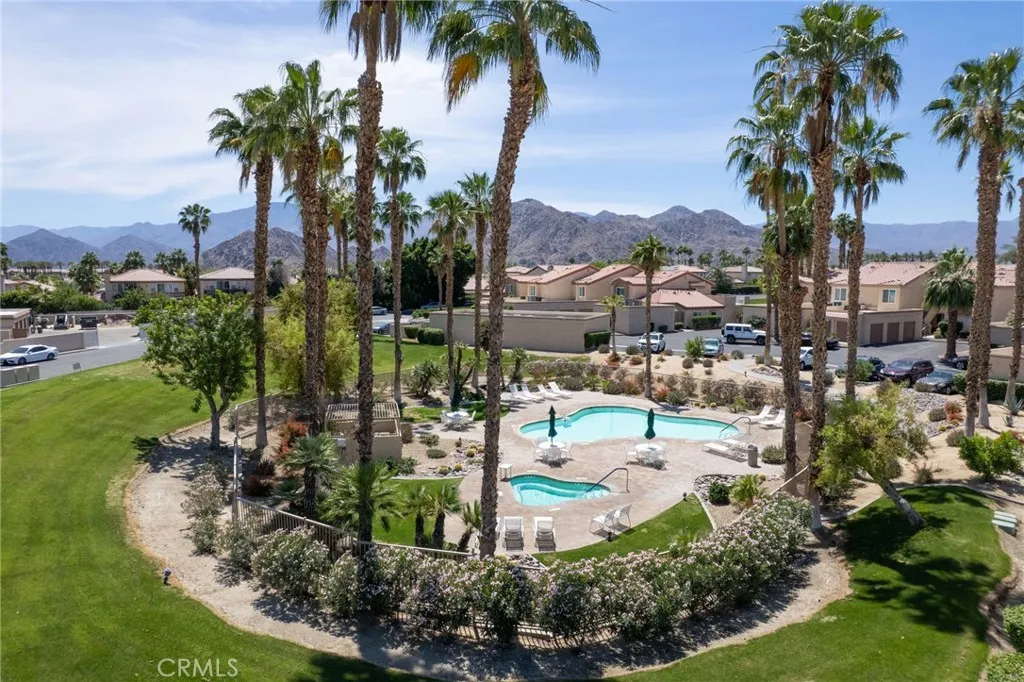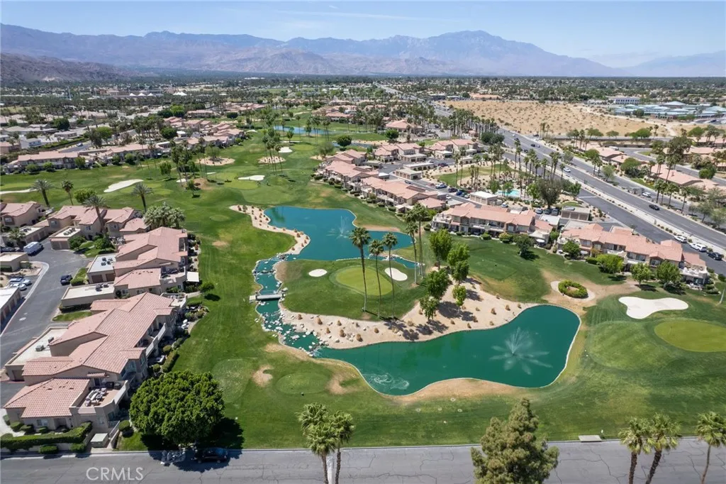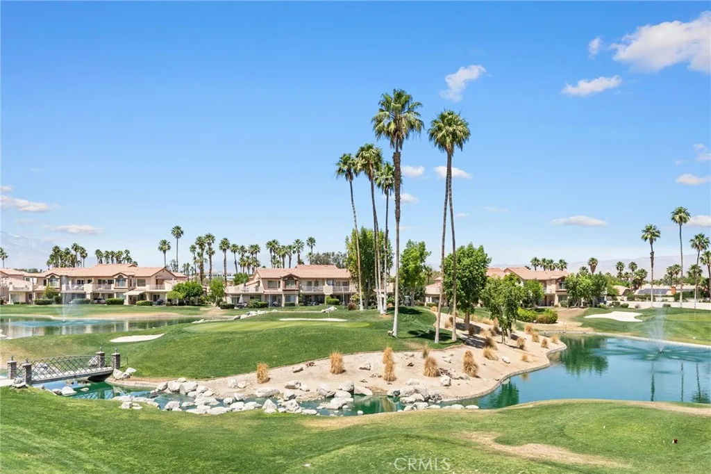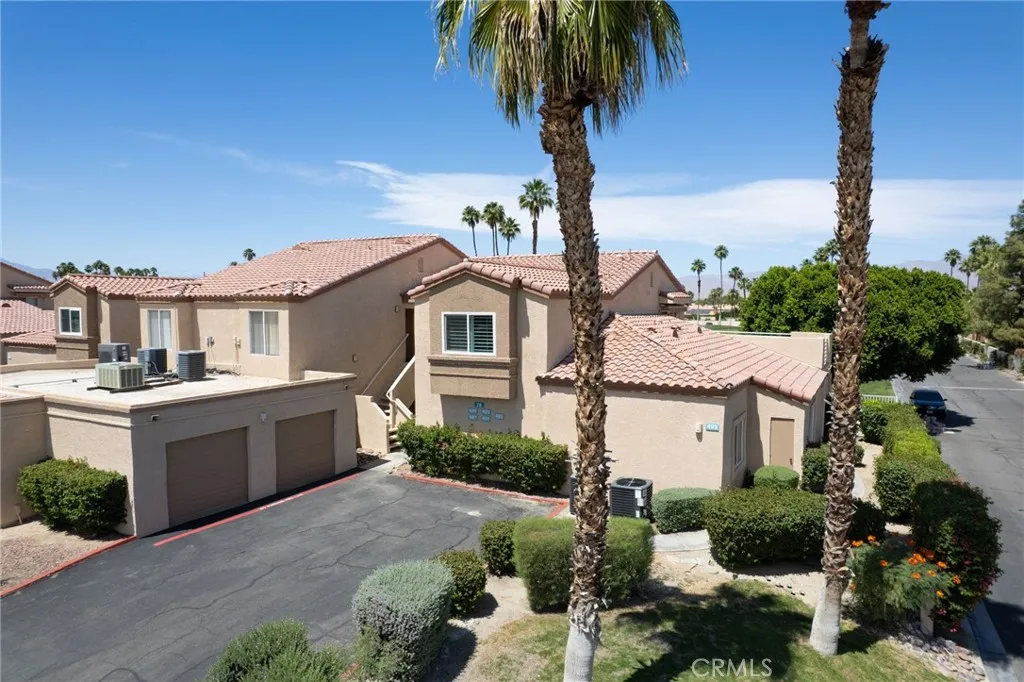 Welcome to the desert lifestyle at its finest in beautiful La Quinta. An upper-level, end-unit in the highly desirable Palm Royale Country Club offers the perfect blend of comfort, charm, and resort-style living. Tucked away in a private corner of the community, this home offers an exceptional sense of peace and quiet, creating a serene retreat away from the hustle and bustle. Offered fully furnished, this turnkey 2-bedroom condo is ready for immediate enjoyment. Inside, the living room welcomes you with vaulted ceilings, creating an open and airy feel, while newer windows throughout enhance both energy efficiency and comfort. These windows are fitted with plantation shutters. The kitchen is clean and inviting, featuring crisp white tile countertops, newer stainless steel appliances, and a convenient bar seating area, perfect for casual dining or entertaining. From the moment you walk in, the home reflects true pride of ownership! It is immaculately maintained and thoughtfully cared for throughout. As a corner unit, you’ll enjoy added privacy and abundant natural light! The spacious exterior deck becomes your personal retreat, overlooking the lush golf course and tranquil pond. Whether you're enjoying your morning coffee or unwinding in the evening, this space captures the essence of desert living, complete with an electric awning. The dining area is ideally positioned to take in golf course views, adding a scenic backdrop to every meal. Both bedrooms are well-appointed with ceiling fans, mirrored sliding closet doors, and plantation shutters, while multiple skylights throughout the home bring in beautiful natural light. The primary suite features its own private bathroom, ceiling fan, and serene mountain views, creating a peaceful retreat at the end of the day. A private laundry room adds everyday convenience, while central heating and air conditioning keep the home comfortable year-round. The property also includes a detached one-car garage, with ample guest and curbside parking available throughout the community. Living in Palm Royale means enjoying an unmatched list of amenities included in the HOA: Unlimited golf, internet, cable TV, tennis courts, pools and spas, pickleball, frisbee golf, fitness center, library, security, and more, truly a lifestyle, not just a home. The HOA allows rentals of 30+ days. If you’ve been looking for a low-maintenance, move-in ready property with incredible views and resort-style amenities, this is the one.