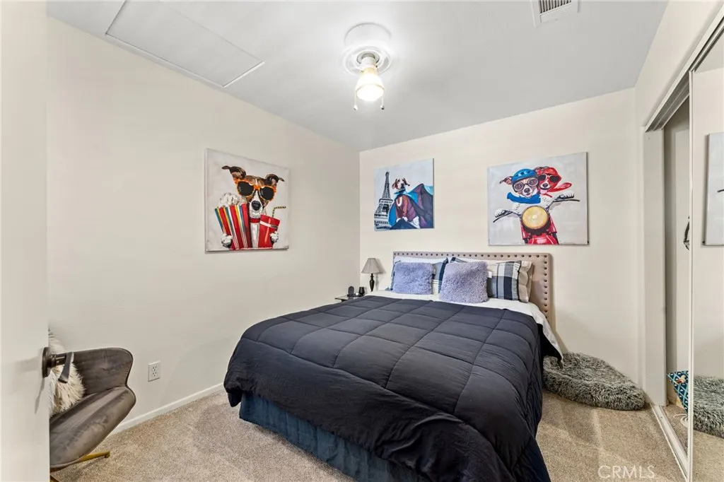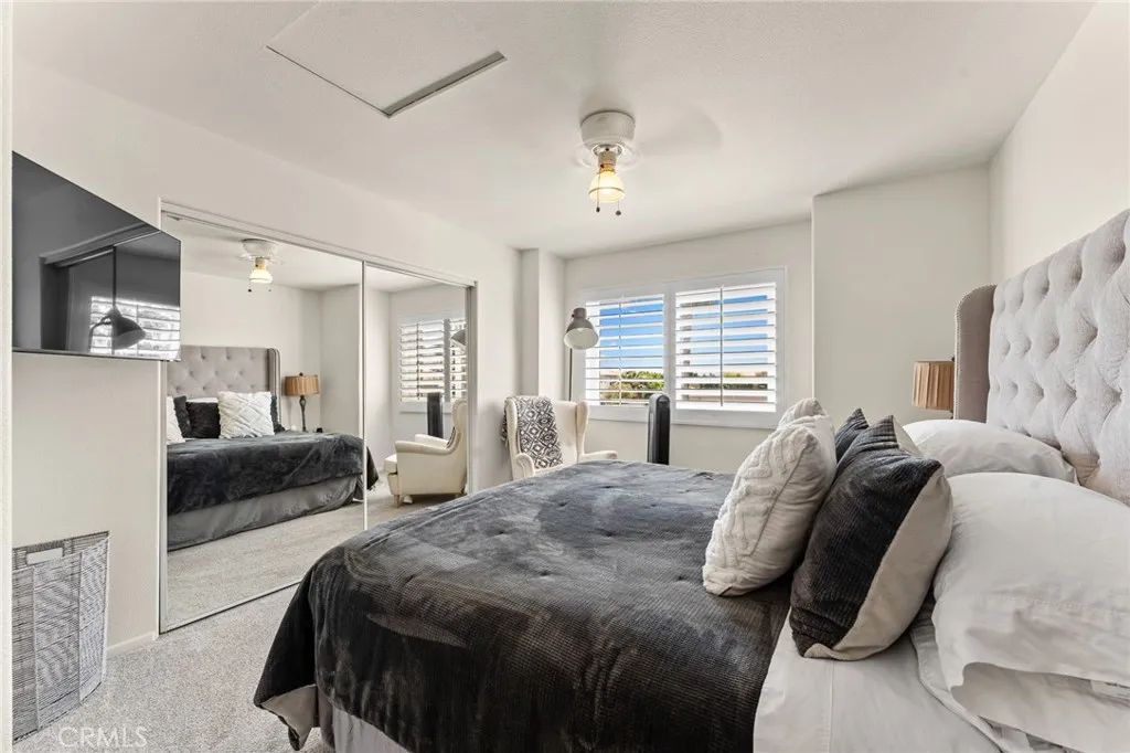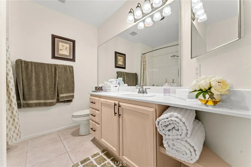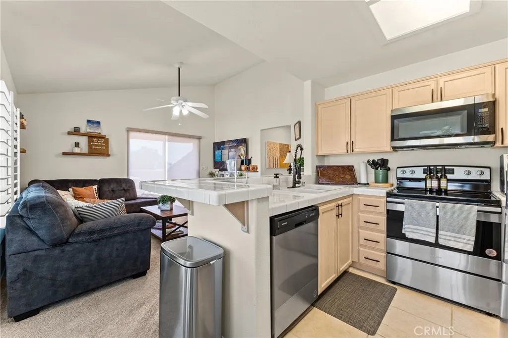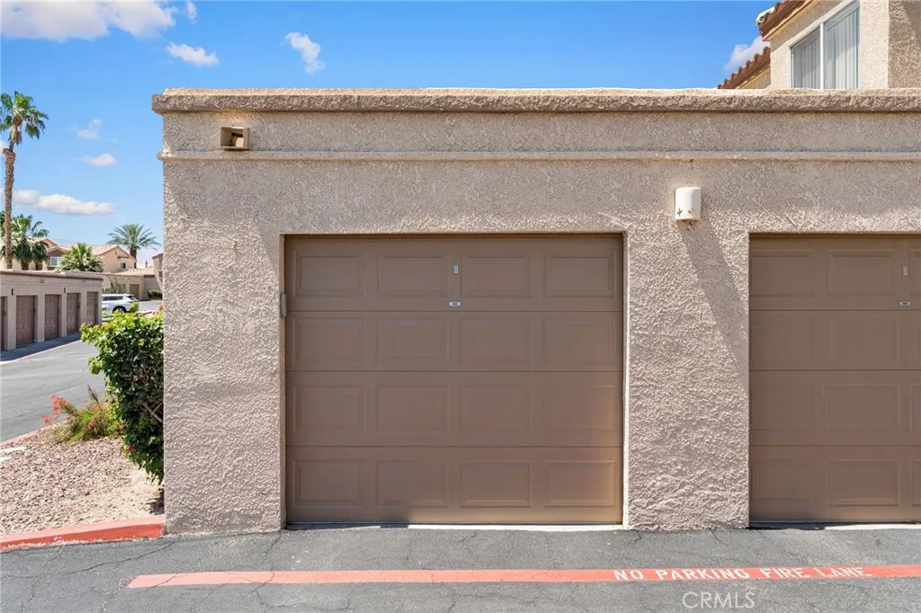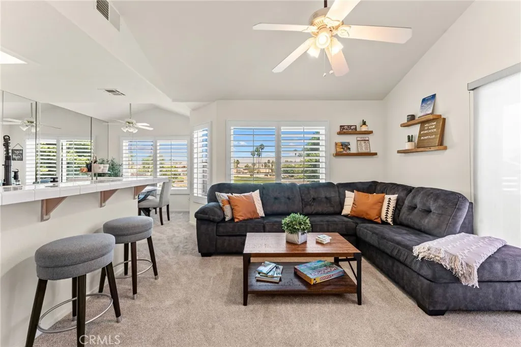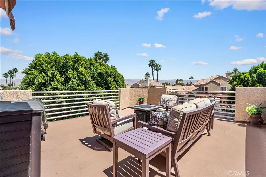 Welcome to the desert lifestyle at its finest in beautiful La Quinta. An upper-level, end-unit in the highly desirable Palm Royale Country Club offers the perfect blend of comfort, charm, and resort-style living. Tucked away in a private corner of the community, this home offers an exceptional sense of peace and quiet, creating a serene retreat away from the hustle and bustle. Offered fully furnished, this turnkey 2-bedroom condo is ready for immediate enjoyment. Inside, the living room welcomes you with vaulted ceilings, creating an open and airy feel, while newer windows throughout enhance both energy efficiency and comfort. These windows are fitted with plantation shutters. The kitchen is clean and inviting, featuring crisp white tile countertops, newer stainless steel appliances, and a convenient bar seating area, perfect for casual dining or entertaining. From the moment you walk in, the home reflects true pride of ownership! It is immaculately maintained and thoughtfully cared for throughout. As a corner unit, you’ll enjoy added privacy and abundant natural light! The spacious exterior deck becomes your personal retreat, overlooking the lush golf course and tranquil pond. Whether you're enjoying your morning coffee or unwinding in the evening, this space captures the essence of desert living, complete with an electric awning. The dining area is ideally positioned to take in golf course views, adding a scenic backdrop to every meal. Both bedrooms are well-appointed with ceiling fans, mirrored sliding closet doors, and plantation shutters, while multiple skylights throughout the home bring in beautiful natural light. The primary suite features its own private bathroom, ceiling fan, and serene mountain views, creating a peaceful retreat at the end of the day. A private laundry room adds everyday convenience, while central heating and air conditioning keep the home comfortable year-round. The property also includes a detached one-car garage, with ample guest and curbside parking available throughout the community. Living in Palm Royale means enjoying an unmatched list of amenities included in the HOA: Unlimited golf, internet, cable TV, tennis courts, pools and spas, pickleball, frisbee golf, fitness center, library, security, and more, truly a lifestyle, not just a home. The HOA allows rentals of 30+ days. If you’ve been looking for a low-maintenance, move-in ready property with incredible views and resort-style amenities, this is the one.
