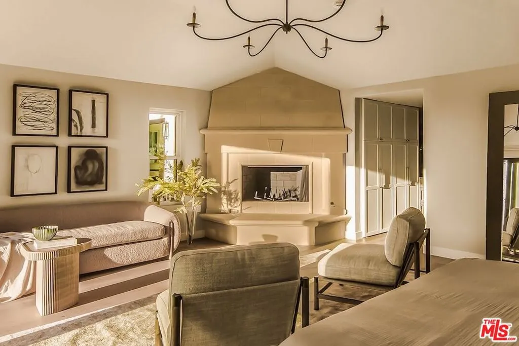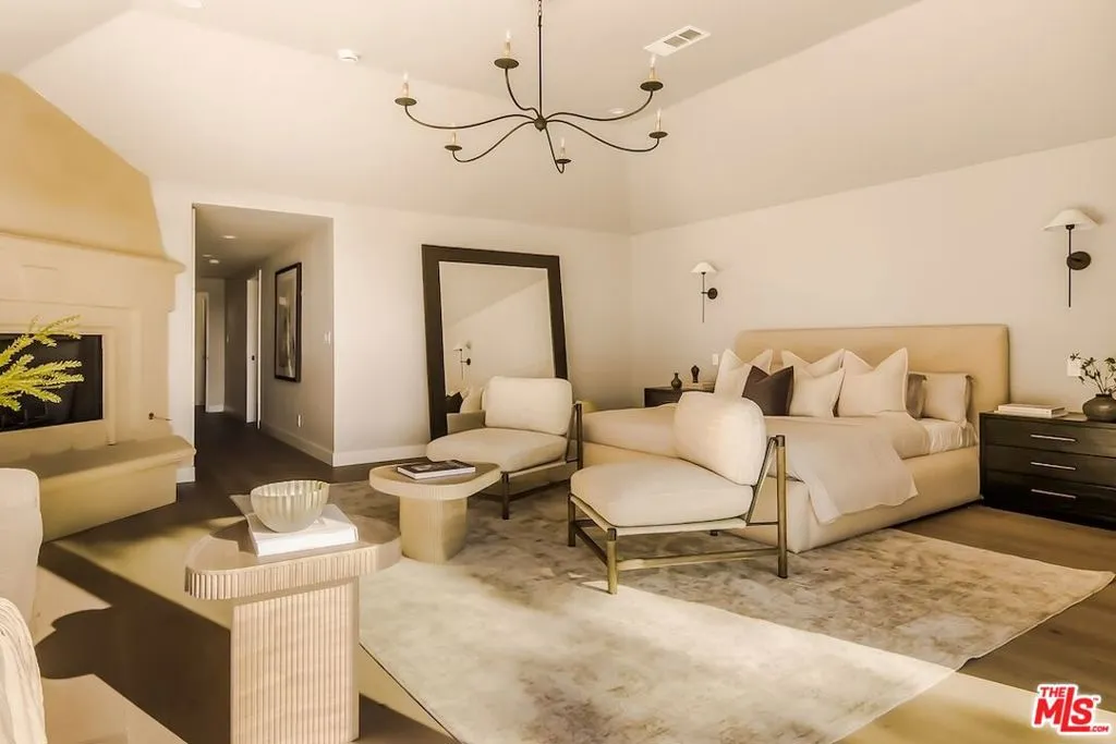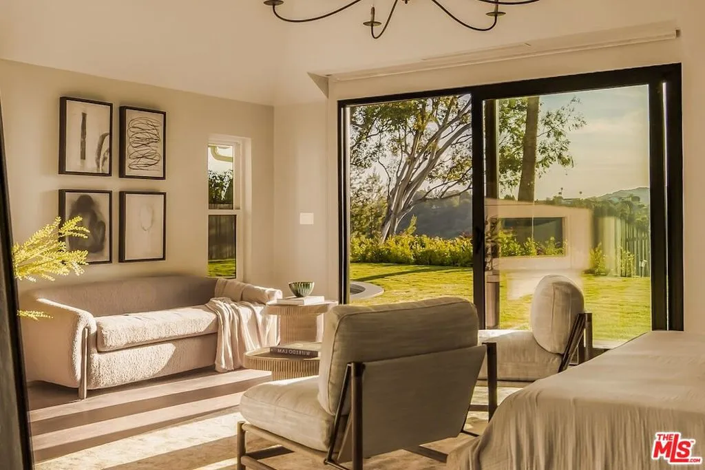 A completely reimagined Cape-Mod with soaring ceiling heights and incredible views, sitting on over 18,000 sqft of lush grounds. Five bedrooms and six baths, all en suite. Open floor plan with kitchen, living, and dining flowing together under vaulted ceilings with skylights, overlooking the pool and canyon. Strong natural light throughout with standout sunset views. Primary suite on the main level with walk-in closet and travertine fireplace, plus a generous guest bedroom with a storybook window nook. Upstairs includes three bedrooms plus a game room, family room, and private office.Gated and private with a two-car garage. Grounds feature a kidney-shaped pool, entertaining areas, and a large lower yard running the length of the lot - ideal for sports or a future pickleball court.