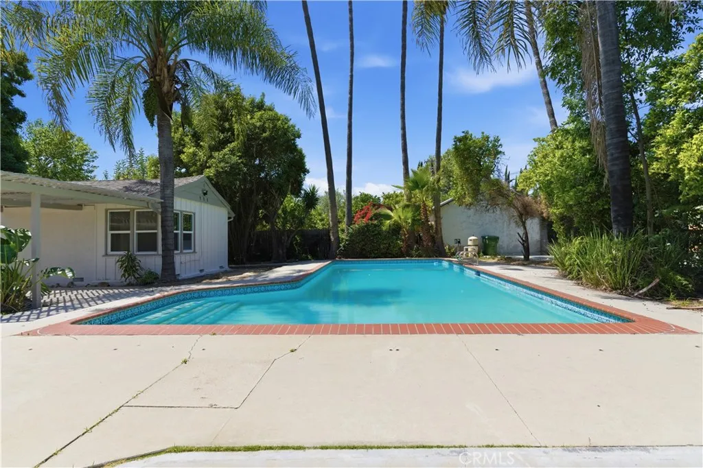 Welcome to 17363 Saticoy St, a beautifully refreshed single-story pool home in the heart of Northridge, offering 3 bedrooms, 2 bathrooms, and 1,904 sqft of thoughtfully laid-out living space on a rare 15,421 sqft lot. Built in 1951 with timeless ranch-style character, the home has been updated with fresh interior and exterior paint, refreshed kitchen cabinetry, and new laminate flooring throughout. Step inside to an open, light-filled living room featuring vaulted beamed ceilings, recessed lighting, and a striking white-painted brick fireplace — flowing into a separate formal dining area and an oversized family/bonus room that opens to the backyard. The remodeled kitchen shines with crisp white shaker cabinets, quartz counters, stainless steel appliances, and ample prep space, plus a dedicated laundry room just off the kitchen. The spacious primary suite offers a private ensuite bath and generous closet space, with two additional bedrooms served by an updated hall bath. Step outside and you'll find your own private escape — a sparkling pool surrounded by lush greenery and swaying palms that create a resort-like atmosphere. Afternoons turn into evenings effortlessly here, lounging poolside, hosting weekend BBQs, or unwinding under the covered patio as the sun sets. A detached garage with gated alley access and an attached 35 sqft rec room adds flexibility and privacy, while the enormous lot provides tons of potential to add an ADU and a Junior ADU (buyer to verify with the City of Los Angeles). There's a rare sense of space and separation here — room to relax, entertain, and truly enjoy California living. Ideally located minutes from CSUN, Westfield Topanga, Northridge Fashion Center, top local dining, and with easy access to the 118, 405, and 101 freeways, this isn't just a house — it's a place where everyday moments feel elevated, where indoor comfort meets outdoor freedom, and where you can instantly picture yourself at home. Contact your Realtor to schedule a tour and make an offer today!