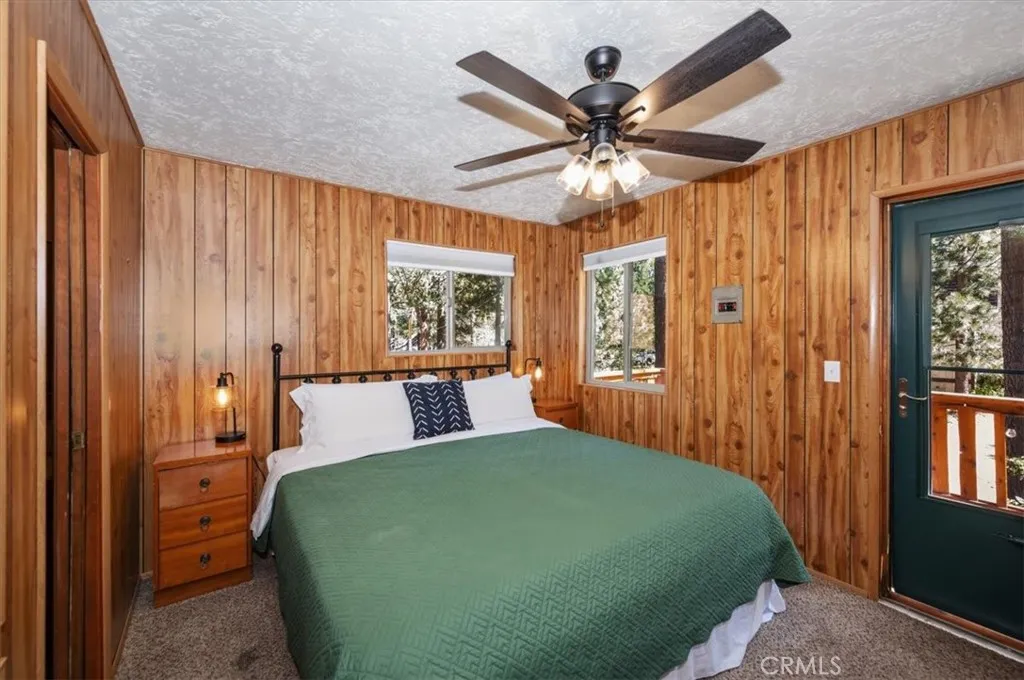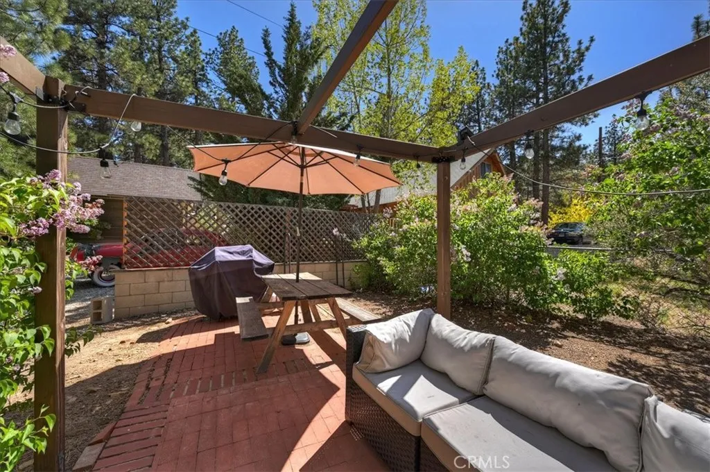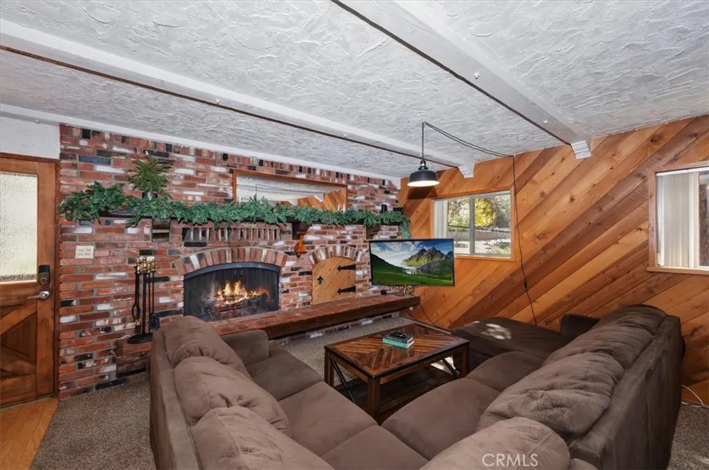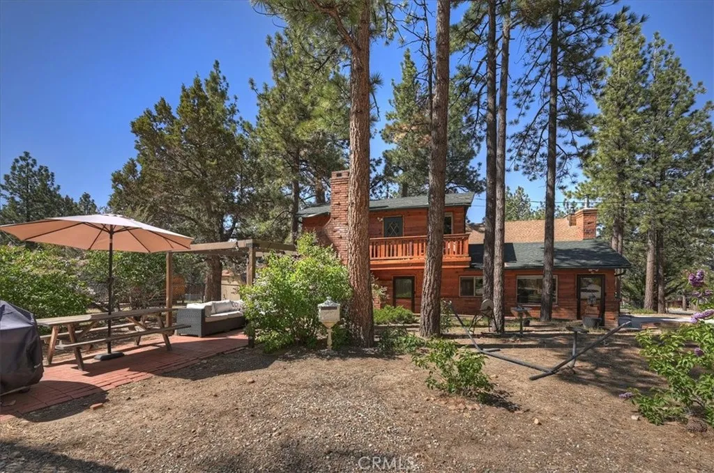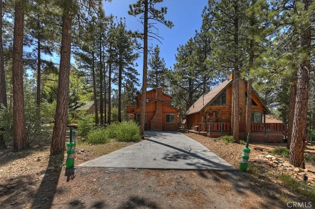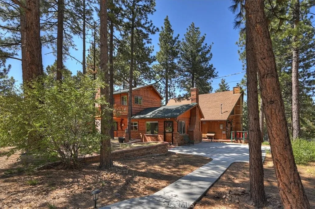Short term rental ready. Furnished and equipped. Cozy outdoor nooks to kick back and relax or enjoy the warmth in front of 1 of 3 fireplaces. 3 bedroom with main level bedroom and bathroom, concrete parking pad plus additional RV/ Boat parking. Short walk to Sugarloaf skate park, dog park and near Big Bear Highschool. Ideal location. National Forest up the end of the street. Fire department 1/4 mile from the home. Bear Mountain Ski resort and Snow Summit Ski resort/MTB (seasonal) all near by. Home being sold w/ furnishings, washer/ dryer and refridgerator. Must see in person! This Cozy spruce cabin is ready for family fun and to start renting as a vacation rental quickly. Buyer will need to get the permit.