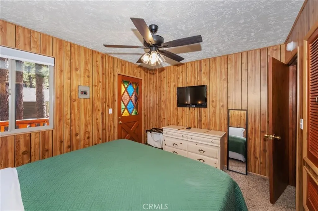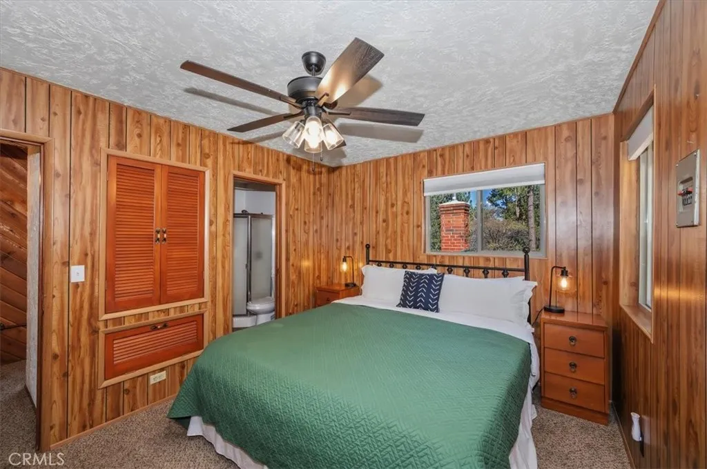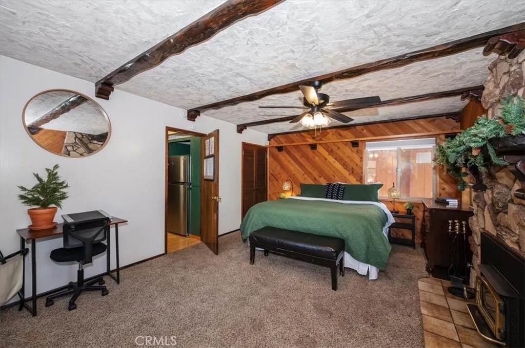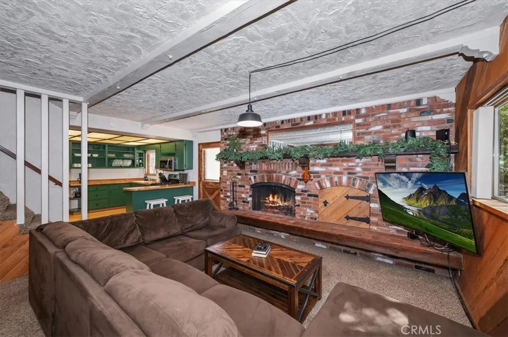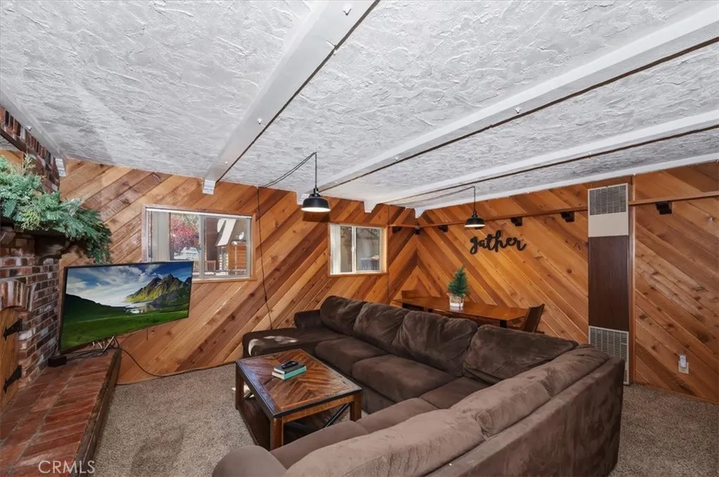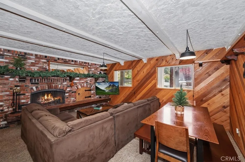 Short term rental ready. Furnished and equipped. Cozy outdoor nooks to kick back and relax or enjoy the warmth in front of 1 of 3 fireplaces. 3 bedroom with main level bedroom and bathroom, concrete parking pad plus additional RV/ Boat parking. Short walk to Sugarloaf skate park, dog park and near Big Bear Highschool. Ideal location. National Forest up the end of the street. Fire department 1/4 mile from the home. Bear Mountain Ski resort and Snow Summit Ski resort/MTB (seasonal) all near by. Home being sold w/ furnishings, washer/ dryer and refridgerator. Must see in person! This Cozy spruce cabin is ready for family fun and to start renting as a vacation rental quickly. Buyer will need to get the permit.