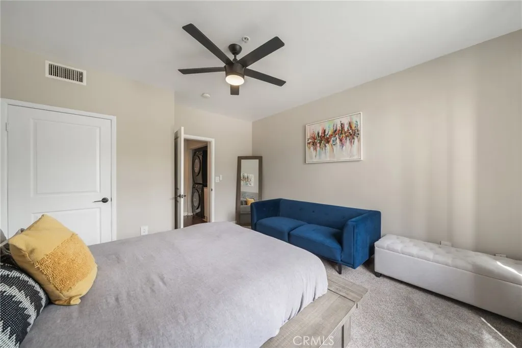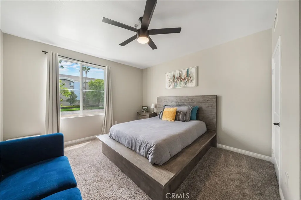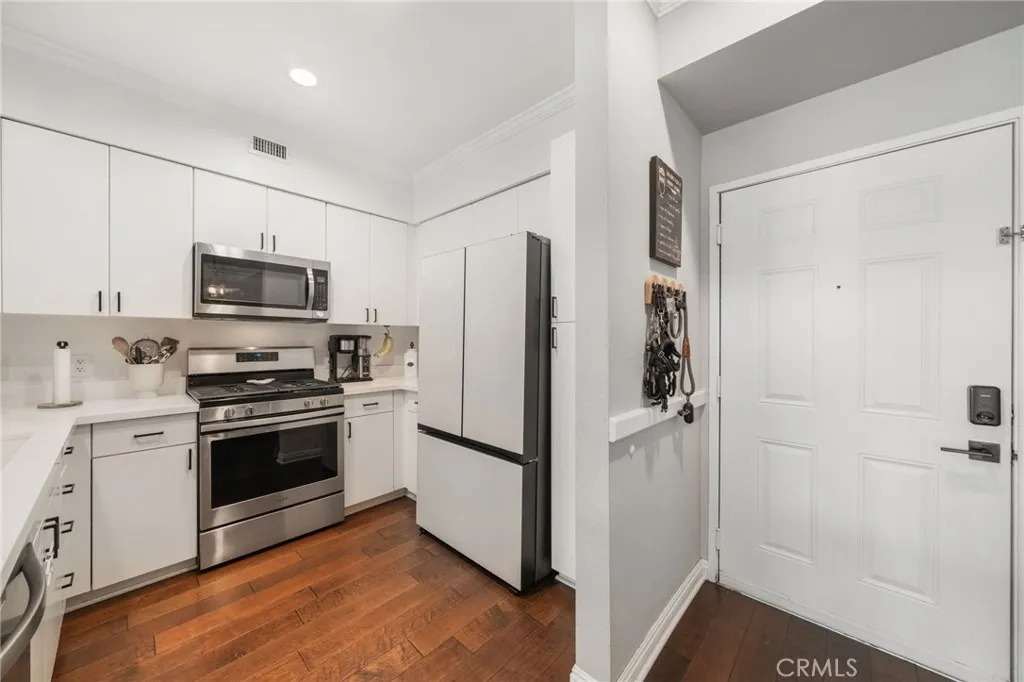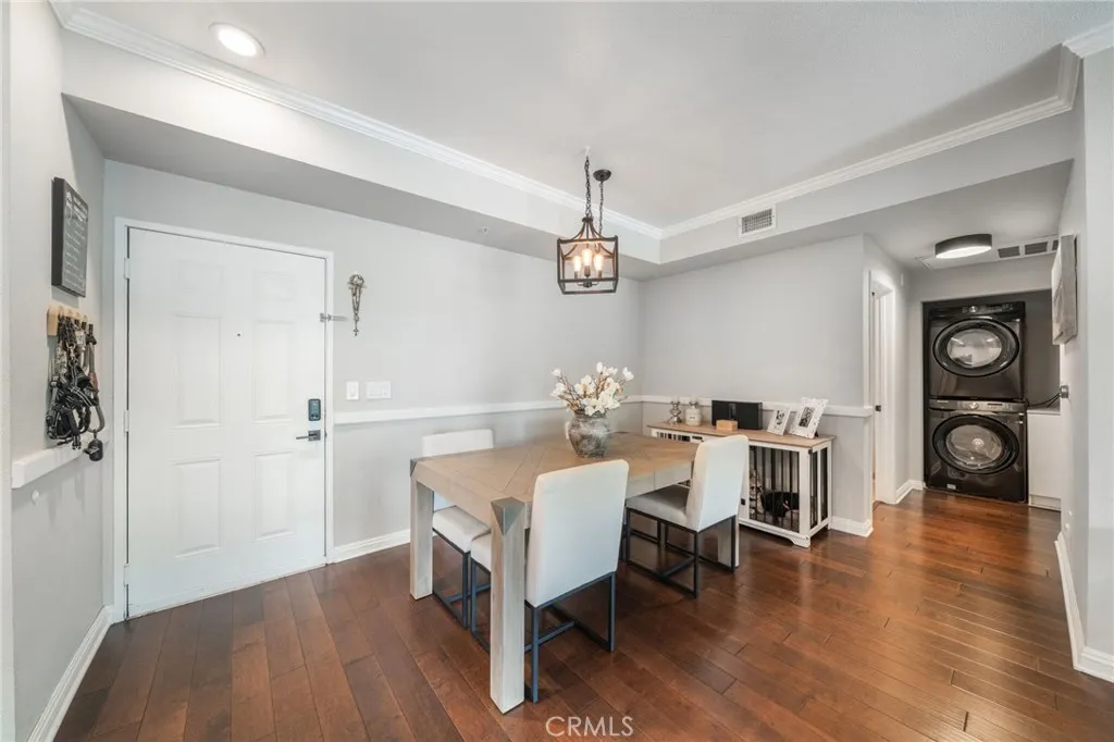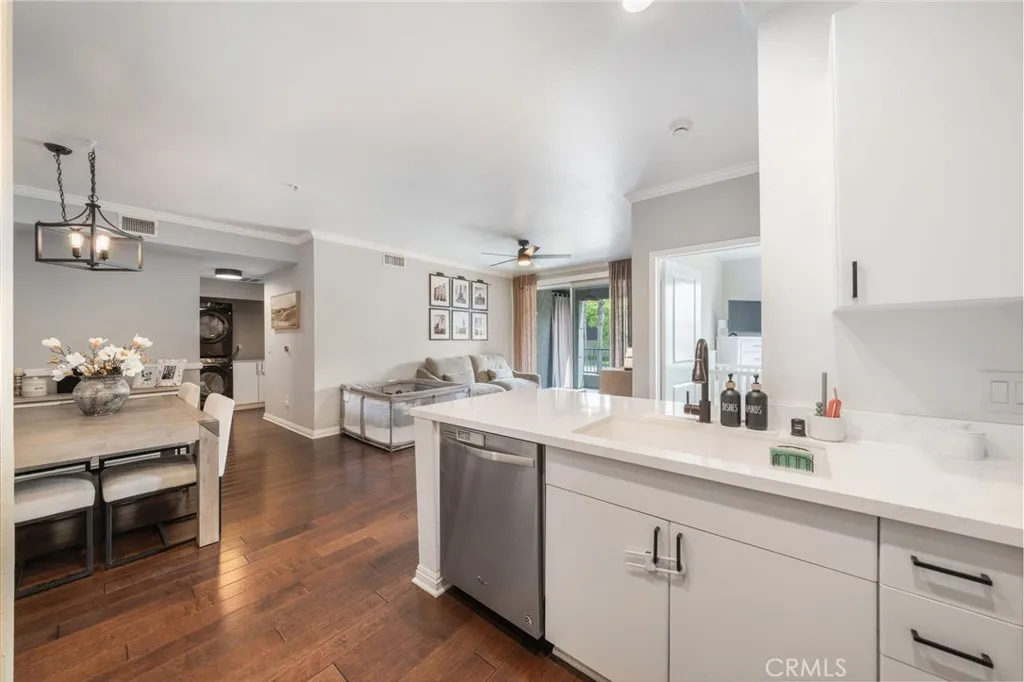 Welcome to Stadium Lofts, where modern living meets everyday convenience in the heart of Anaheim’s Platinum Triangle. This 2-bedroom, 2-bath residence offers an open, airy layout with hardwood floors, crown molding, and a functional design that flows naturally for everyday living. The kitchen has been recently remodeled with sleek white cabinetry, matching appliances, and a refreshed, contemporary feel that ties the space together. Down the hall, a dedicated laundry area accommodates a side-by-side washer and dryer, offering the convenience of in-unit laundry. Life at Stadium Lofts extends beyond your front door. Enjoy resort-style amenities including a fitness center, pool and spa, dry sauna, conference room, game room, landscaped courtyards, BBQ areas, and EV charging stations, all complemented by low HOA fees. Positioned just minutes from Angel Stadium, Honda Center, Disneyland, Anaheim GardenWalk, The Outlets at Orange, and the ARTIC/Amtrak station, you’re surrounded by some of Orange County’s top dining, entertainment, and shopping. Easy access to the 5, 57, 22, and 55 freeways makes commuting simple. VA and FHA approved, offering flexibility for both primary residence buyers and long-term investment potential. Close proximity to Chapman University, West Coast University, and UCI Medical Center adds to the overall convenience and rental appeal.