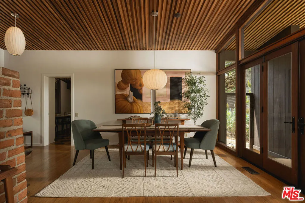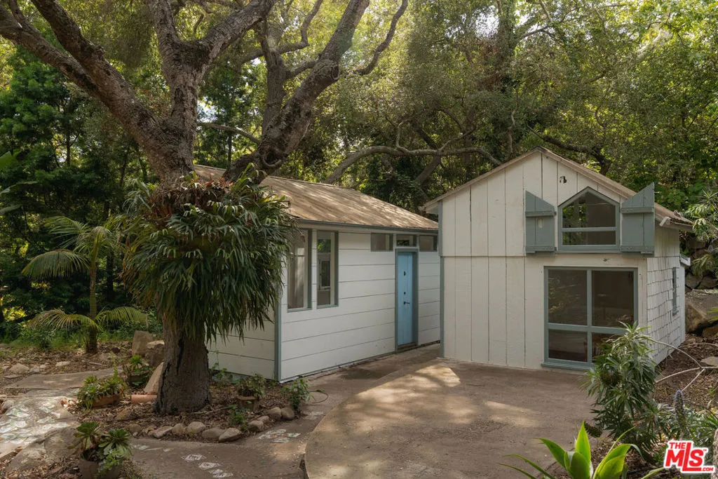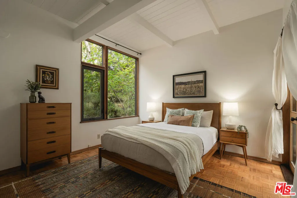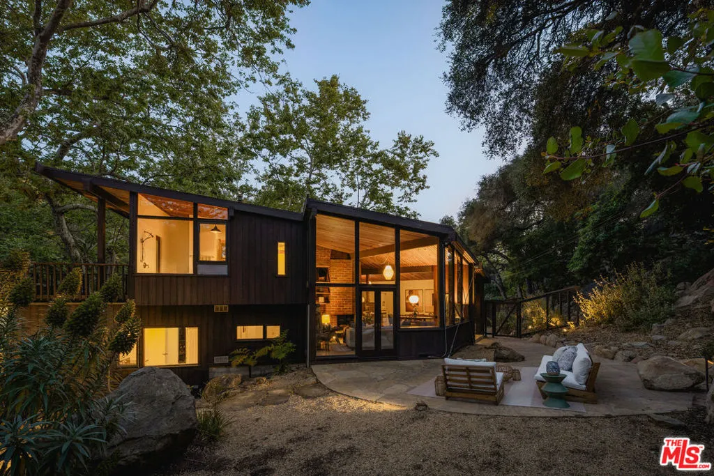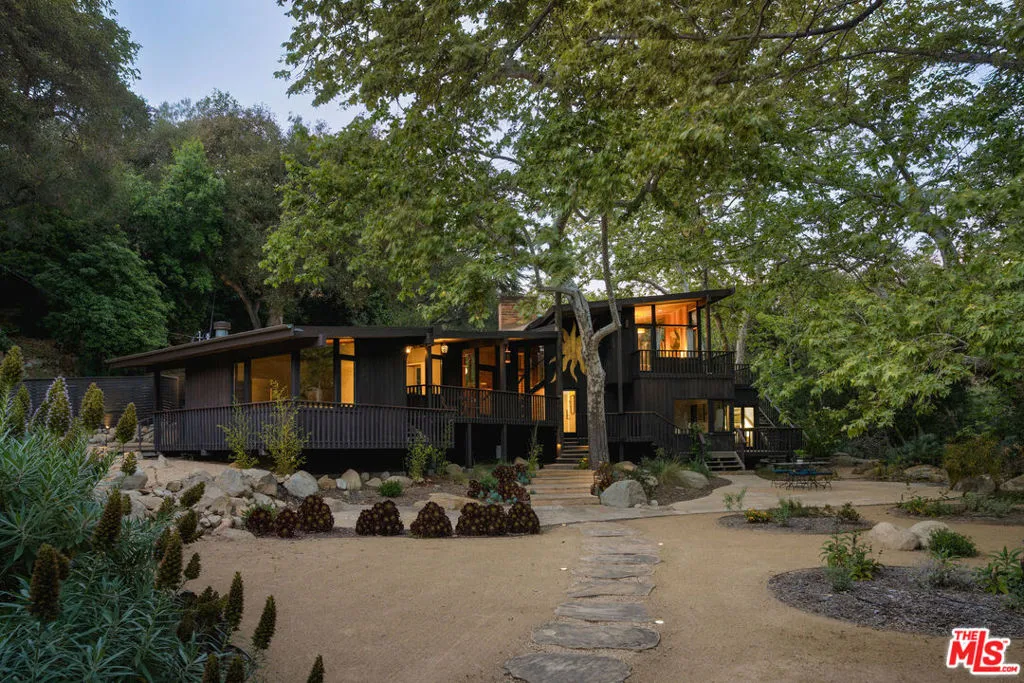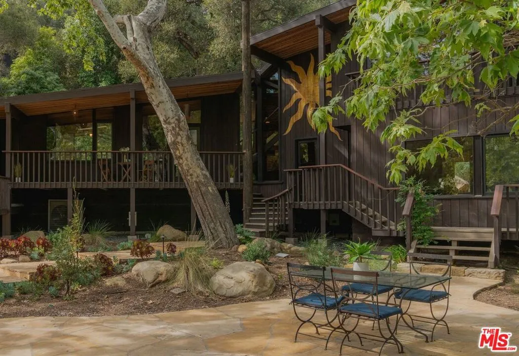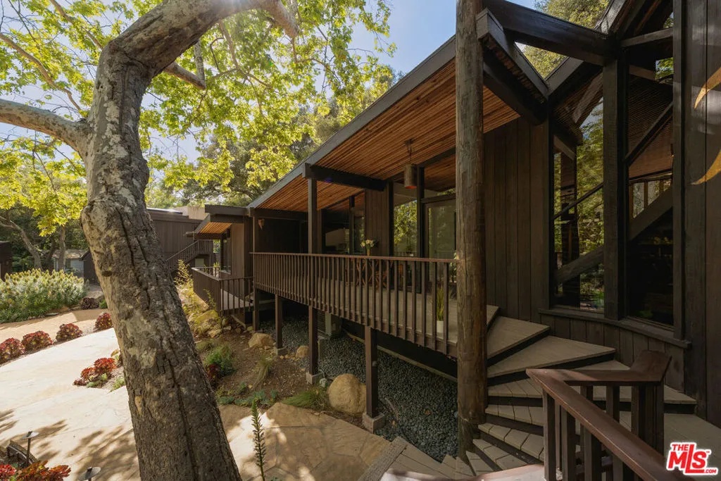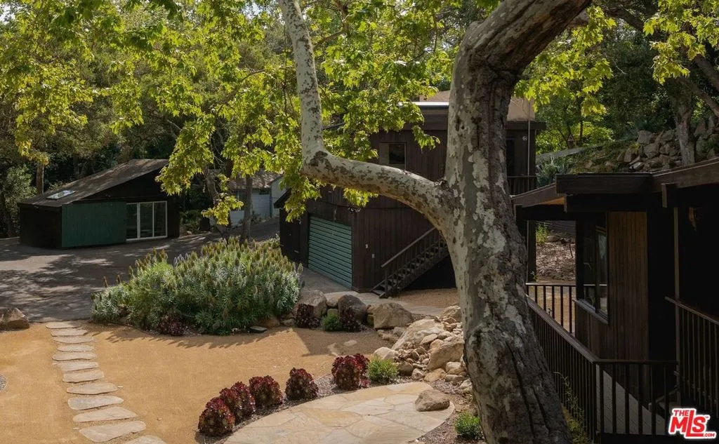 MID-CENTURY MODERN MASTERPIECE on a private lane in Mission Cyn. The 1964 Edwards & Pitman post-and-beam home is a secluded sanctuary on a wooded creekside acre. The multi-level, open floor plan is flooded with light. Brickwork, restored plank floors & rhythmic wood ceilings add linear flow & impeccable artistry. Updated kitchen retains mid-century charm, with modern amenities; step down into a den/office. The primary suite occupies the top floor with park-like views from the deck. Two bedrooms, playroom & full bath complete the lower level. Four stand-alone buildings include a sunny loft atop the garage, a large art studio & 2 petite cottages. Meticulously maintained to preserve its original integrity, this stunning property offers unparalleled peace moments from downtown's vibrancy.