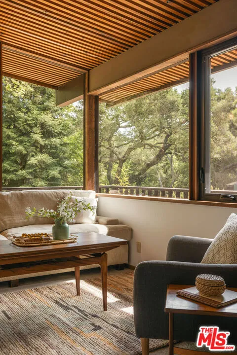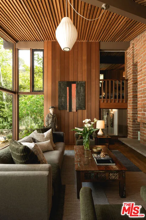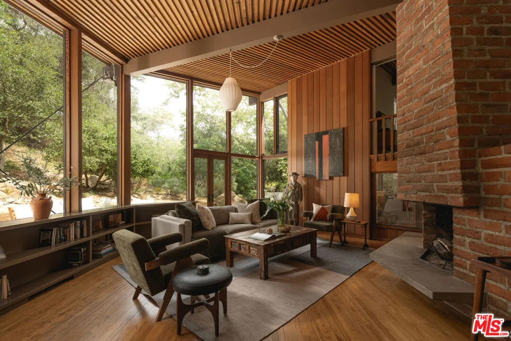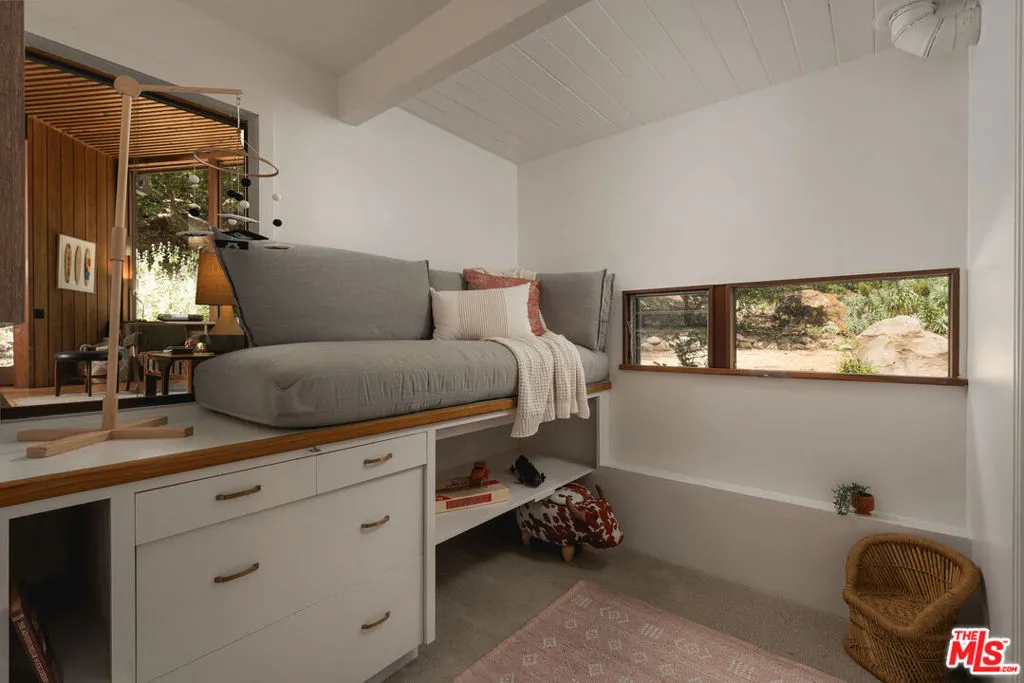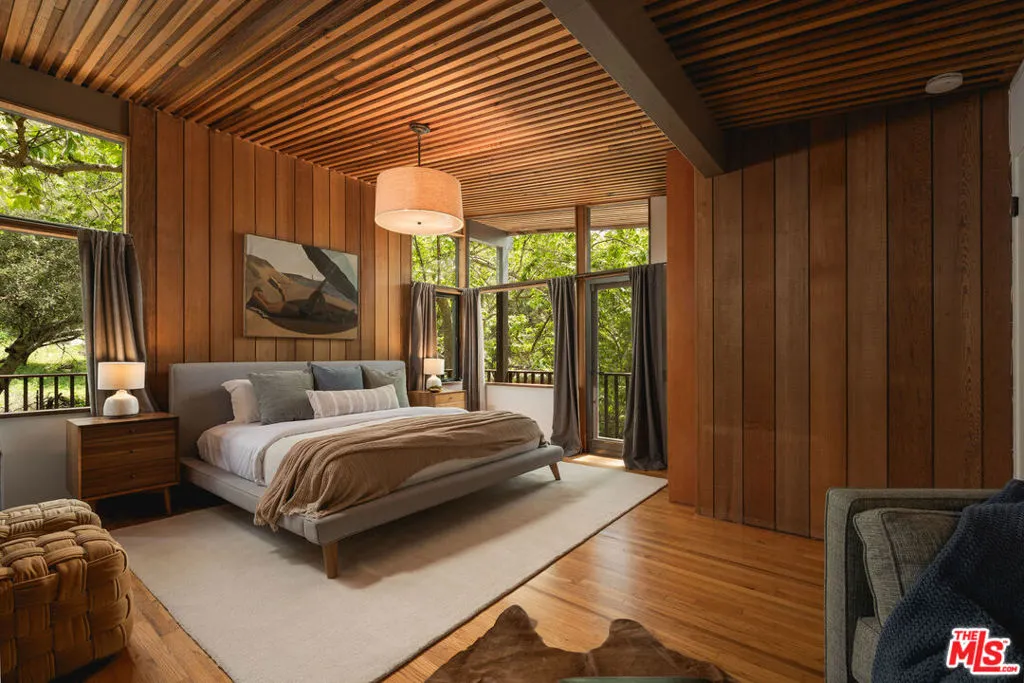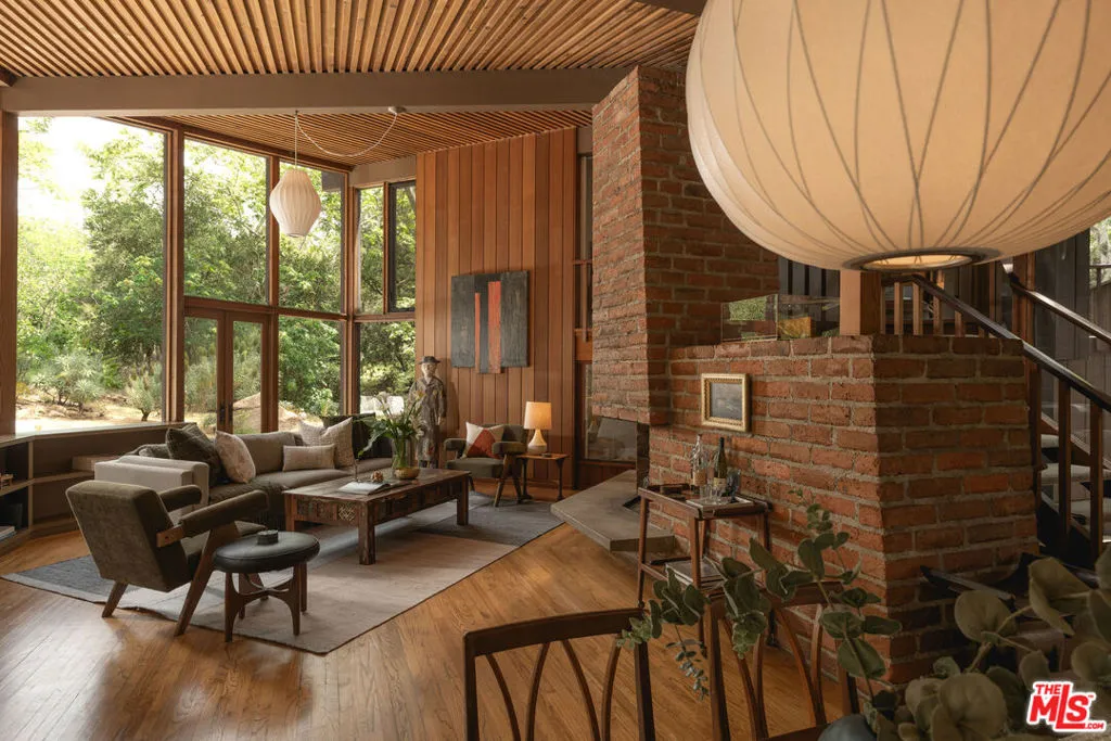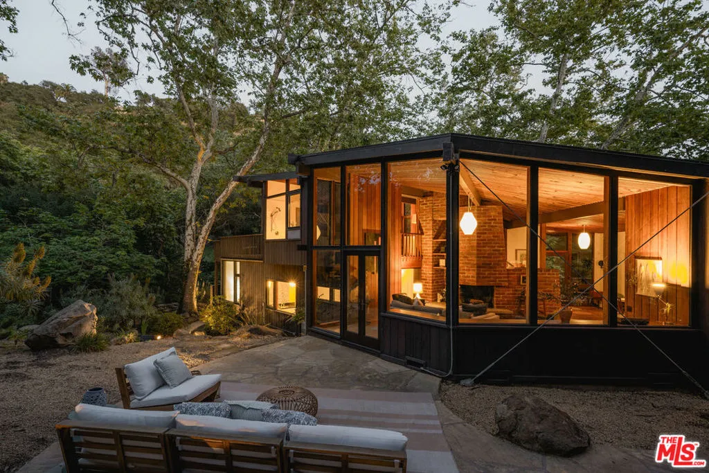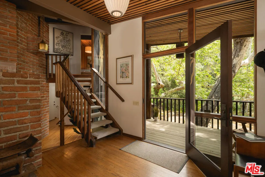 MID-CENTURY MODERN MASTERPIECE on a private lane in Mission Cyn. The 1964 Edwards & Pitman post-and-beam home is a secluded sanctuary on a wooded creekside acre. The multi-level, open floor plan is flooded with light. Brickwork, restored plank floors & rhythmic wood ceilings add linear flow & impeccable artistry. Updated kitchen retains mid-century charm, with modern amenities; step down into a den/office. The primary suite occupies the top floor with park-like views from the deck. Two bedrooms, playroom & full bath complete the lower level. Four stand-alone buildings include a sunny loft atop the garage, a large art studio & 2 petite cottages. Meticulously maintained to preserve its original integrity, this stunning property offers unparalleled peace moments from downtown's vibrancy.