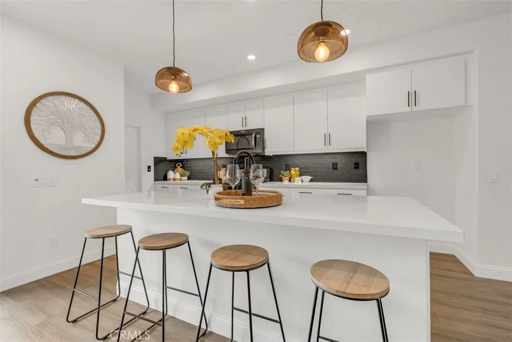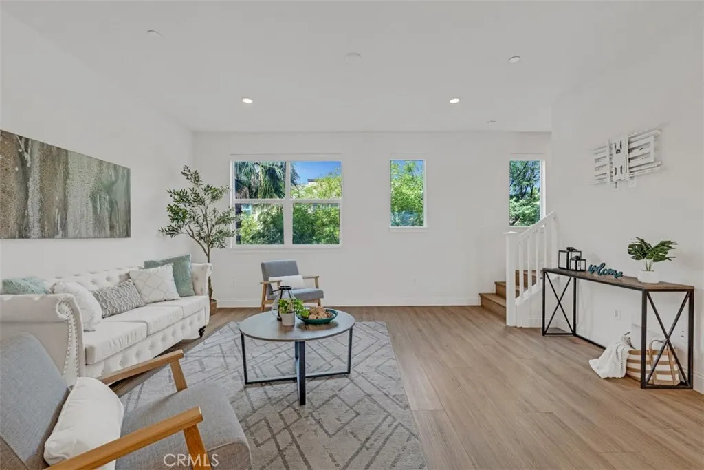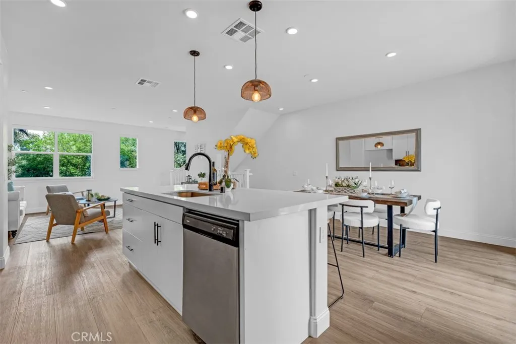 Built in 2020, this modern townhome offers a bright open floor plan with high ceilings, recessed lighting, and upgraded flooring throughout. The spacious living room connects to a stylish kitchen featuring quartz countertops, stainless steel appliances, and a center island. Dining area opens to a private balcony. Upstairs includes well-sized bedrooms and a primary suite with ample closet space and a contemporary bathroom. Additional features include in-unit laundry, attached garage, and energy-efficient systems. Conveniently located near shopping, dining, and major freeways.