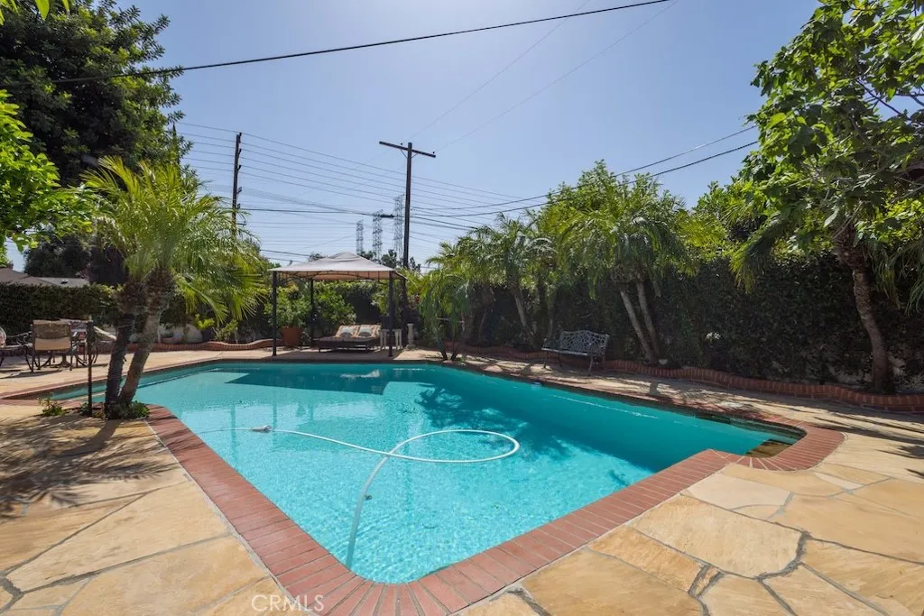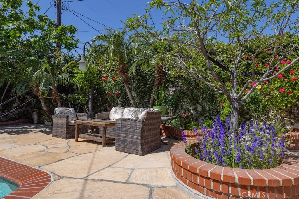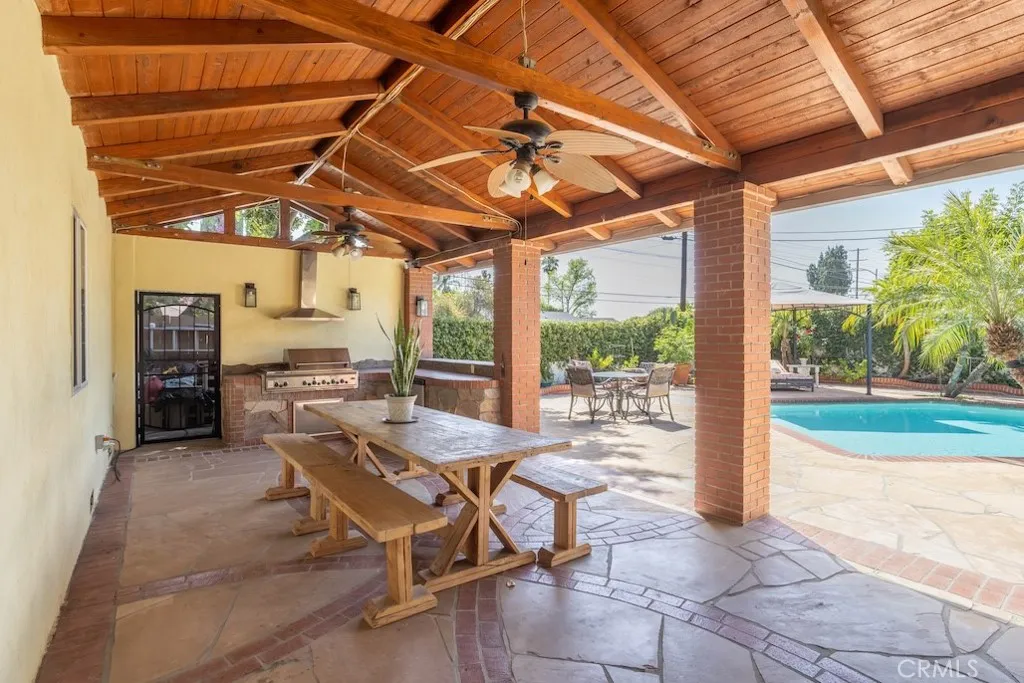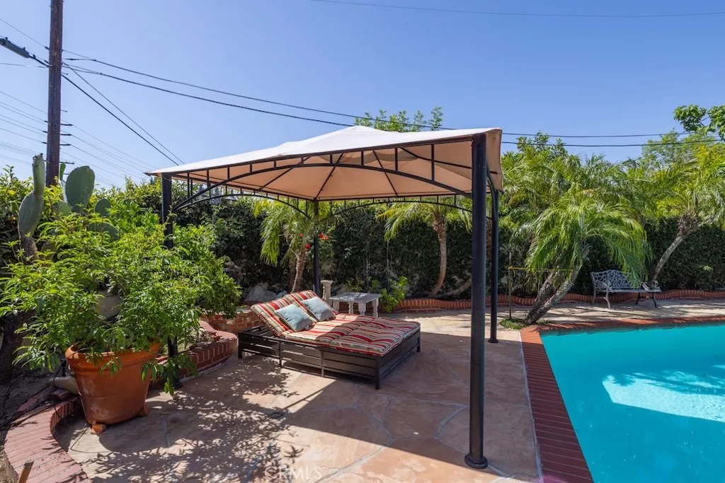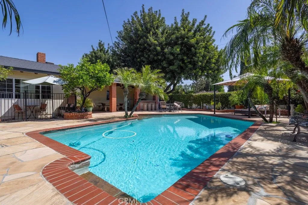 Welcome to this stunning Northridge residence, a 3 bedroom, 2 bathroom home that perfectly blends elegance, comfort, and functionality. Situated on a desirable corner lot, the property is fully fenced with stately red brick pillars and decorative iron gates. Automatic gates open to a secured flagstone driveway and lead to the spacious, finished 2-car garage. The corner location offers ample street parking and the convenience of two separate entryways. Step inside to be greeted by an inviting open concept design that effortlessly connects the kitchen, formal dining area, and living room. Warm, wood-like flooring flows throughout, creating a cohesive and welcoming atmosphere. The updated kitchen is a chef’s delight with granite countertops, built in ovens, and a versatile island ideal for casual dining or entertaining. The living room, anchored by a cozy fireplace, opens directly to the backyard oasis. Off the kitchen, you’ll find a laundry area and an updated full bathroom, perfect for guests or extended family. Down the hall are three generously sized bedrooms and another modern full bath. The primary suite is bathed in natural light and features dual closets for abundant storage. Adjacent to the formal dining area is a permitted living room flex space currently transformed into a charming studio. This versatile area boasts vaulted wood beam ceilings, Spanish tile floors, a kitchenette, private bathroom, and its own separate entry, along with a private patio accessible via the side yard. This space is ideal for extended family, a home office, or easy conversion back to a living room. The backyard is a true entertainer’s paradise. It features a sparkling pool, soaring wood-beam patio cover, and flagstone flooring throughout. Enjoy a built-in BBQ with an exhaust fan, a stone island with bar stools, multiple seating areas, raised planters, mature trees, and accent lighting that brings the space to life in the evenings. Whether hosting summer parties or enjoying quiet evenings, this backyard is the perfect retreat. This Northridge gem combines versatile living spaces, thoughtful updates, and a backyard designed for year round enjoyment offering the ultimate California lifestyle. Close proximity to shopping at the Northridge Fashion Center that houses Portos, EoS Fitness (formally Golds Gym), Apple Store, AMC Theaters, Yard House, and Northridge Farmers Market to name a few. Amazing location, close to Cal State Northridge and major freeways.