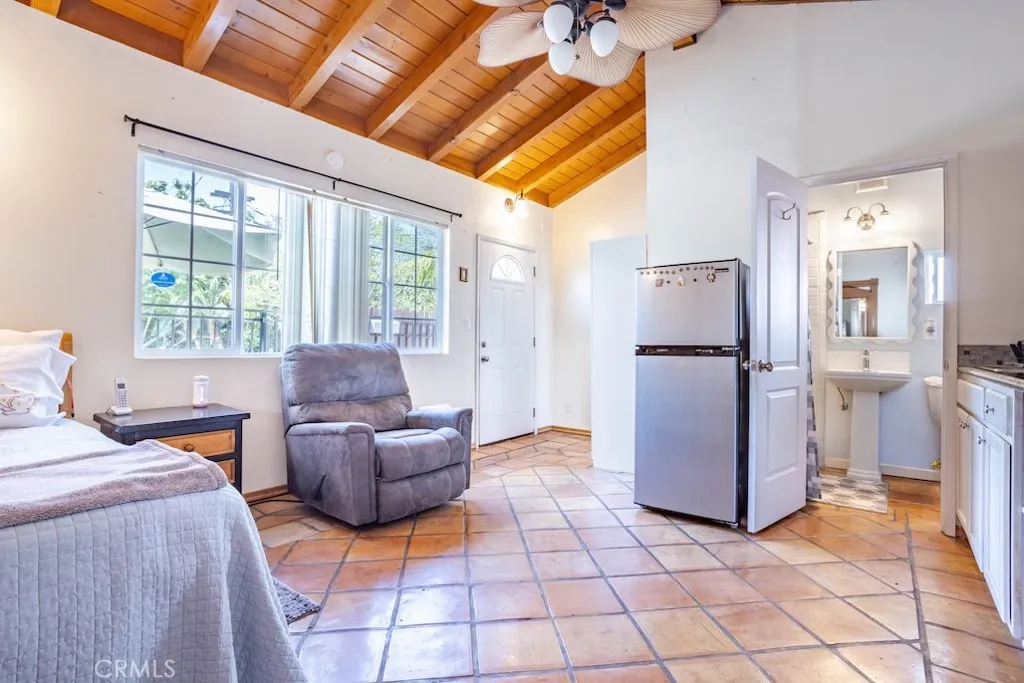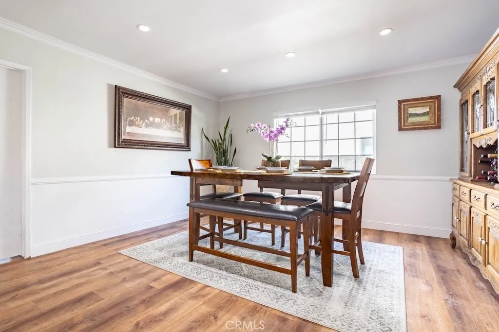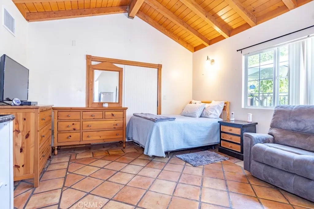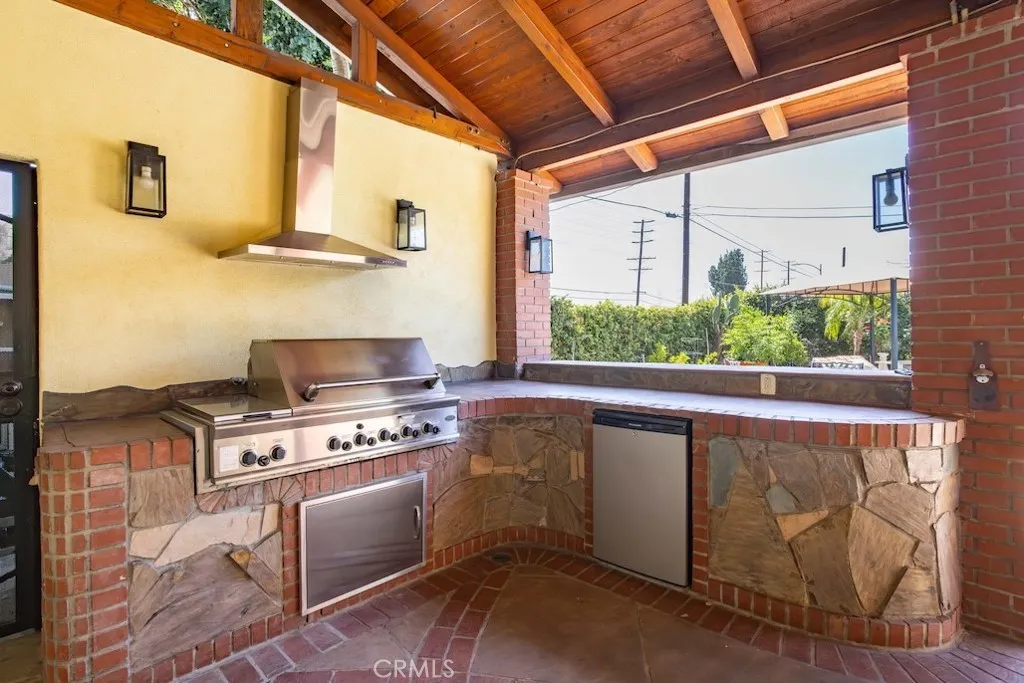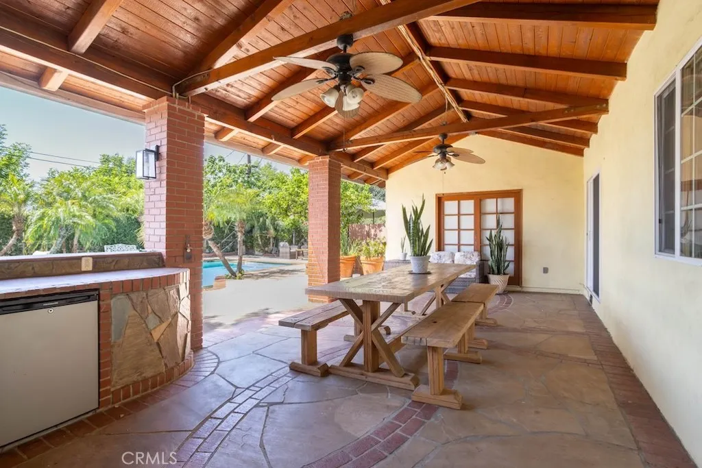 Welcome to this stunning Northridge residence, a 3 bedroom, 2 bathroom home that perfectly blends elegance, comfort, and functionality. Situated on a desirable corner lot, the property is fully fenced with stately red brick pillars and decorative iron gates. Automatic gates open to a secured flagstone driveway and lead to the spacious, finished 2-car garage. The corner location offers ample street parking and the convenience of two separate entryways. Step inside to be greeted by an inviting open concept design that effortlessly connects the kitchen, formal dining area, and living room. Warm, wood-like flooring flows throughout, creating a cohesive and welcoming atmosphere. The updated kitchen is a chef’s delight with granite countertops, built in ovens, and a versatile island ideal for casual dining or entertaining. The living room, anchored by a cozy fireplace, opens directly to the backyard oasis. Off the kitchen, you’ll find a laundry area and an updated full bathroom, perfect for guests or extended family. Down the hall are three generously sized bedrooms and another modern full bath. The primary suite is bathed in natural light and features dual closets for abundant storage. Adjacent to the formal dining area is a permitted living room flex space currently transformed into a charming studio. This versatile area boasts vaulted wood beam ceilings, Spanish tile floors, a kitchenette, private bathroom, and its own separate entry, along with a private patio accessible via the side yard. This space is ideal for extended family, a home office, or easy conversion back to a living room. The backyard is a true entertainer’s paradise. It features a sparkling pool, soaring wood-beam patio cover, and flagstone flooring throughout. Enjoy a built-in BBQ with an exhaust fan, a stone island with bar stools, multiple seating areas, raised planters, mature trees, and accent lighting that brings the space to life in the evenings. Whether hosting summer parties or enjoying quiet evenings, this backyard is the perfect retreat. This Northridge gem combines versatile living spaces, thoughtful updates, and a backyard designed for year round enjoyment offering the ultimate California lifestyle. Close proximity to shopping at the Northridge Fashion Center that houses Portos, EoS Fitness (formally Golds Gym), Apple Store, AMC Theaters, Yard House, and Northridge Farmers Market to name a few. Amazing location, close to Cal State Northridge and major freeways.
