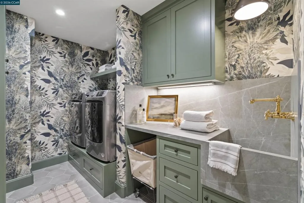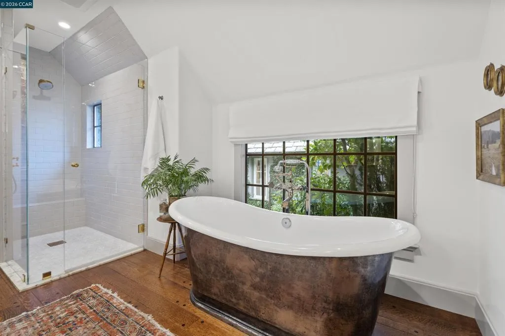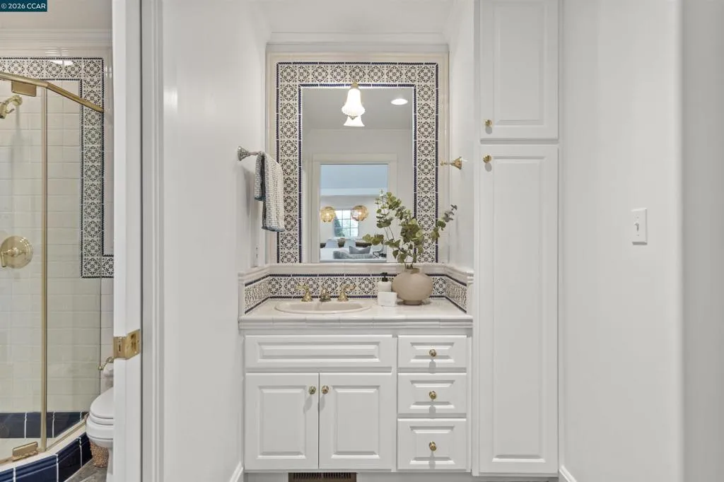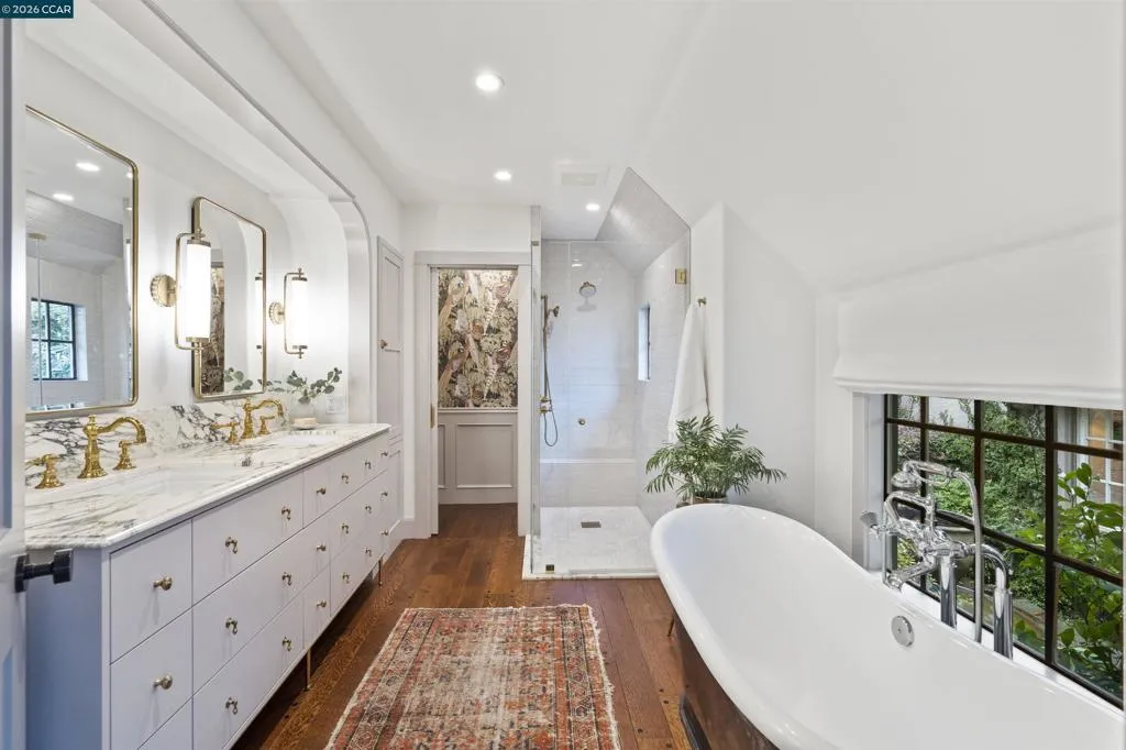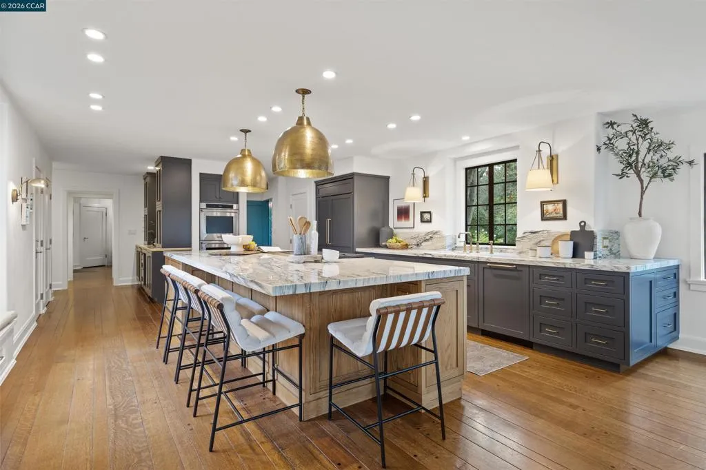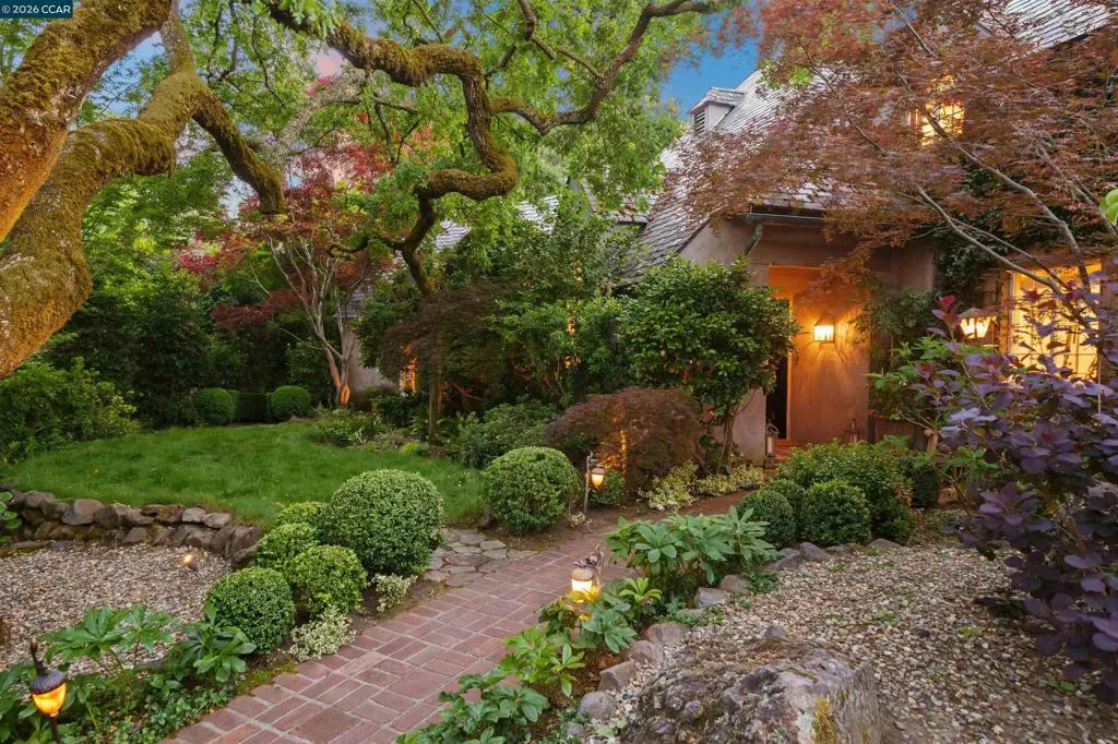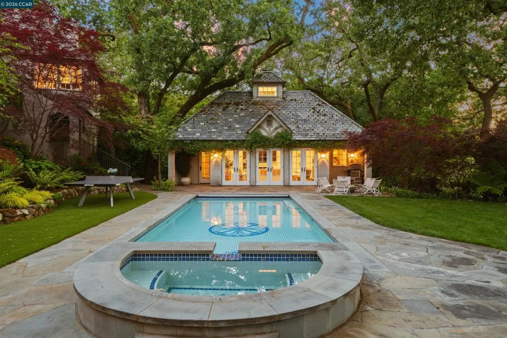 Designed in 1933 by Miller & Warnecke, this slate-roofed Tudor is one of Orinda Country Club's most enchanting estates — nestled among heirloom oaks, Japanese maples, and nearly year-round blooms. The soaring beamed living room features a wood-burning fireplace and French doors to a brick terrace with café lights. The 2022 chef's kitchen impresses with custom navy and oak cabinetry, marble countertops, Wolf range, Dacor double oven, Sub-Zero refrigerator, and Miele dishwasher, opening to a family room and informal dining. A butler's bar with pink quartzite and beverage fridge completes the entertaining flow. The primary suite offers a spa bath with freestanding tub, Waterworks fixtures, marble double vanity, and garden views. Three additional beds and 2.5 baths in the main house, plus a 741 sq ft 1 bed/1 bath pool house for guests or a studio. Outside: mosaic-tiled pool and spa, built-in fire pit, putting green, wine cellar, and meandering garden paths. Four fireplaces, a greenhouse shed, wine cellar, and bonus attic space. Minutes to OCC, downtown, BART, Hwy 24, and top-rated K–12 schools.