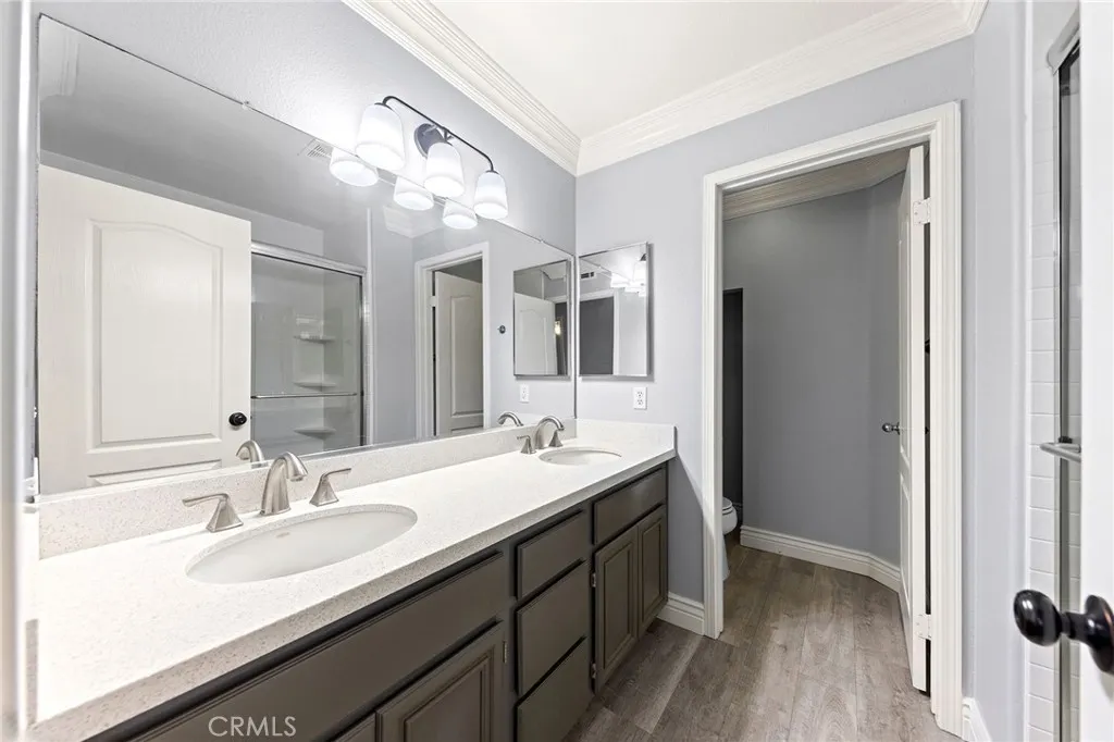 This beautifully upgraded 5-bedroom home in Hunters Hill showcases exceptional curb appeal and thoughtfully designed living spaces. A striking leaded mahogany and glass front door opens to a warm and inviting foyer. The gourmet kitchen features stainless steel appliances, a center island, and granite countertops, seamlessly connecting to the family room with custom built-ins, a designer accent wall, and a cozy fireplace—ideal for both everyday living and entertaining. The formal living and dining rooms with vaulted ceilings provide an elegant setting for gatherings. The spacious primary suite offers a peaceful retreat, complete with a recently remodeled, spa-inspired bathroom featuring a custom dual vanity, quartz countertops, and a walk-in shower. Upstairs, three additional bedrooms share a beautifully updated secondary bathroom. A convenient downstairs bedroom and full bath add flexibility for guests or extended family. Additional highlights include an indoor laundry room with sink, newer dual-pane windows, wood shutters, and a Trane 5-zone HVAC system with HEPA filtration. The private backyard features an above-ground spa and scenic hill views. Ideally located near parks, shopping, freeways, and top-rated schools.