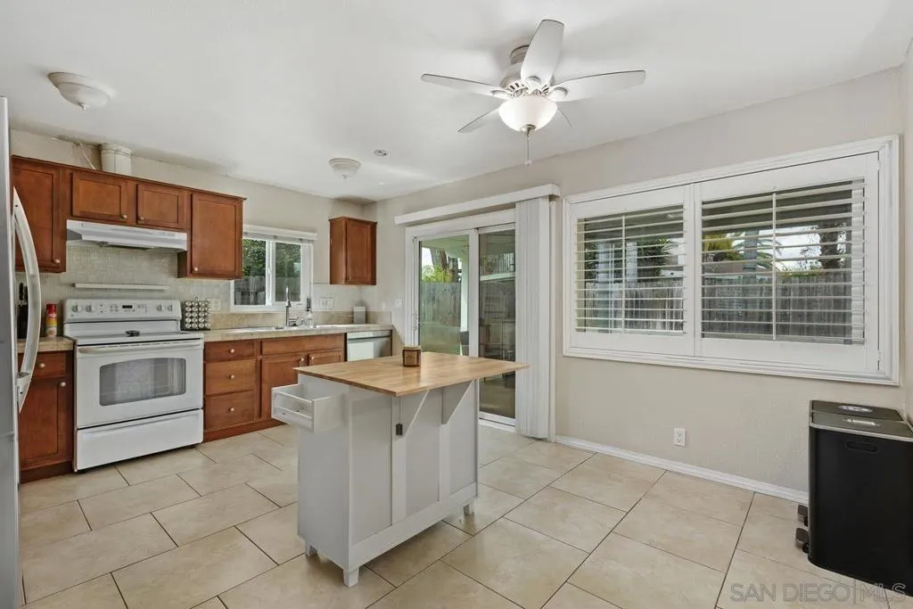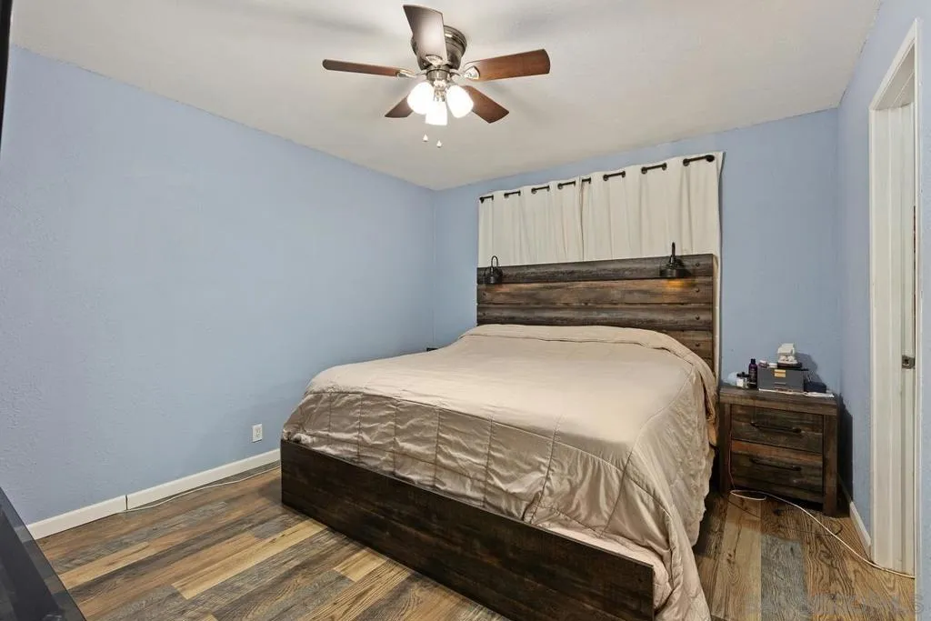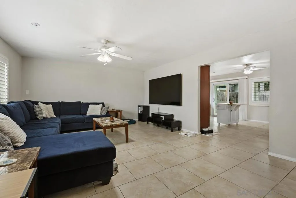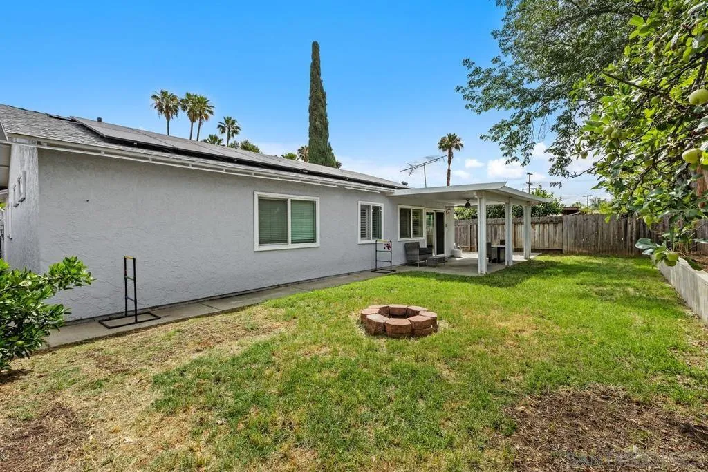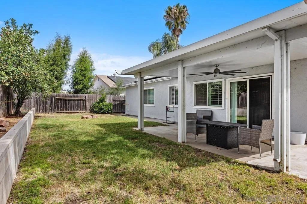 This charming single-level home offers 3 bedrooms and 2 updated bathrooms, ideally situated on a quiet street. Inside, you’ll find a spacious living room that flows seamlessly into an open-concept kitchen - perfect for both everyday living and entertaining. Tile flooring enhances the main living areas, while newer laminate flooring adds warmth and comfort to the bedrooms. The primary suite features a generously sized walk-in closet, and both bathrooms have been recently renovated. Window shutters and ceiling fans throughout the living spaces add comfort and style. The home is equipped with dual-pane vinyl windows for energy efficiency, a new roof installed in 2022, and a leased solar system added in 2023. Step outside to enjoy a flat, usable backyard complete with a covered, lighted patio, some fruit trees, and a grassy area which is ideal for gatherings or relaxing evenings. A large side yard offers additional flexibility for storage or recreation. The front exterior welcomes you with a spacious porch and attractive landscaping highlighted by roses and succulents, creating inviting curb appeal.