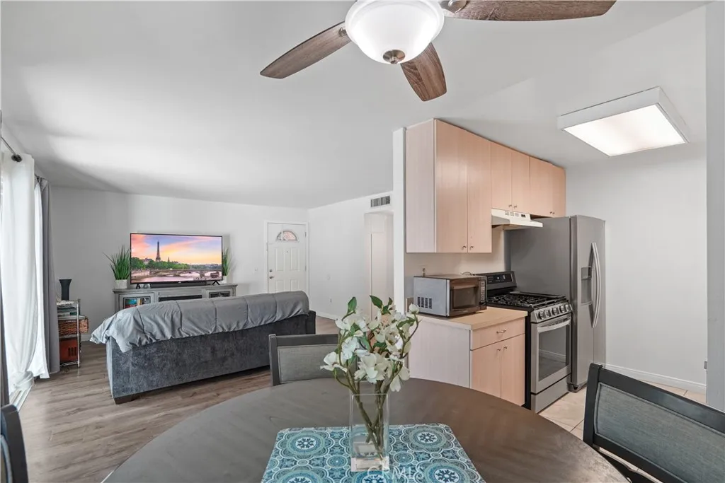 Welcome to this beautifully maintained, FHA-approved 3-bedroom, 2-bathroom condo located in the highly sought-after Granada Hills Charter High School district. This inviting first-floor unit offers 960 sq. ft. of comfortable living space, featuring scraped ceilings and stylish wood-look flooring throughout. Step inside a light-filled living room with sliding glass doors that open to your own private patio—perfect for morning coffee or unwinding at the end of the day. The open-concept layout flows effortlessly into the dining area and kitchen, where ample counter space makes both everyday living and entertaining easy. The spacious primary suite offers a walk-in closet and a private en-suite bathroom, creating a quiet retreat within the home. Additional highlights include newer Milgard windows and a sliding door, enhancing both energy efficiency and comfort. This home also includes two covered tandem parking spaces and access to well-maintained community amenities, including a pool, BBQ area, and recreation room. Pet-friendly and conveniently located near CSUN, shopping, dining, and major freeways, this condo checks all the boxes. HOA dues cover gas, water, and trash keeping monthly expenses simple and predictable. A rare combination of location, comfort, and value. This is one you don’t want to miss.
