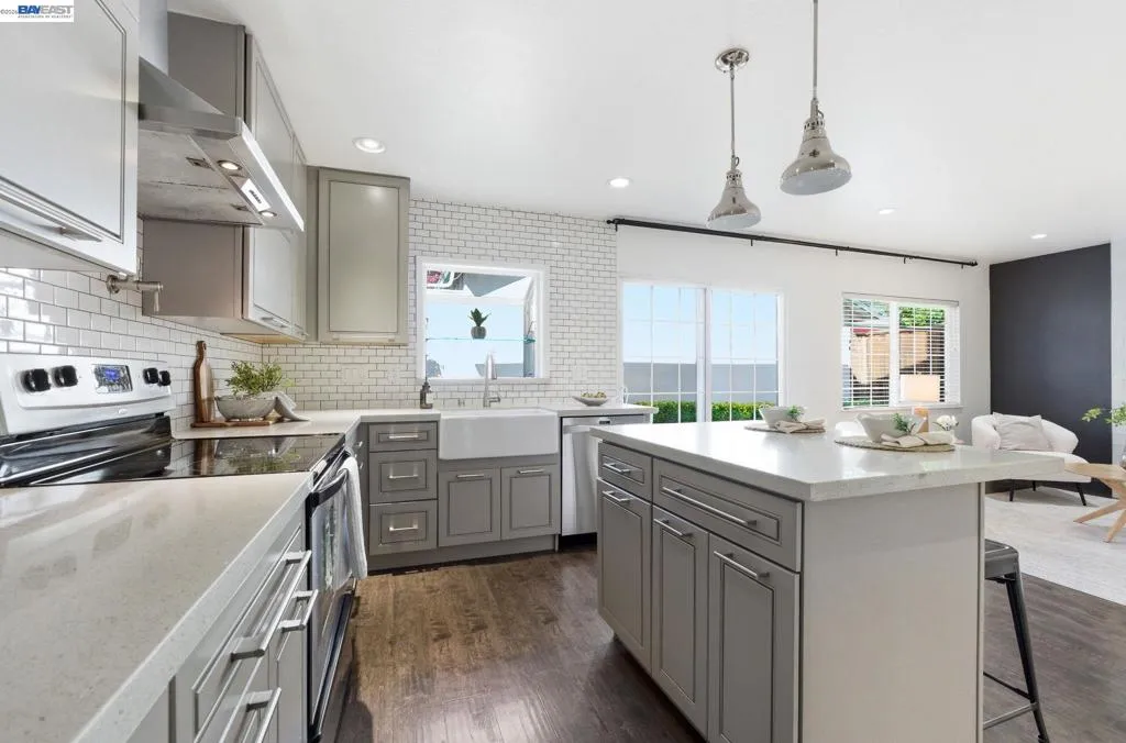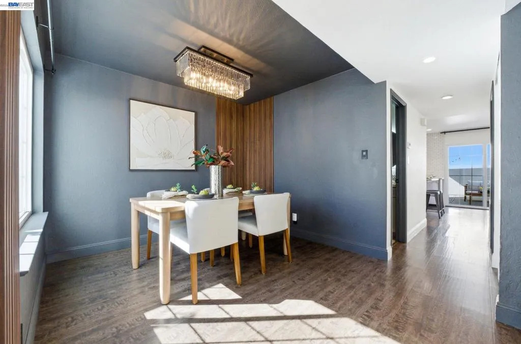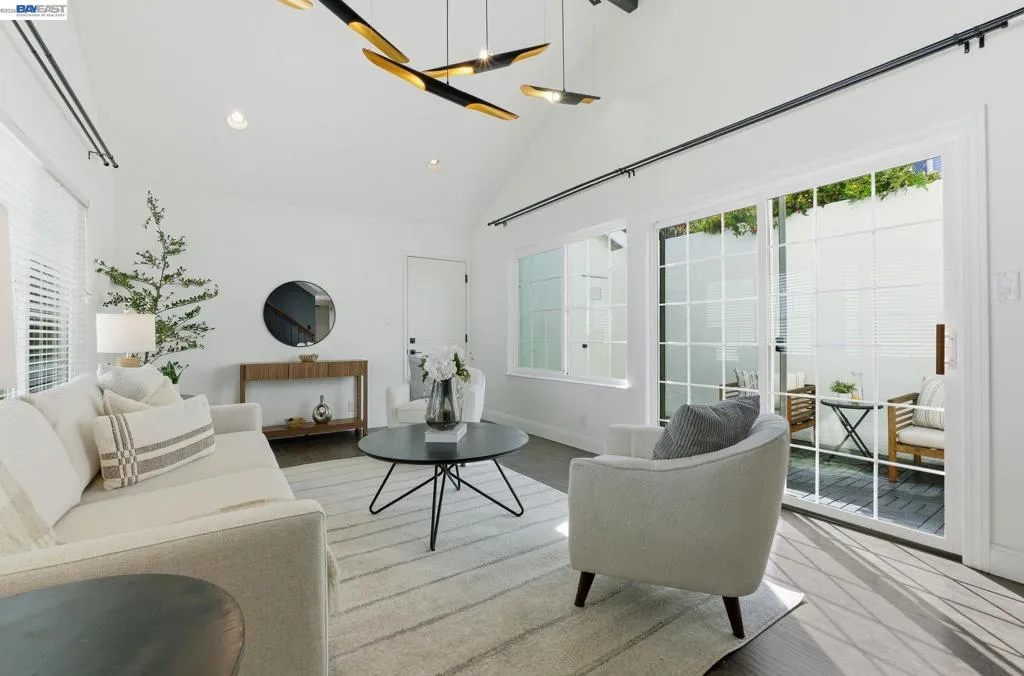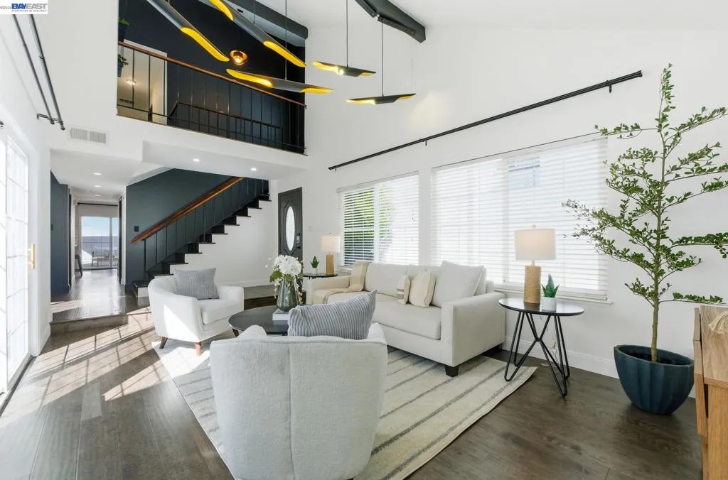 Soaring vaulted ceilings, sculptural designer lighting, and an open, lofty living space set this home apart from the moment you step inside. This stunning four-bedroom, three-bathroom residence has undergone substantial interior updates that emphasize a clean, modern aesthetic throughout. The dramatic living room features vaulted ceilings with an architectural black beam and a striking custom pendant light installation, creating a designer centerpiece that is truly unlike anything else in the neighborhood. An open mezzanine overlooks the living space from above, adding architectural depth and a sense of volume rarely found at this price point. The adjacent dining room continues the design-forward aesthetic with a custom walnut slat accent wall and dramatic crystal chandelier, creating an intimate atmosphere perfectly suited for entertaining. The family room centers around a fireplace with updated tile surround, providing a warm and inviting space for everyday living. The fully updated kitchen is equipped with quartz countertops, custom cabinetry, a decorative tile backsplash, apron sink, pot filler, garden window, and stainless steel appliances, with a central island adding utility for meal prep or casual dining. The 1st floor includes a private bedroom with a renovated full bathroom nearby, featuring a frameless glass shower with large-format tile walls, mosaic tile floor, custom niche, backlit LED vanity mirror, and quartz countertop. This flexible space works equally well as a guest suite, home office, or multigenerational living arrangement. Upstairs, the generously sized primary suite features a sliding barn door leading to a walk-in closet with built-in storage and an updated en-suite bathroom. Two additional 2nd-level bedrooms share a refreshed 3rd bathroom. Interior details include designer-inspired lighting, contemporary finishes, durable laminate flooring, dual-pane windows, and smart home hardware including electronic door locks. Technical upgrades include a tankless water heater, water softener, and central heating. Outside, fresh exterior paint delivers a crisp curb appeal. The grounds are thoughtfully landscaped and easy to maintain, with fragrant jasmine climbing the front fence, a private backyard and side yard, and an enclosed courtyard patio, plus fully grown apple and orange trees. An attached 2-car garage provides laundry hookups & additional storage. Positioned just steps from Lakeshore Park and the peaceful waterfront of Newark Lake.