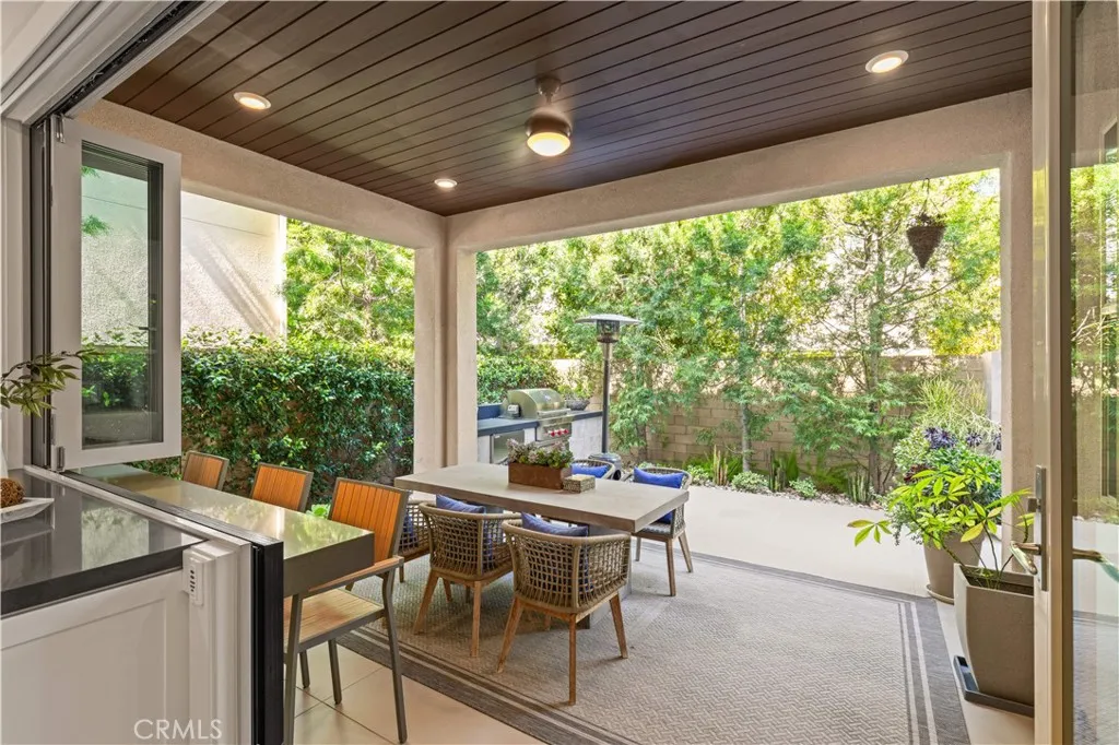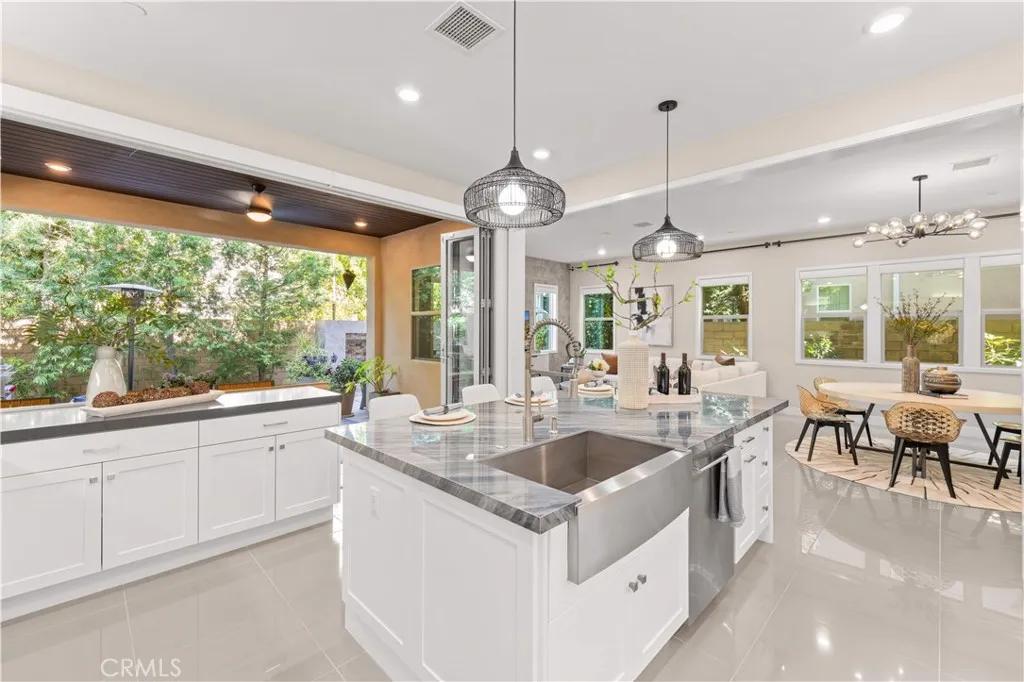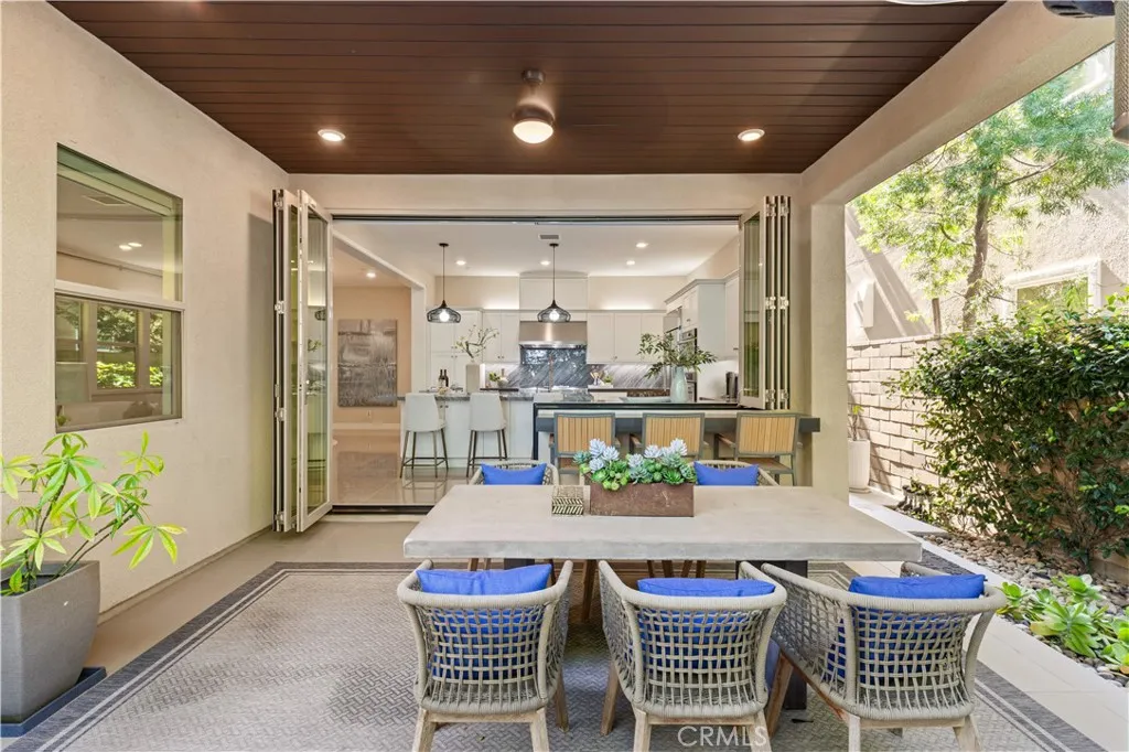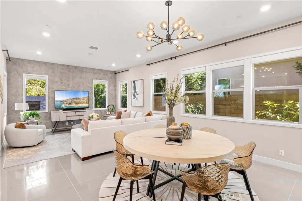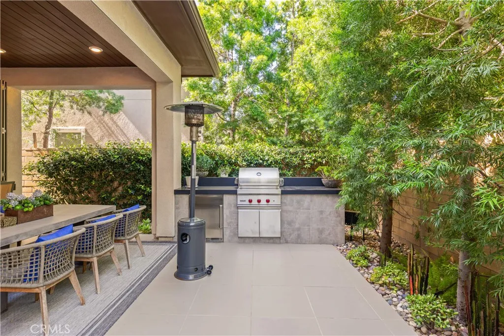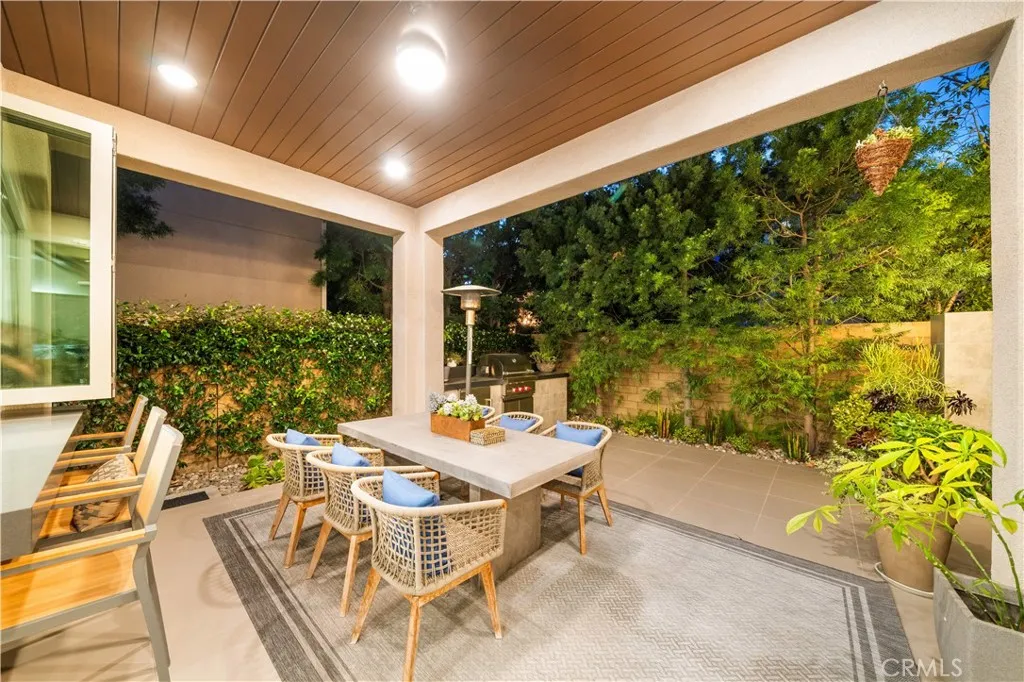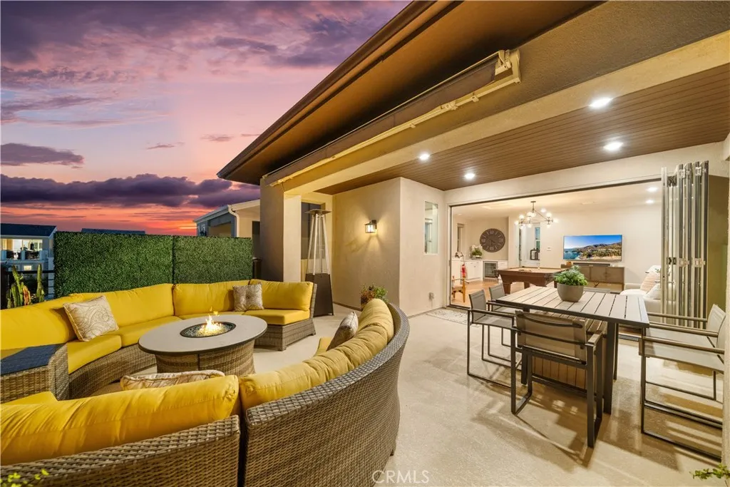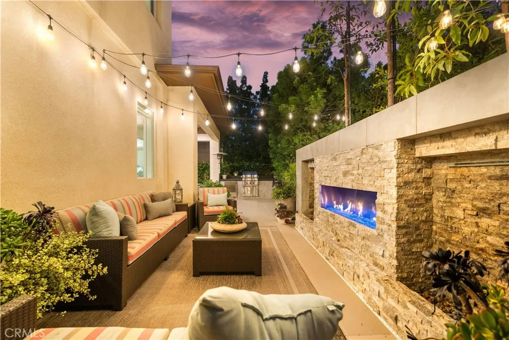 Former model home with designer upgrades, a fully integrated smart home system, a resort-style backyard, and a rare third-floor retreat with open views—ideally positioned on a premium lot with no drive-through traffic and no direct front-facing neighbors, directly across from park and community amenities. This extensively upgraded and meticulously maintained residence offers approximately 3,134 square feet of refined living space, featuring 4 bedrooms, 4 full bathrooms, and 2 powder rooms across three thoughtfully designed levels. A dramatic two-story entry, abundant natural light, and an open-concept layout create a bright and welcoming atmosphere, delivering a true like-new living experience. The gourmet kitchen serves as the centerpiece of the home, showcasing top-of-the-line appliances, upgraded cabinetry, an expanded porcelain island, and a sleek porcelain backsplash—seamlessly connecting to the living and dining areas for both everyday living and entertaining. A desirable first-floor bedroom suite with a full bath offers flexibility for guests or multi-generational living. Designed for modern convenience, the home features a fully integrated smart system with automated blinds, Lutron lighting and fan controls, and app-based access for AC and entry. Step outside to a private, resort-style backyard retreat featuring a built-in kitchen, fireplace, water features, and lush landscaping—creating an exceptional outdoor living experience. Upstairs, the primary suite offers generous space, natural light, and a spa-inspired bathroom with upgraded finishes. Two additional bedrooms complete the second level, and notably, every bedroom features its own en-suite bathroom and custom built-in closet system. The third floor offers a versatile entertainment space with direct access to a private outdoor patio, enhanced with an awning and privacy fence—perfect for a lounge, office, or media room with beautiful open views. Additional highlights include a finished garage with epoxy flooring, built-in cabinetry, overhead storage, Tesla charger, and an expanded driveway. Ideally located within walking distance to Cadence K-8, minutes to Portola High School, and near the future Great Park development, including botanical gardens, lakes and the library. Select furniture and designer decor may be included, offering a turnkey opportunity.