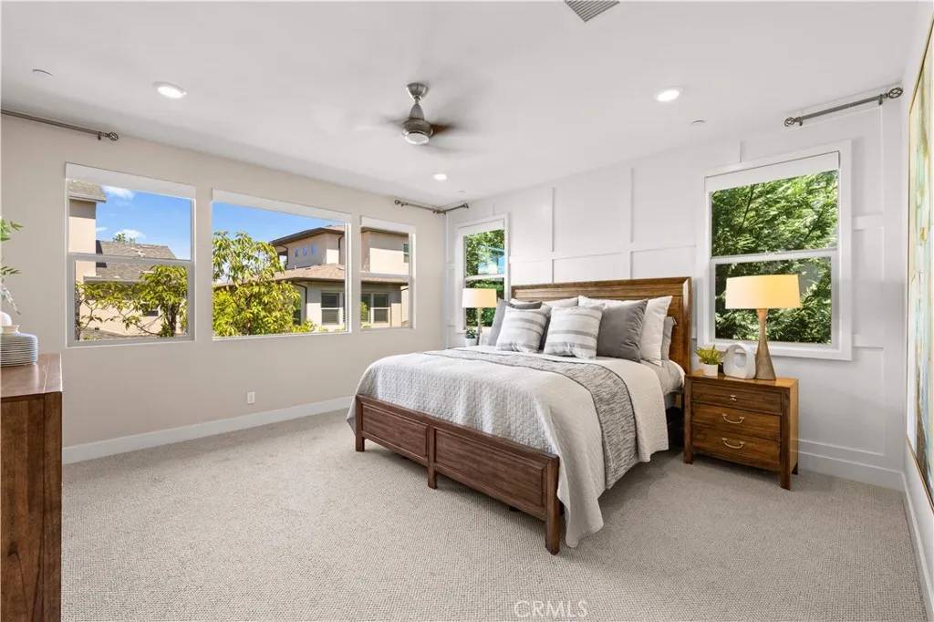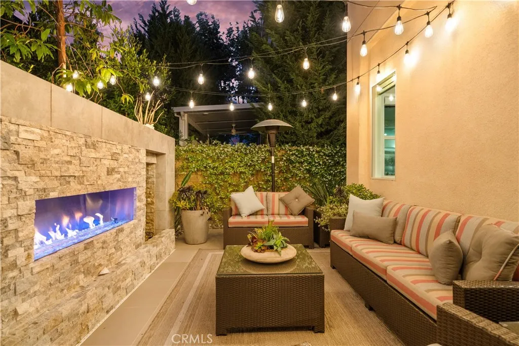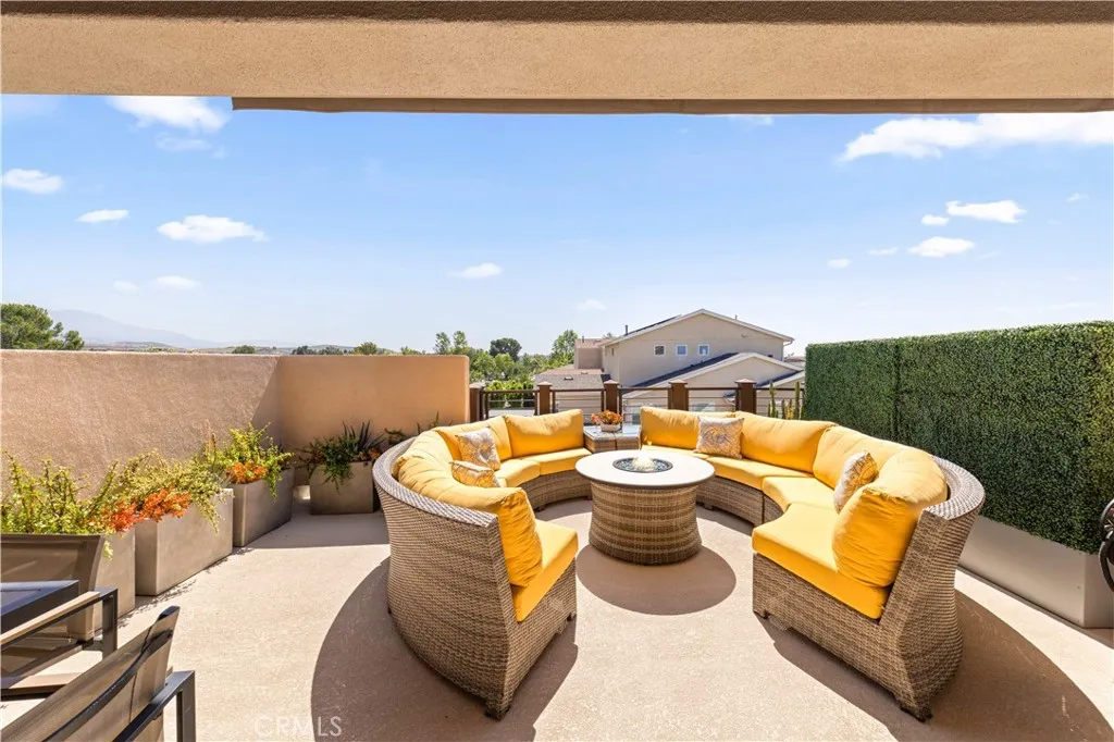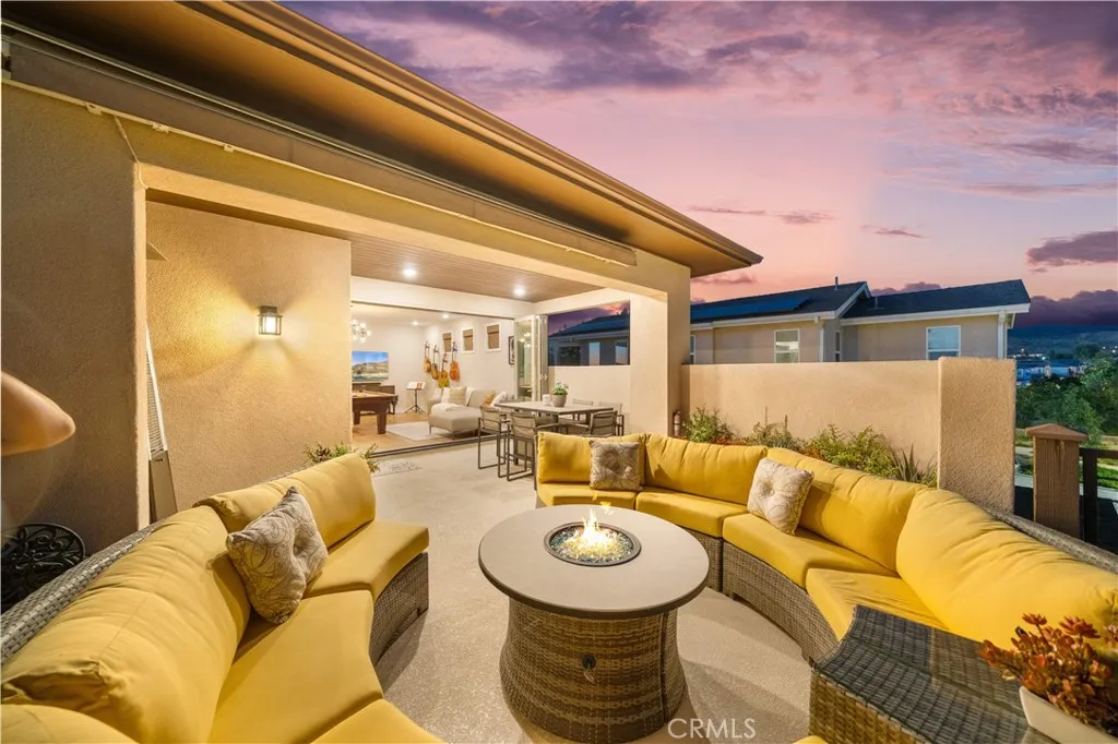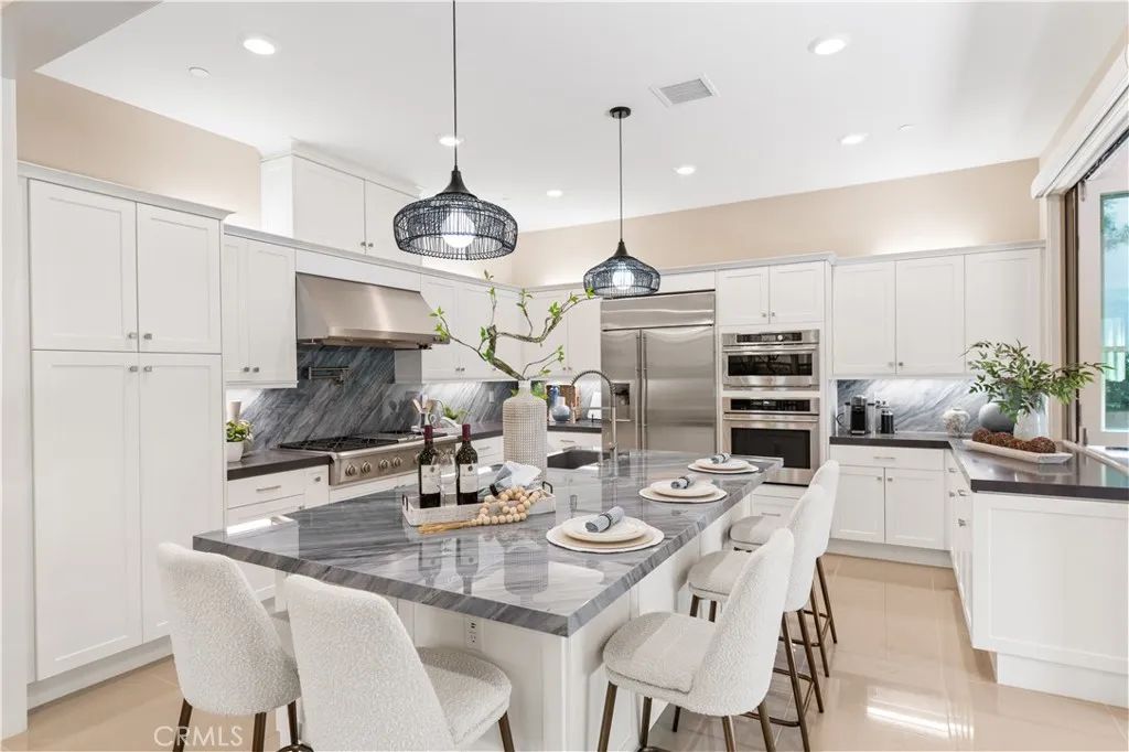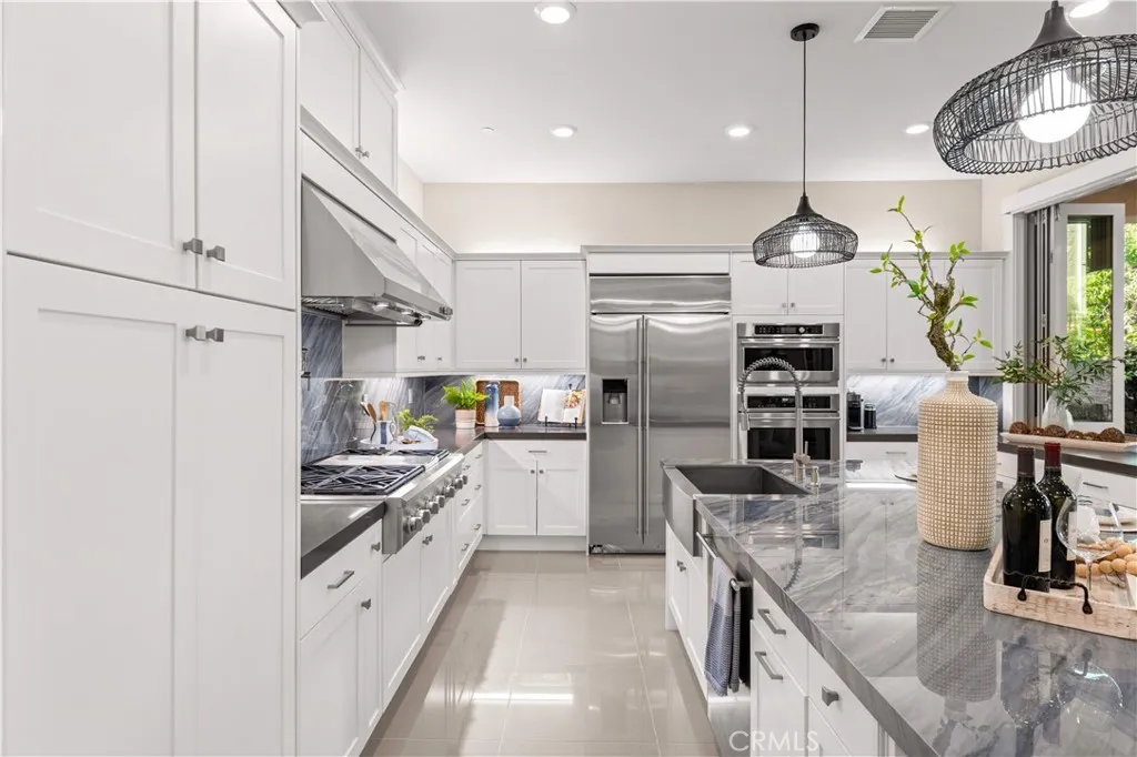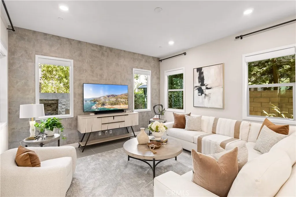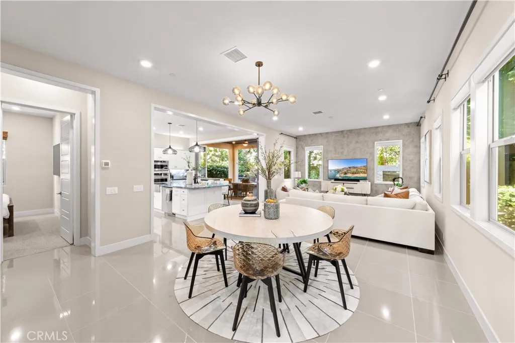 Former model home with designer upgrades, a fully integrated smart home system, a resort-style backyard, and a rare third-floor retreat with open views—ideally positioned on a premium lot with no drive-through traffic and no direct front-facing neighbors, directly across from park and community amenities. This extensively upgraded and meticulously maintained residence offers approximately 3,134 square feet of refined living space, featuring 4 bedrooms, 4 full bathrooms, and 2 powder rooms across three thoughtfully designed levels. A dramatic two-story entry, abundant natural light, and an open-concept layout create a bright and welcoming atmosphere, delivering a true like-new living experience. The gourmet kitchen serves as the centerpiece of the home, showcasing top-of-the-line appliances, upgraded cabinetry, an expanded porcelain island, and a sleek porcelain backsplash—seamlessly connecting to the living and dining areas for both everyday living and entertaining. A desirable first-floor bedroom suite with a full bath offers flexibility for guests or multi-generational living. Designed for modern convenience, the home features a fully integrated smart system with automated blinds, Lutron lighting and fan controls, and app-based access for AC and entry. Step outside to a private, resort-style backyard retreat featuring a built-in kitchen, fireplace, water features, and lush landscaping—creating an exceptional outdoor living experience. Upstairs, the primary suite offers generous space, natural light, and a spa-inspired bathroom with upgraded finishes. Two additional bedrooms complete the second level, and notably, every bedroom features its own en-suite bathroom and custom built-in closet system. The third floor offers a versatile entertainment space with direct access to a private outdoor patio, enhanced with an awning and privacy fence—perfect for a lounge, office, or media room with beautiful open views. Additional highlights include a finished garage with epoxy flooring, built-in cabinetry, overhead storage, Tesla charger, and an expanded driveway. Ideally located within walking distance to Cadence K-8, minutes to Portola High School, and near the future Great Park development, including botanical gardens, lakes and the library. Select furniture and designer decor may be included, offering a turnkey opportunity.