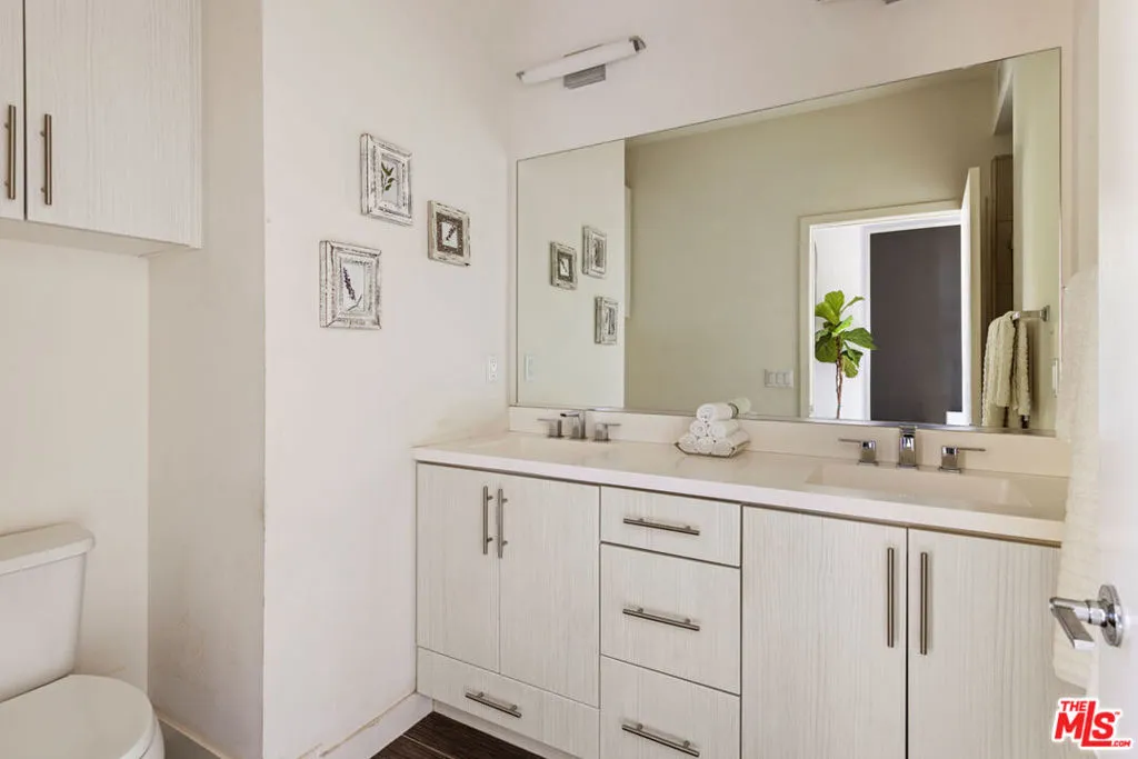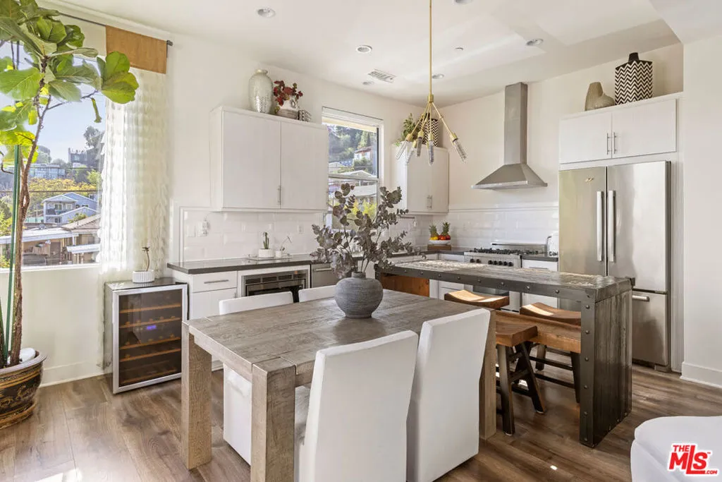 Available for lease, this bright and modern home puts you close to the Reservoir and all the best of Silver Lake. The open layout spans three levels, with hard surface flooring throughout and oversized windows bringing in natural light. On the main level, the kitchen is finished with white cabinetry, quartz counters, a tile backsplash, and a rustic wood island, with easy flow to the living area and an airy balcony. Upstairs find two bright bedrooms, both ensuite; one has a walk-in shower and double vanity, the other a shower/tub combo. The attached two-car garage opens directly to the lower level, where there's a powder room and laundry. A gated front patio provides space to grill, garden, or unwind; amenities include central AC. Tucked away in an intimate community, you're mere moments from Gingergrass, Silver Lake Wine, Botanica, Whole Foods, and the Reservoir.