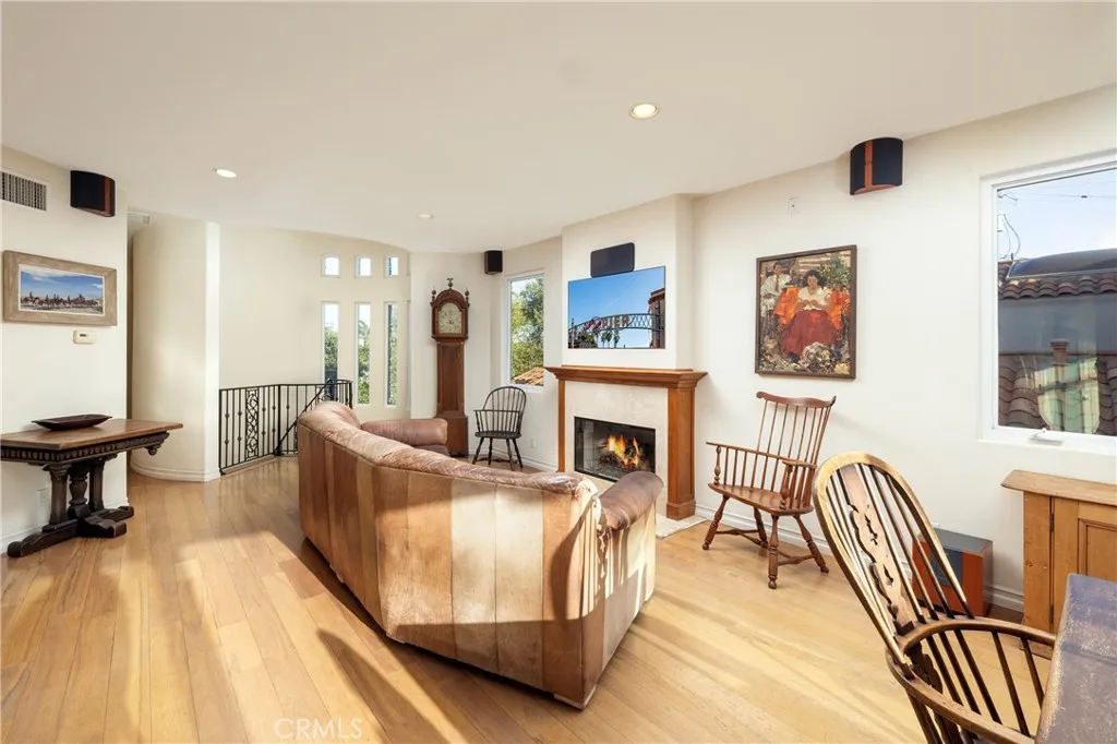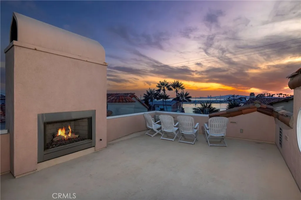 Tucked into Naples Island's coveted Treasure Island, 19 Geneva Walk is a custom built 4 bedroom, 4 bathroom coastal residence with sweeping Bay and Ocean views. The 2003 build features an inverted floorplan that places living spaces upstairs to maximize panoramic sightlines. A Dutch door entry and dramatic rotunda staircase set the tone. The main level offers a comfortable family room, three bedrooms (one with a private en suite bath), and an additional full bathroom. Upstairs, the Great Room features a fireplace, formal dining, and a chef's kitchen with granite counters and stainless appliances, opening to a long balcony with built in BBQ. The primary suite enjoys its own balcony and a two sided fireplace shared with a spa bath featuring soaking tub, dual vanities, and walk in closet. The crown jewel is the rooftop deck with fireplace and unobstructed water views. Steps to the canals, Naples Plaza, Mother's Beach, and 2nd Street.