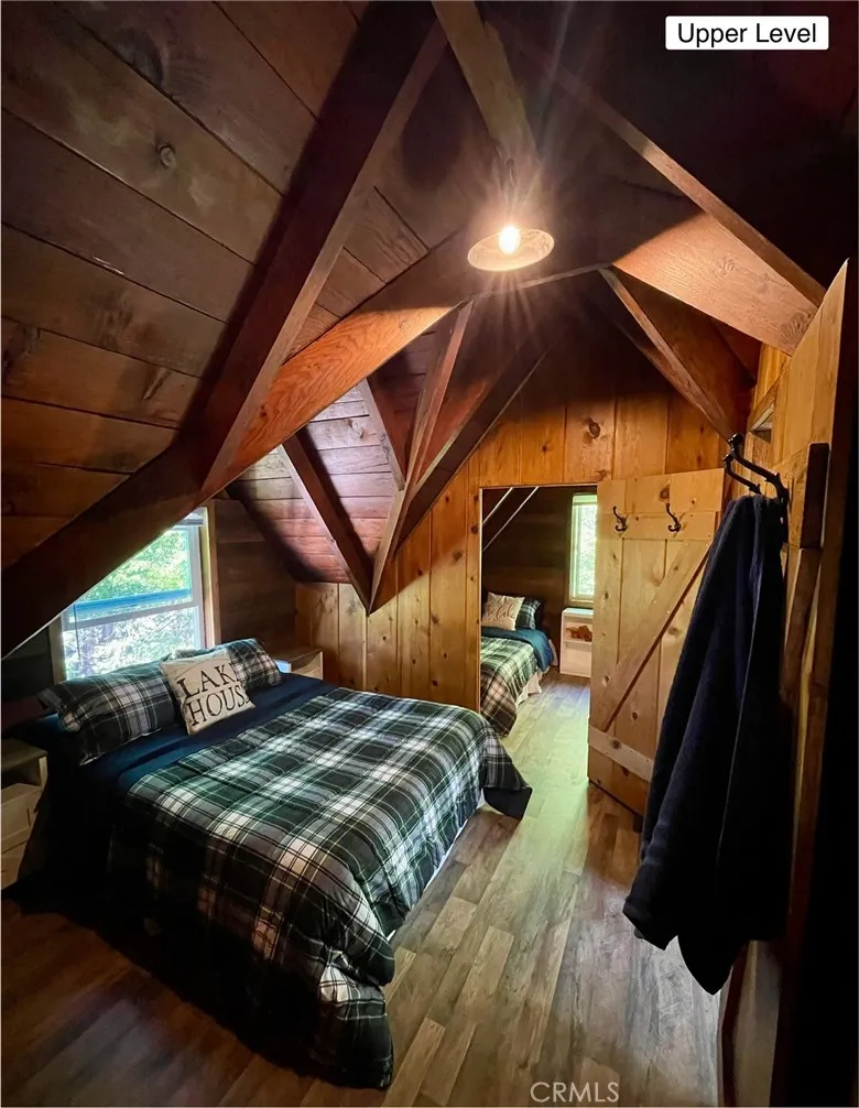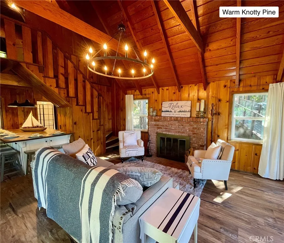 Vintage Feel, Modern Living. This hideaway is tucked just below Lake Arrowhead’s quiet Hillside Road. Among beautiful dogwood trees & towering pines, this newly renovated 1938 cabin blends the charm of a 1930s retreat with the comforts of a modern home. Easy access with bedroom on the main, ramp to the front door and street level parking pad. Just a short walk to Burnt Mill Beach and the newly updated Village, with its shops, restaurants, and summer concerts. Relax on the wrap-around deck and listen to the birds sing, church bells ring and the ducks chatting on the lake. Practically everything in this cabin has been updated—from plumbing to appliances to exterior siding to high efficiency heater—while still preserving its golden-age charm. The cabin has been thoughtfully remodeled to create a warm, open feel, featuring vaulted beamed ceilings, the original brick fireplace, and classic knotty pine T&G walls and ceilings. A large butcher block island separates the living room from a beautifully updated kitchen, along with a bedroom and bathroom with shower and laundry. Upstairs the warmth continues from the loft bedroom to a cozy side bedroom, and a bathroom with bathtub. New shuttered dual-pane windows and upgraded insulation keep the cabin warm and cozy on snowy winter days. Room for a workshop & storage under the house. Dock by Peninsula Park available for additional $$$. FULL LAKE RIGHTS.
