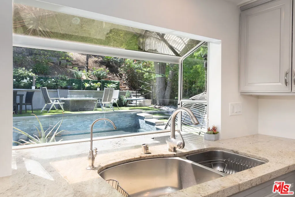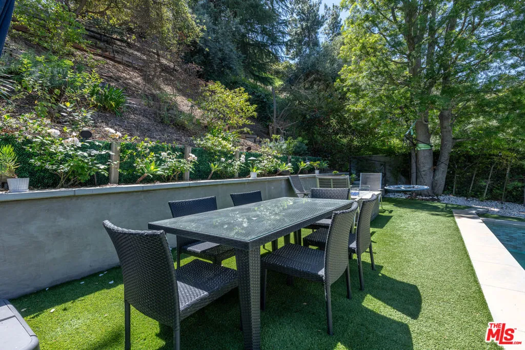 Experience the tranquil "Santa Monica Canyon" lifestyle in the heart of the Encino Hills with this stunningly remodeled and expanded contemporary home, perfectly positioned at the end of a quiet cul-de-sac just minutes from Mulholland Drive. A striking ridge-glass double-door entry reveals a dramatic, skylit living room anchored by a vaulted ceiling and a slate-faced fireplace, while natural-toned oak floors lead you into an expansive gourmet kitchen featuring granite counters, stainless steel appliances, and a sun-drenched breakfast room with sliding French doors. The main level also offers a cozy family/media room with extensive built-ins and a nearby guest bedroom or home office, while the upstairs serves as a private retreat with two additional bedrooms and a spacious master suite boasting serene treetop views and a light-infused marble bath complete with a spa tub, rain shower, and custom walk-in closet. Outside, the lush grounds include a tranquil side yard and a backyard oasis with a slate-tiled pergola shaded outdoor dining pavilion and kitchen/BBQ center overlooking a refreshing plunge pool and spa. For ultimate relaxation, a meandering hillside path ascends to a meditation pergola, offering breathtaking views of the mountains and valley lights, all while providing excellent Westside access and placement within the sought-after Lanai Road Charter Elementary School district.